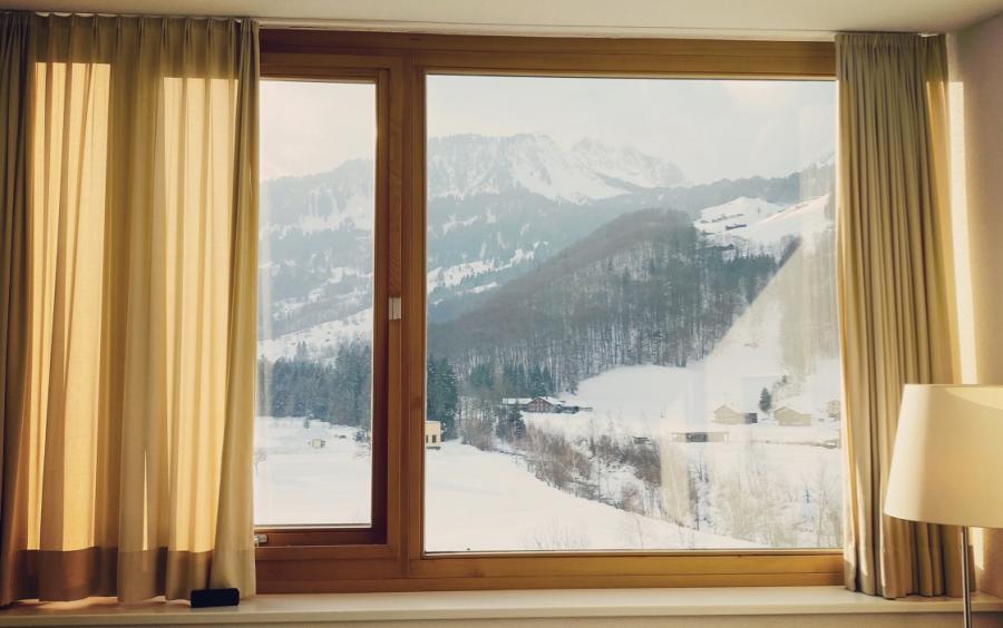 Das Schöne am zurückkehren ist ja, dass man sich irgendwie sofort angekommen fühlt: Man kennt sich aus, macht scheinbar nahtlos da weiter, wo man das letzte Mal aufgehört hat. Und so beziehen wir auch dieses Mal wieder ein lichtdurchflutetes Komfortzimmer mit Blick auf die Berge und die Kanisfluh im Speziellen. Zwischenzeitlich hat das Zimmer (statt einem Teppich) einen schönen (allergikerfreundlichen) Holzboden erhalten. Was ich wirklich mag an diesen Zimmern (und auf meinen Fotos gar nicht so gut herauskommt), ist deren Geräumigkeit - hier hat man wirklich genug Platz, nicht nur für die umfangreiche Skikleidung, sondern zum wohnen und atmen. Und ich habe "meinen" Panoramblick wieder, der mich, auch dieses Mal, immer wieder flasht, wenn ich das Zimmer betrete.