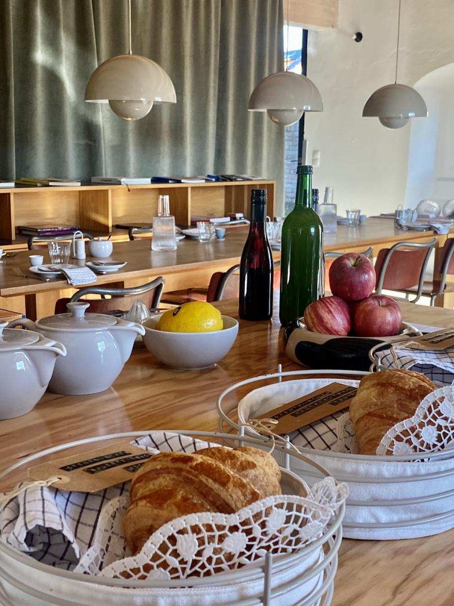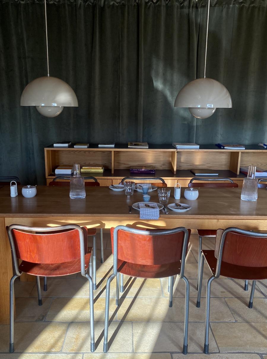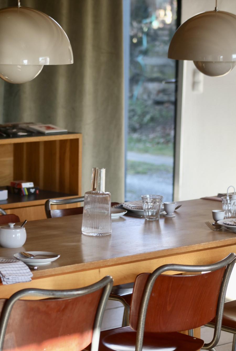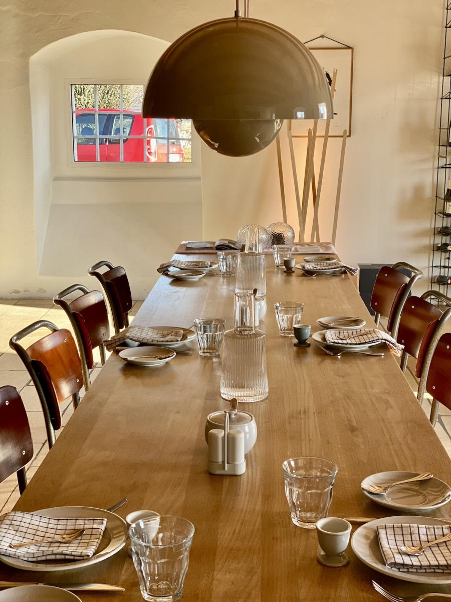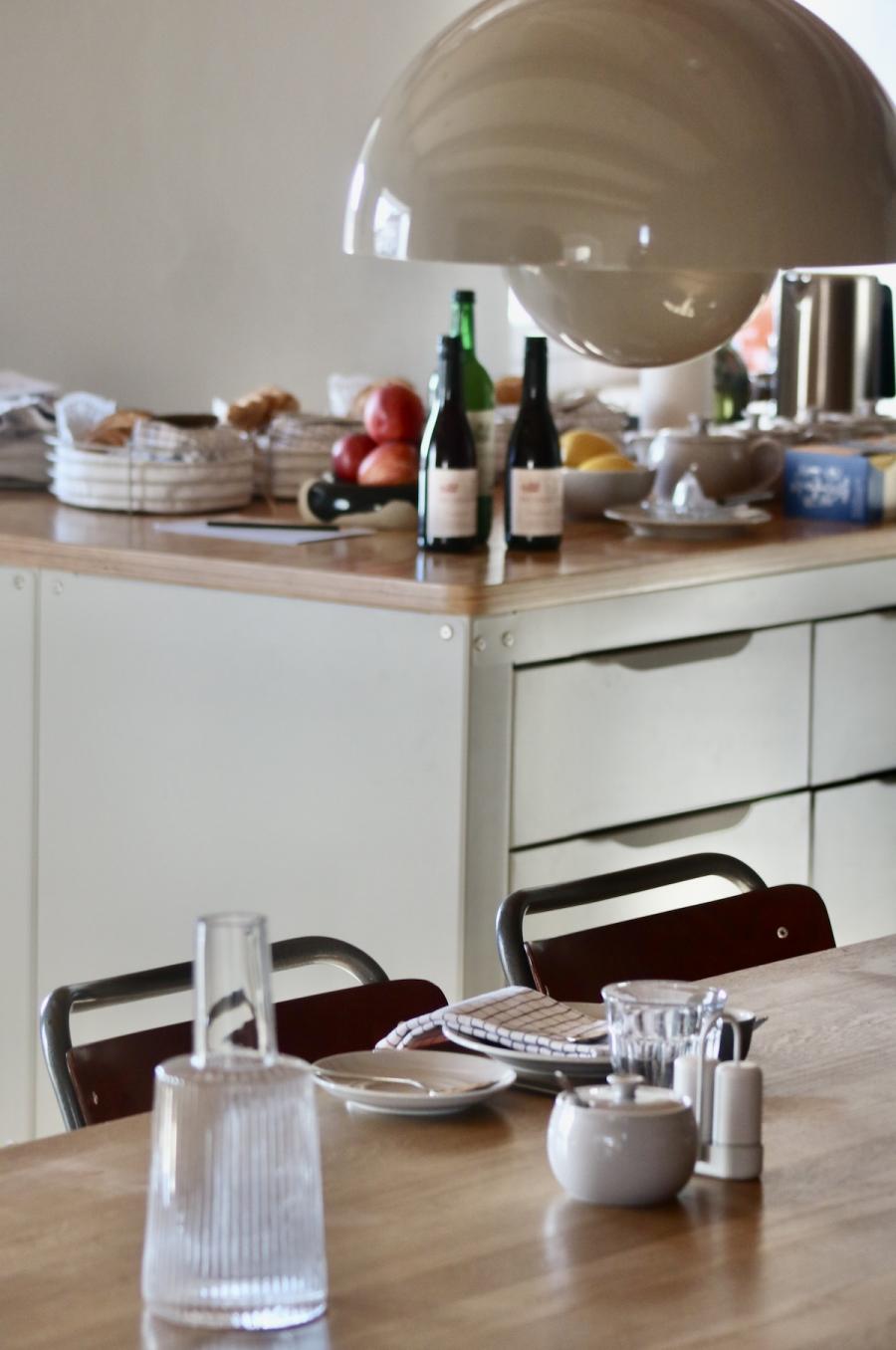 Frühstück! Das steht im sogenannten Studio Space im Erdgeschoss, in der offenen Küche in hübschen Holzkistchen im Kühlschrank (der „breakfast bar“) schon bereit. Frühstücken kann man hier ab 8 Uhr, am langen Gemeinschaftstisch, über dem sich die Flowerpot-Lampen von Verner Panton in Position bringen. Ein weiterer Designklassiker aus den 60er-Jahren, verspielt und dennoch minimalistisch, dänisches Nachkriegsdesign, und ja, falls ich es noch nicht gesagt habe, auch die Dänen können halt einfach Design. Und in diesen hellen, großzügig gestalteten Raum mit den schönen Holzbalken an den Decken passen sie perfekt.