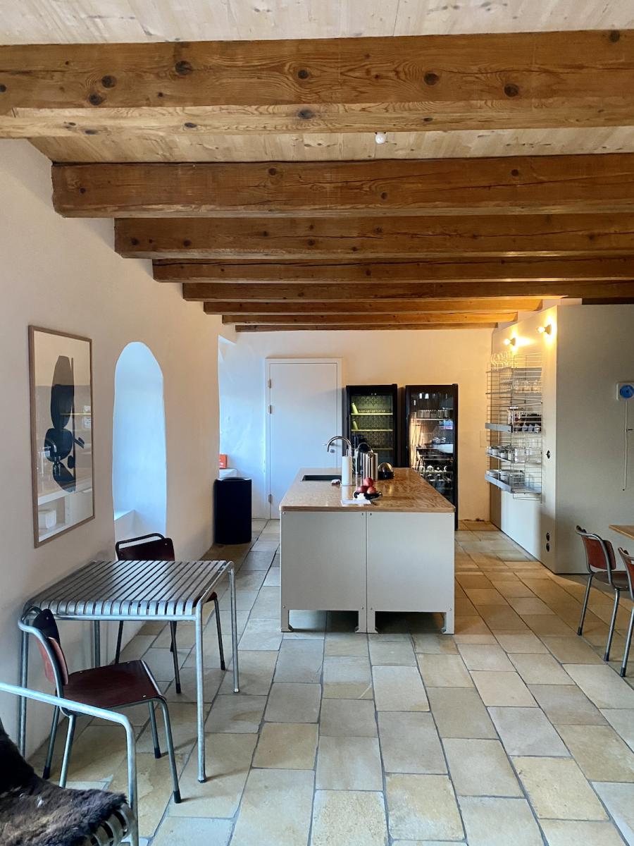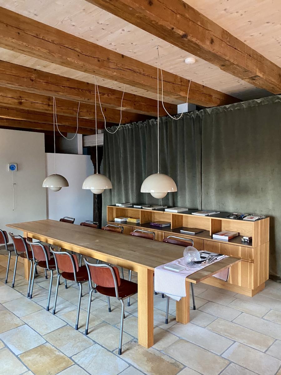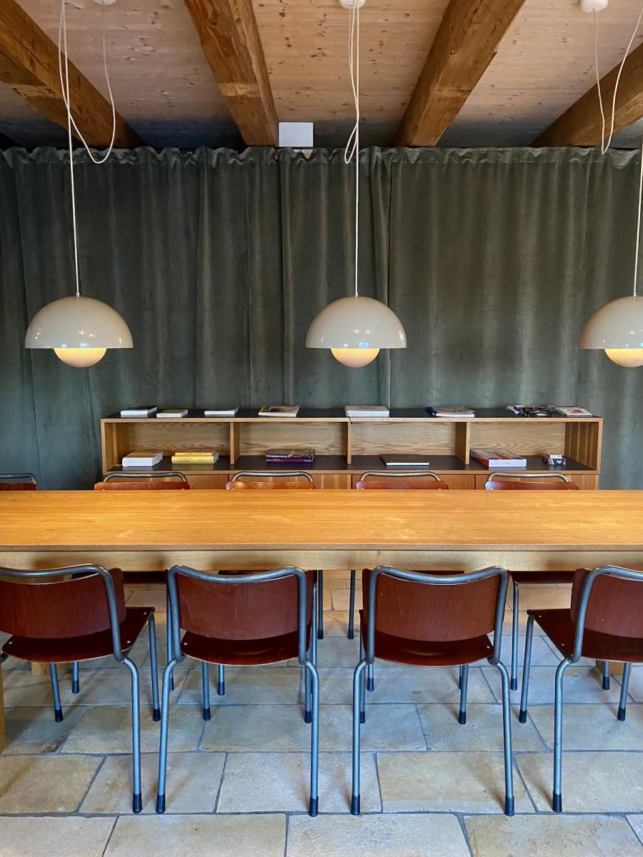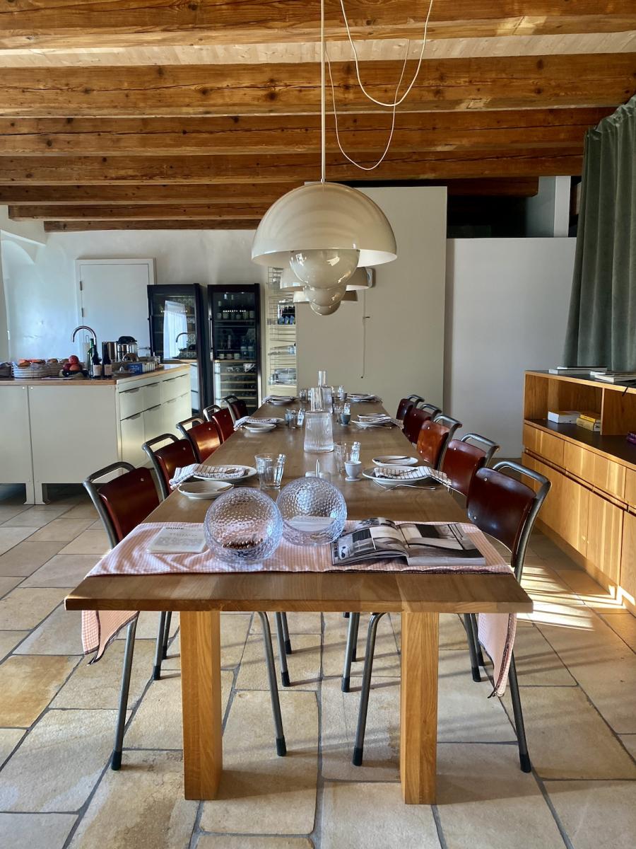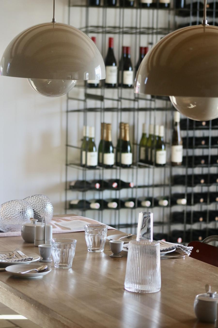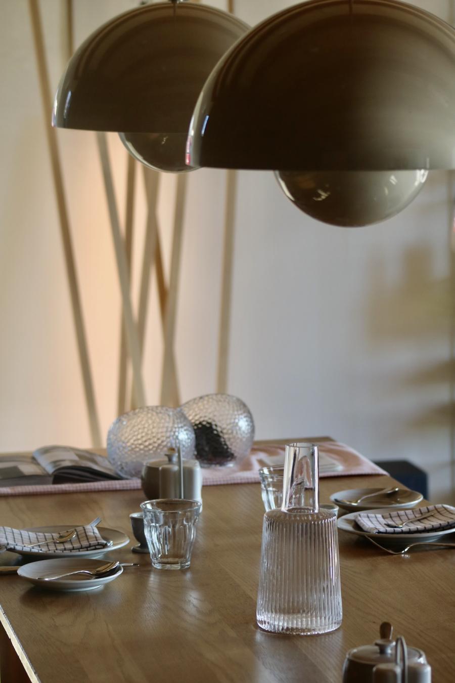 Frühstück! Das steht im sogenannten Studio Space im Erdgeschoss, in der offenen Küche in hübschen Holzkistchen im Kühlschrank (der „breakfast bar“) schon bereit. Frühstücken kann man hier ab 8 Uhr, am langen Gemeinschaftstisch, über dem sich die Flowerpot-Lampen von Verner Panton in Position bringen. Ein weiterer Designklassiker aus den 60er-Jahren, verspielt und dennoch minimalistisch, dänisches Nachkriegsdesign, und ja, falls ich es noch nicht gesagt habe, auch die Dänen können halt einfach Design. Und in diesen hellen, großzügig gestalteten Raum mit den schönen Holzbalken an den Decken passen sie perfekt.