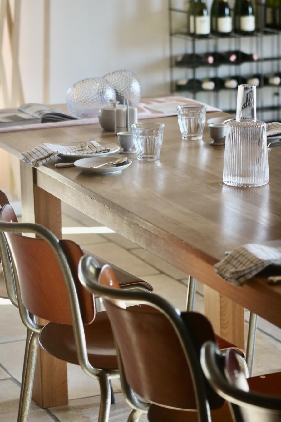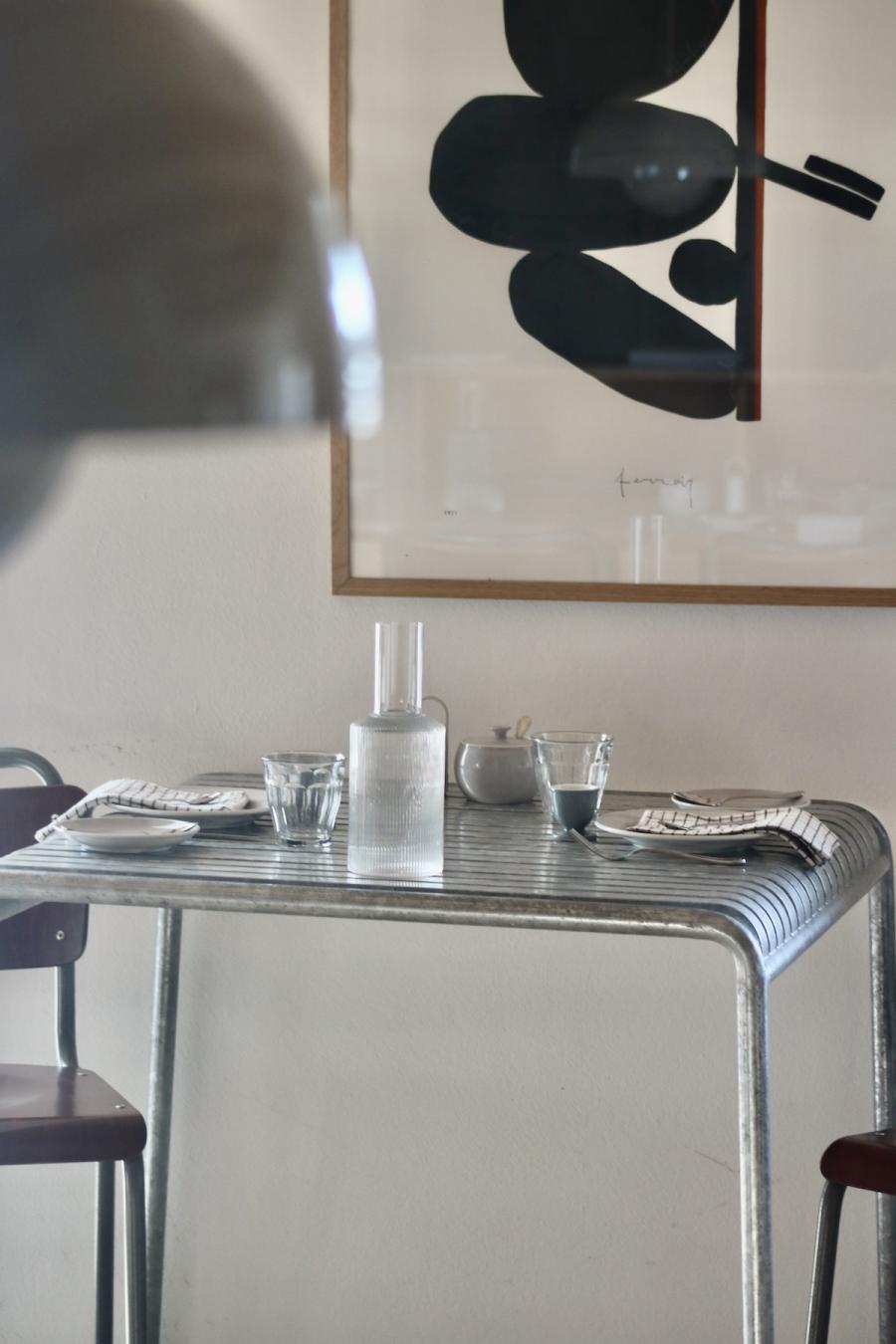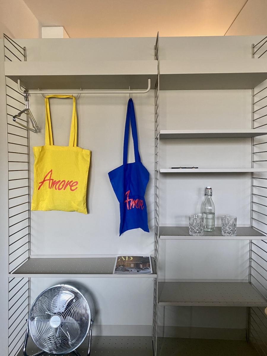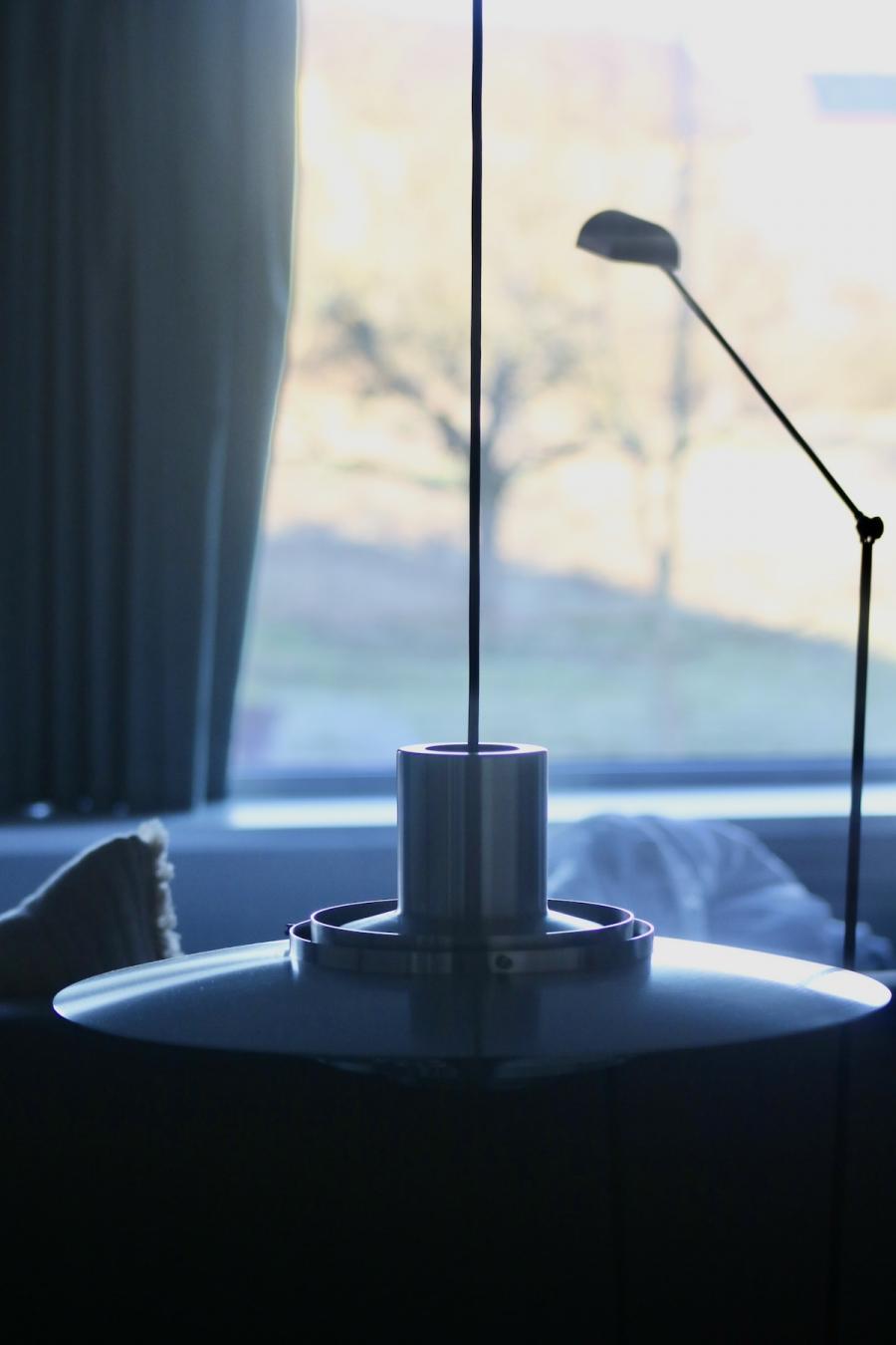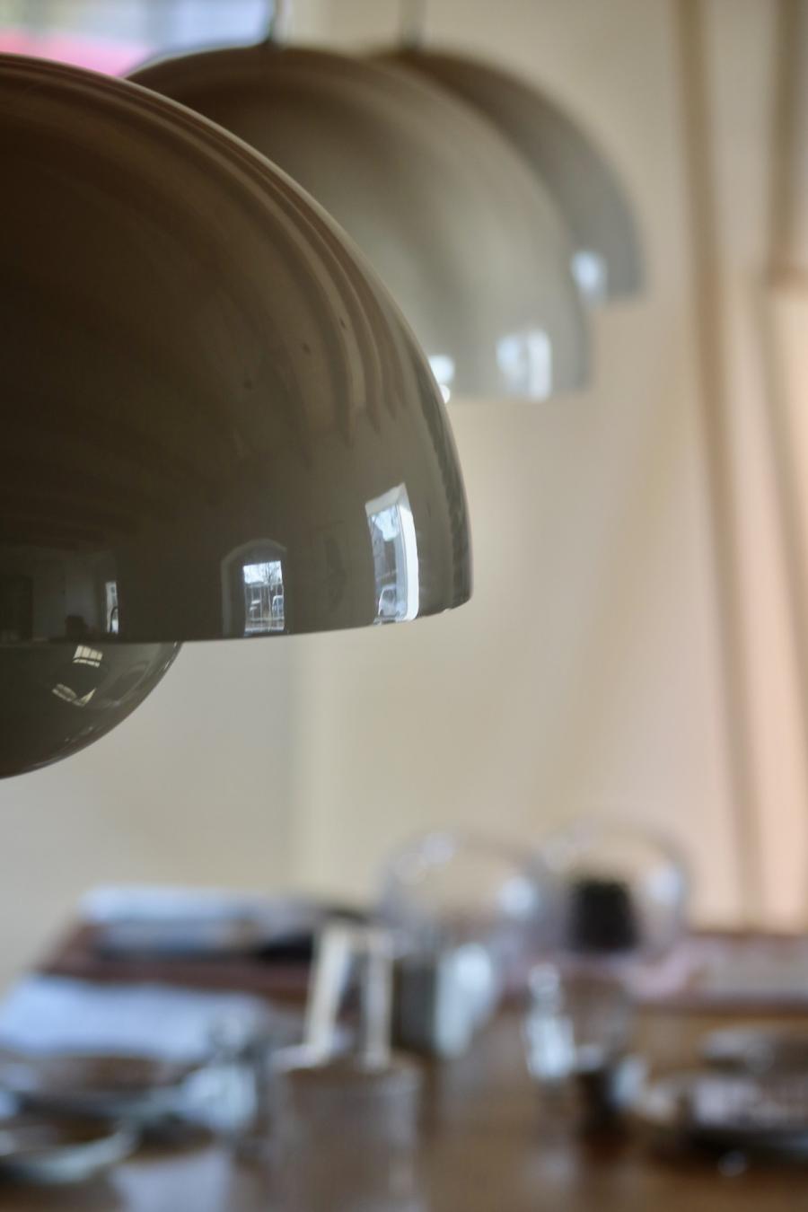 Frühstück! Das steht im sogenannten Studio Space im Erdgeschoss, in der offenen Küche in hübschen Holzkistchen im Kühlschrank (der „breakfast bar“) schon bereit. Frühstücken kann man hier ab 8 Uhr, am langen Gemeinschaftstisch, über dem sich die Flowerpot-Lampen von Verner Panton in Position bringen. Ein weiterer Designklassiker aus den 60er-Jahren, verspielt und dennoch minimalistisch, dänisches Nachkriegsdesign, und ja, falls ich es noch nicht gesagt habe, auch die Dänen können halt einfach Design. Und in diesen hellen, großzügig gestalteten Raum mit den schönen Holzbalken an den Decken passen sie perfekt.