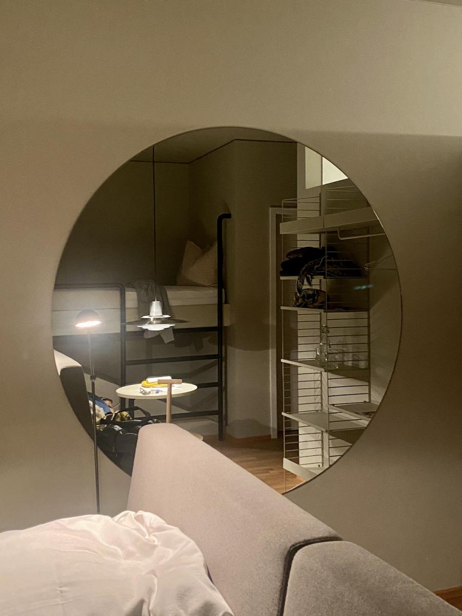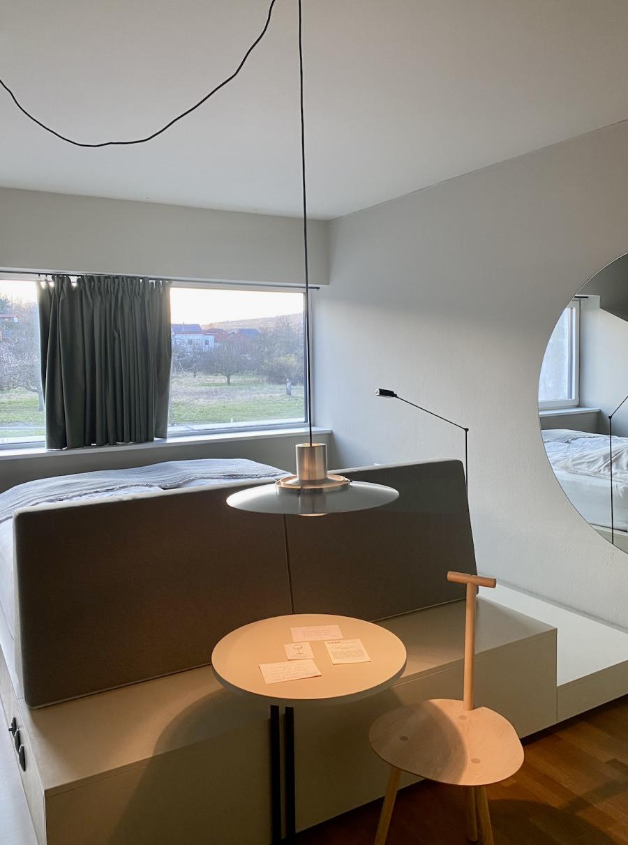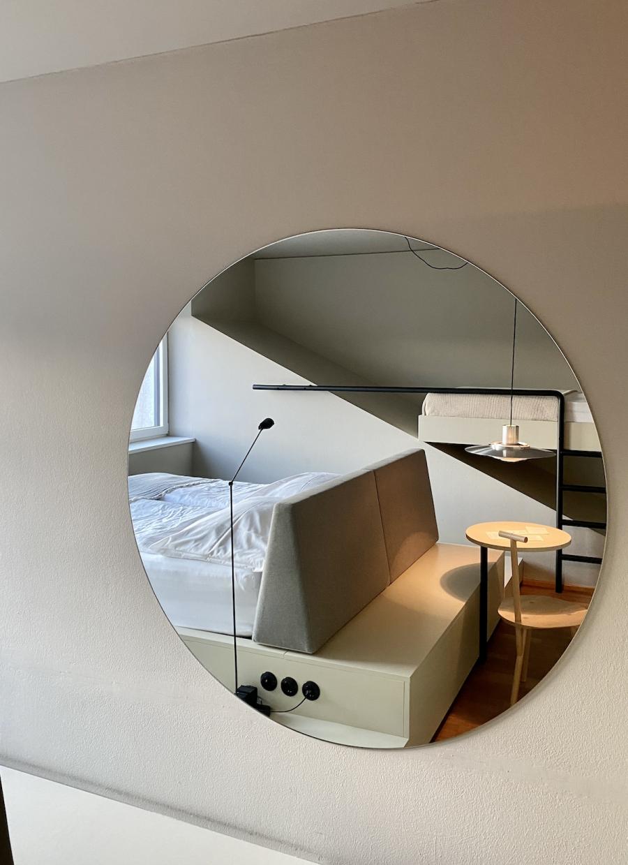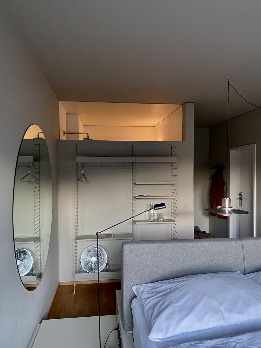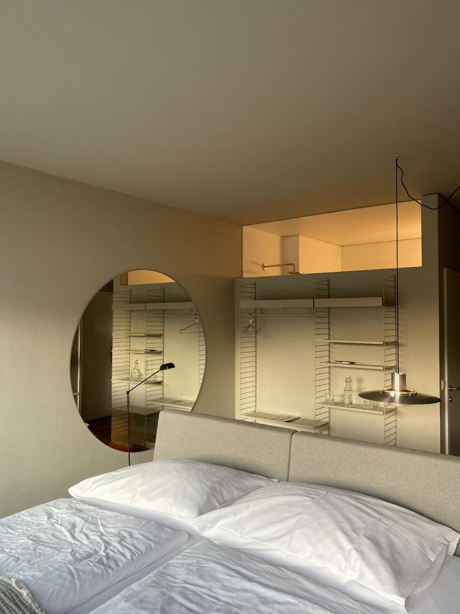Altes Haus, frisches Design: Das hat unser Zimmer auf den Punkt gebracht. Was wir hier vorfinden: Ein großzügiges Bett, auf einem Podium platziert, alles farblich monochrom gehalten, sehr reduziert, aber alles da, was man braucht, dazu ein großer runder Wandspiegel, der das Design-Geschehen perfekt in Szene setzt. Auf Anhieb verliebe ich mich wieder mal in das String System von Nisse und Kajsa Strinning: Zeitlos, obwohl bereits 1949 von den beiden Architekt:innen entworfen. Schönes, schlichtes Design gepaart mit Funktion – das können sie halt in Skandinavien. Gleich ins Auge sticht auch die Pendelleuchte P376 KF1, von Preben Juhl Fabricius und Jørgen Kastholm für &Tradition entwickelt, ebenfalls schon ein Design-Klassiker, aus dem Jahr 1963. Schönes Detail der sehr skulpturell anmutenden Leuchte: Das Licht breitet sich in zwei Richtungen aus – ein schöner Lichtausfall nach unten und eine sanfte Stimmung nach oben. Und dann fällt mein Blick auf den Spade Chair von Faye Toogood für Please Wait To Be Seated: Ziemlich minimalistisch kommt er daher und stellt, wie ich nachlese, eine Mischung aus einem klassischen Melkschemel und einem Schaufelstiel dar. Inspiriert wurde die Designerin vom englischen Landleben ihrer Kindheit. Bequem, so ehrlich muss ich sein, finde ich ihn nicht, aber: Er zwingt mich in der Sekunde aufrecht zu sitzen, allein dafür gebührt ihm also schon Anerkennung.
