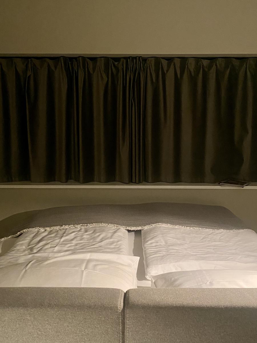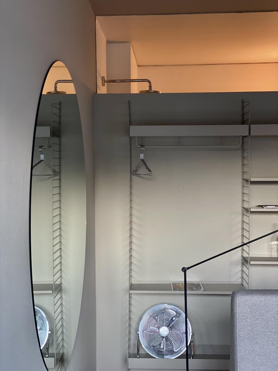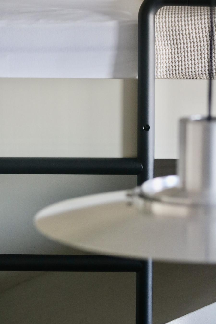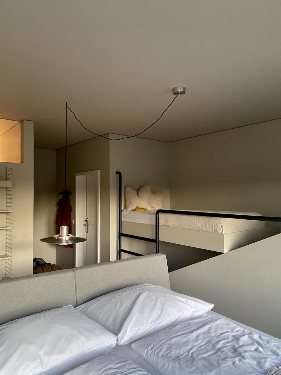 Altes Haus, frisches Design: Das hat unser Zimmer auf den Punkt gebracht. Was wir hier vorfinden: Ein großzügiges Bett, auf einem Podium platziert, alles farblich monochrom gehalten, sehr reduziert, aber alles da, was man braucht, dazu ein großer runder Wandspiegel, der das Design-Geschehen perfekt in Szene setzt. Auf Anhieb verliebe ich mich wieder mal in das String System von Nisse und Kajsa Strinning: Zeitlos, obwohl bereits 1949 von den beiden Architekt:innen entworfen. Schönes, schlichtes Design gepaart mit Funktion – das können sie halt in Skandinavien. Gleich ins Auge sticht auch die Pendelleuchte P376 KF1, von Preben Juhl Fabricius und Jørgen Kastholm für &Tradition entwickelt, ebenfalls schon ein Design-Klassiker, aus dem Jahr 1963. Schönes Detail der sehr skulpturell anmutenden Leuchte: Das Licht breitet sich in zwei Richtungen aus – ein schöner Lichtausfall nach unten und eine sanfte Stimmung nach oben. Und dann fällt mein Blick auf den Spade Chair von Faye Toogood für Please Wait To Be Seated: Ziemlich minimalistisch kommt er daher und stellt, wie ich nachlese, eine Mischung aus einem klassischen Melkschemel und einem Schaufelstiel dar. Inspiriert wurde die Designerin vom englischen Landleben ihrer Kindheit. Bequem, so ehrlich muss ich sein, finde ich ihn nicht, aber: Er zwingt mich in der Sekunde aufrecht zu sitzen, allein dafür gebührt ihm also schon Anerkennung.