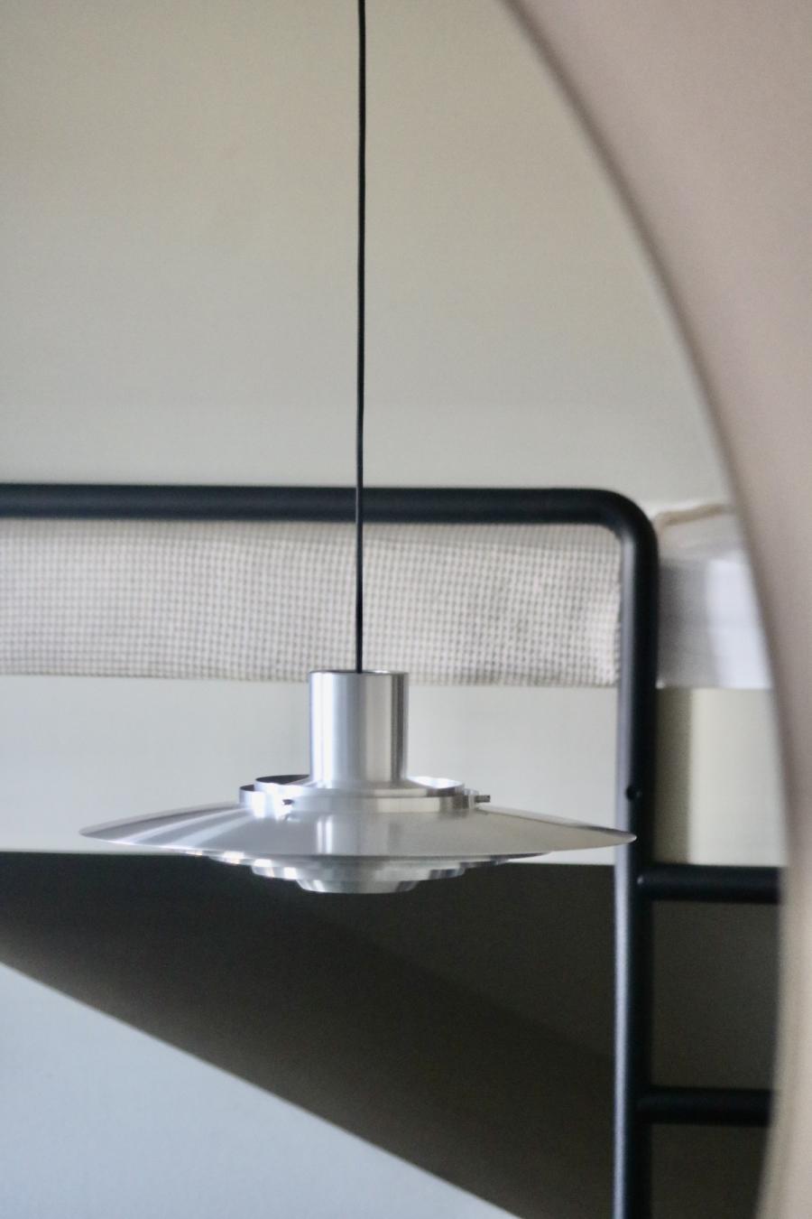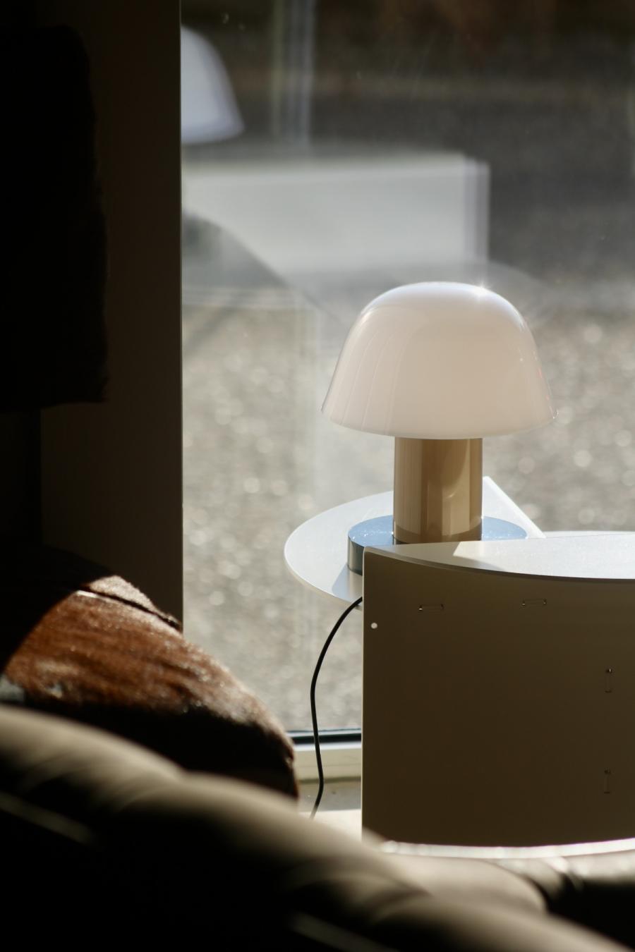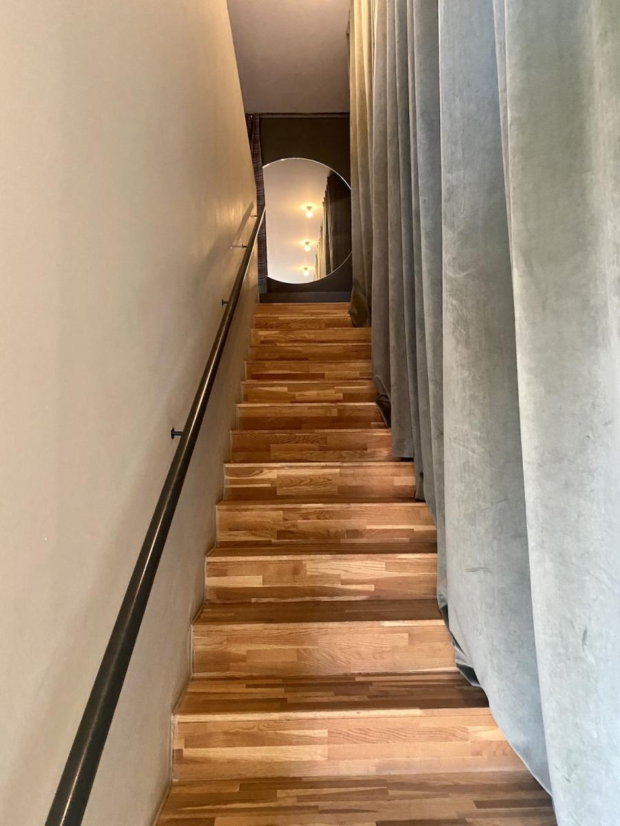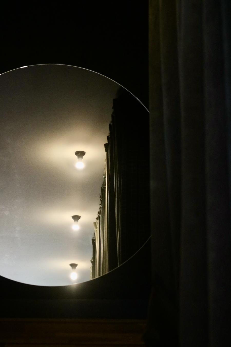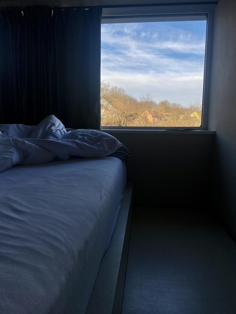 Altes Haus, frisches Design: Das hat unser Zimmer auf den Punkt gebracht. Was wir hier vorfinden: Ein großzügiges Bett, auf einem Podium platziert, alles farblich monochrom gehalten, sehr reduziert, aber alles da, was man braucht, dazu ein großer runder Wandspiegel, der das Design-Geschehen perfekt in Szene setzt. Auf Anhieb verliebe ich mich wieder mal in das String System von Nisse und Kajsa Strinning: Zeitlos, obwohl bereits 1949 von den beiden Architekt:innen entworfen. Schönes, schlichtes Design gepaart mit Funktion – das können sie halt in Skandinavien. Gleich ins Auge sticht auch die Pendelleuchte P376 KF1, von Preben Juhl Fabricius und Jørgen Kastholm für &Tradition entwickelt, ebenfalls schon ein Design-Klassiker, aus dem Jahr 1963. Schönes Detail der sehr skulpturell anmutenden Leuchte: Das Licht breitet sich in zwei Richtungen aus – ein schöner Lichtausfall nach unten und eine sanfte Stimmung nach oben. Und dann fällt mein Blick auf den Spade Chair von Faye Toogood für Please Wait To Be Seated: Ziemlich minimalistisch kommt er daher und stellt, wie ich nachlese, eine Mischung aus einem klassischen Melkschemel und einem Schaufelstiel dar. Inspiriert wurde die Designerin vom englischen Landleben ihrer Kindheit. Bequem, so ehrlich muss ich sein, finde ich ihn nicht, aber: Er zwingt mich in der Sekunde aufrecht zu sitzen, allein dafür gebührt ihm also schon Anerkennung.
