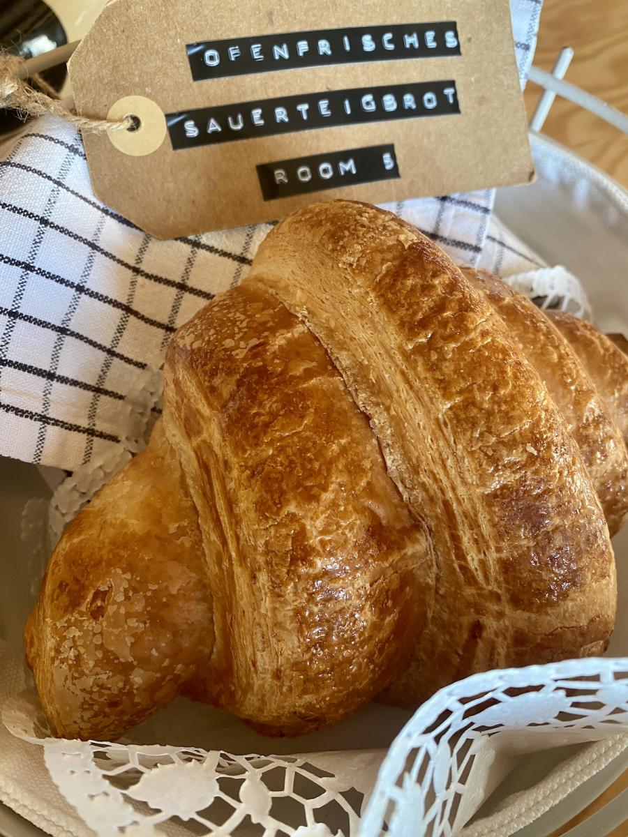 Es ist alles liebevoll vorbereitet: Das Körbchen mit dem selbst gemachten Sauerteigbrot (köstlich! Und diese knusprige Rinde!), dem überdimensionalen Croissant, Schinken, Käse und Aufstrich, Butter („Die schmeckt halt richtig gut nach Land, viel intensiver“, O-Ton, Ehemann), Eier, Joghurt und Müsli. Nicht zu vergessen die gute Marillenmarmelade (schließlich liegt die für ihre Marillen berühmte Wachau nur um`s Eck), die so fruchtig und dennoch nicht so furchtbar süß wie so manche gekaufte Marmelade schmeckt. Wir genießen also, blättern dabei ein bisschen durch die Weekender-Magazine vom Sideboard, die Sonne schiebt sich durch die Fenster zwischen den dicken Mauern und legt sich frühlingshell in den Raum. Ein richtig guter Start ins Wochenende…