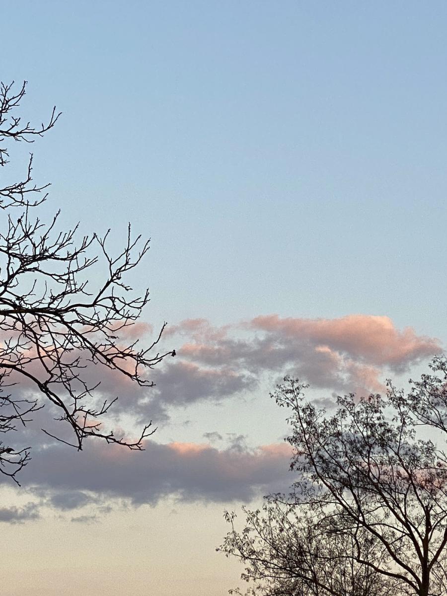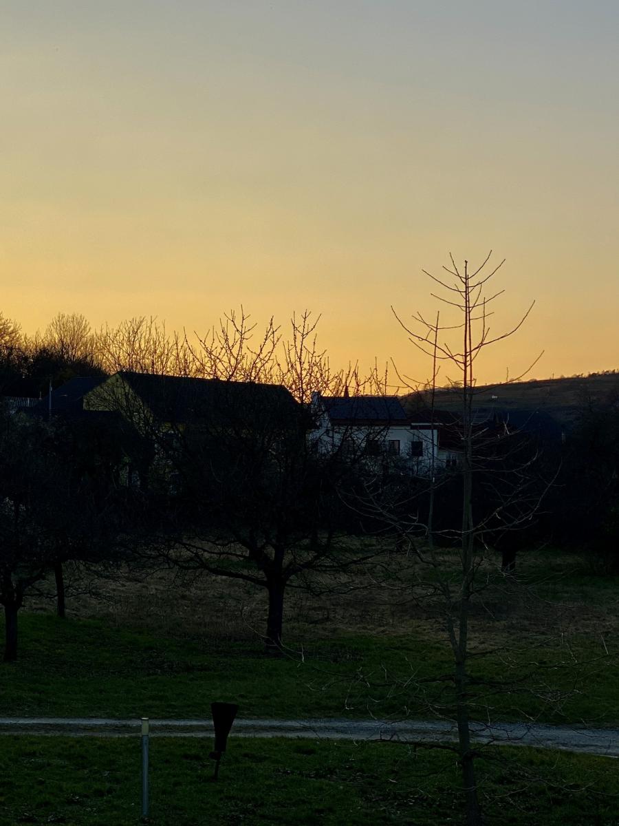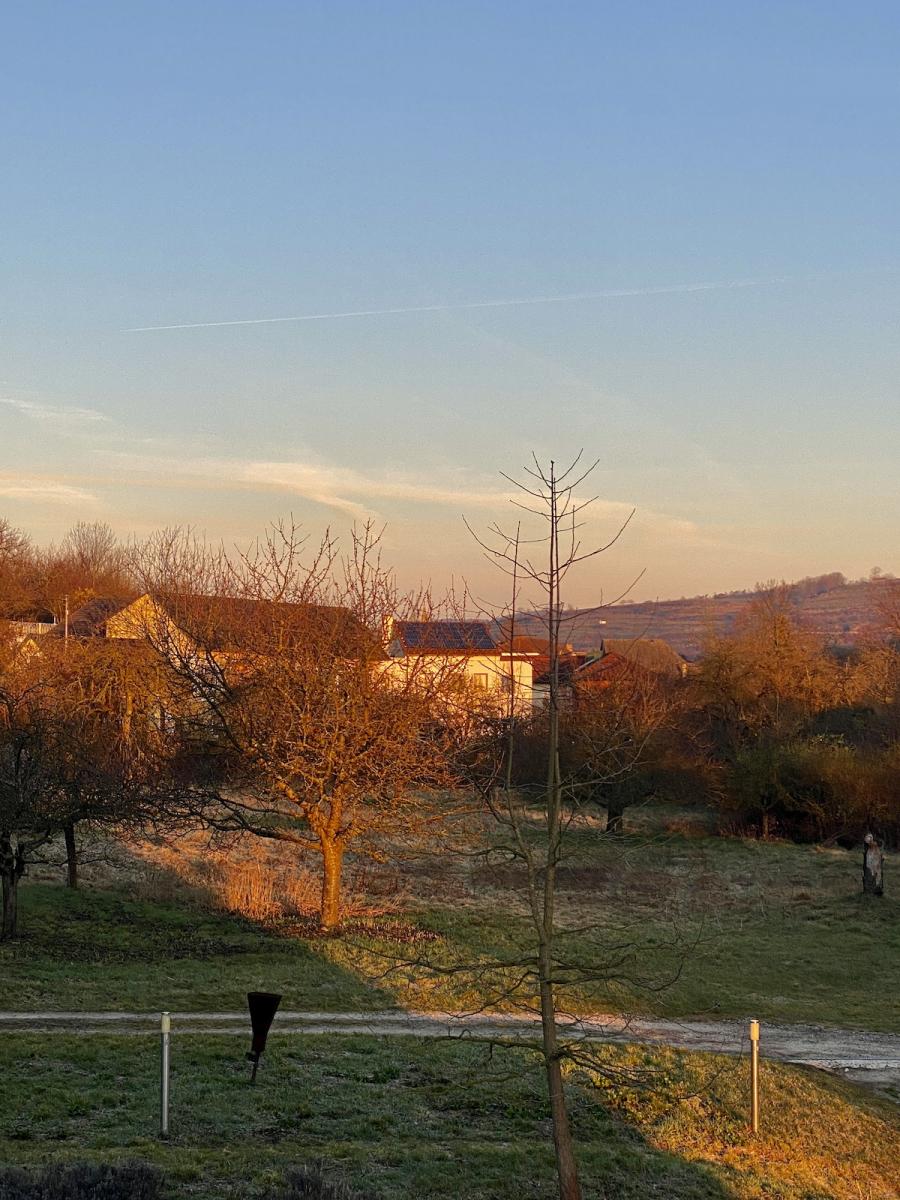 Es ist ein früher Märzabend und uns empfängt ein frühlingszarter, pastellrosa Abendhimmel. Den Himmel sehen wir übrigens auch von unserem Zimmer aus und zwar in voller Breite. Nehmt doch das Garden View Zimmer, hatte mir Victoria geschrieben, da habt ihr einen besonders schönen Ausblick, vor allem am Morgen, bei Sonnenaufgang. Na den werde ich wohl fix verschlafen, wie ich mich kenne – gebucht wurde es trotzdem. Der Ausblick aus Zimmer Nr. 5 hält sein Versprechen jedenfalls auch am frühen Abend: Denn da legt sich ein wunderbares, honiggelbes Abendlicht auf die Wiesen, Bäume, Hausdächer und Weinhänge.
