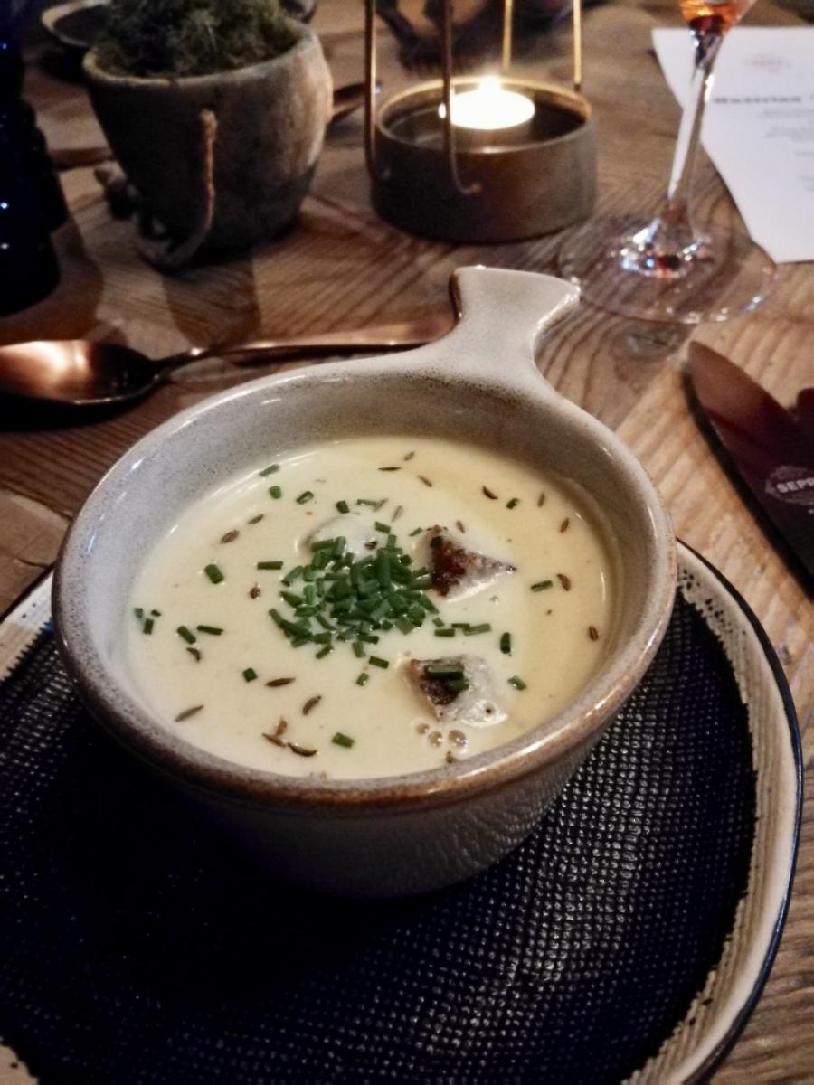 Auch abends wird hier – am großzügig ausgebauten Dachboden des Hotels im dritten Stock, wo sich auch die Rezeption befindet – in der offenen Showküche Gutes fabriziert; wir haben uns für das "Austrian Dinner" in 4 Gängen am Samstagabend entschieden, das individuell gebucht werden kann und uns absolut überzeugt hat. Andere Abende, andere Themen – von nepalesisch über "Sushi meets Pastry" bis hin zu "Dolce Vita", vermutlich ist hier für jeden mal was dabei. Wer à la carte essen will, der kann übrigens für den gesamten Aufenthalt zu einem geringen Aufpreis die Halbpension zubuchen, im Stammhaus Hotel Eder im Ortszentrum, das in Gehnähe liegt (ca. 8 min. zu Fuß, vorbei an der nachts malerisch beleuchteten Ortskirche von Maria Alm). Ebenfalls ausprobiert – zumal Freunde im Hotel Eder wohnten – und auch dort kann man essenstechnisch nichts falsch machen, ganz im Gegenteil.