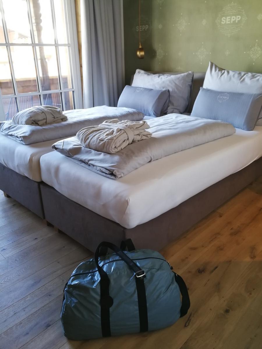 "Unaufgeregt ist das hier...", sagt mein Mann an Tag 2 unseres Aufenthalts. Und das trifft den Nagel auf den Kopf. Lässig, aber nicht übertrieben ist der Style des Hotels, locker, aber nicht anstrengend lässig präsentieren sich die Mitarbeiterinnen und Mitarbeiter des Hauses. Das Willkommen ist herzlich, wir fühlen uns schnell angekommen – und vor allem wohl. Das fällt einem in diesem Ambiente aber natürlich auch nicht sonderlich schwer: Wir bewohnen ein Zimmer der Kategorie "Sporty", was den großen Vorteil hat, dass auch tatsächlich Platz genug für unsere Sportutensilien vorhanden ist. Auch unseren persönlichen kleinen Skistall haben wir im Eingangsbereich des Zimmers, sogar mit einem Skischuh-Wärmer, yeah. Nach kürzester Zeit lagern hier dann auch zwei Paar Langlaufski, zwei Paar Alpinski und Tonnen von Sportfunktionskleidung. Wer sich im Sommer bei einem Mountainbike-Urlaub von seinem teuren Schätzchen nicht trennen will, kann es übrigens auch hier aufbewahren, dank der praktischen Hänge-Vorrichtungen sogar schwebend. Auch der Rest des Zimmers gefällt: Ein großartiges Bett, wie sich nach der ersten Nacht herausstellen wird (unsere Bandscheiben sagen laut Danke schön!), qualitativ hochwertige Bettwäsche – und blickdichte Vorhänge, die uns dank des damit maximalen nächtlichen Melatonin-Ausstosses in der Früh herrlich erholt aufwachen lassen. Nur ein kleiner Wunsch tut sich hier auf: Noch ein bisschen mehr Licht am Kopfende des Bettes hätte ich mir als passionierte Leserin gewünscht...