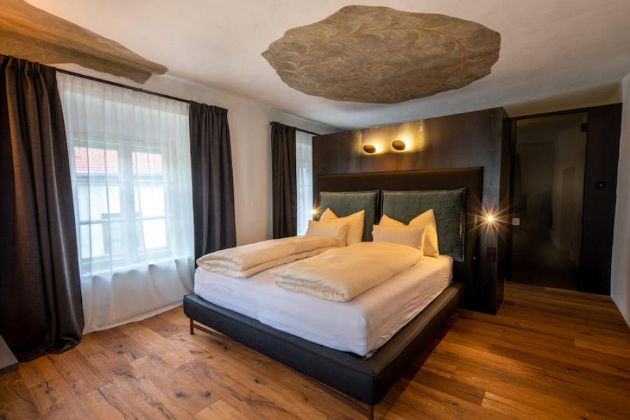 Besonders wichtig war Thomas Ortler, die historische Substanz des Hauses bei der Restaurierung und der Gestaltung der Räume so gut wie möglich einzubinden. Und so kann man z.B. in der Suite 1799 ein Deckenfresko aus dem 17. Jahrhundert bewundern. Auch in der großzügigen zweistöckigen Suite ist die Geschichte des Hauses nicht zu übersehen, schließlich wohnt man hier zwischen den originalen Mauern aus dem 13. Jahrhundert.