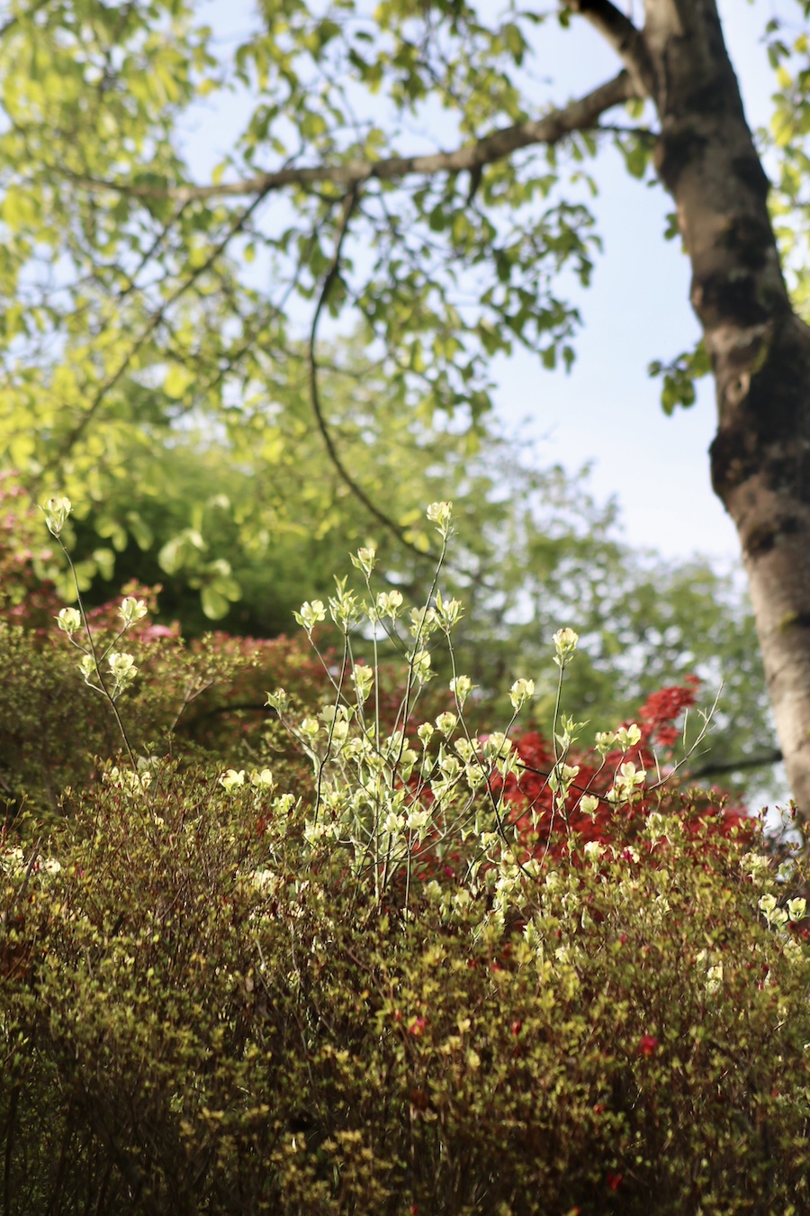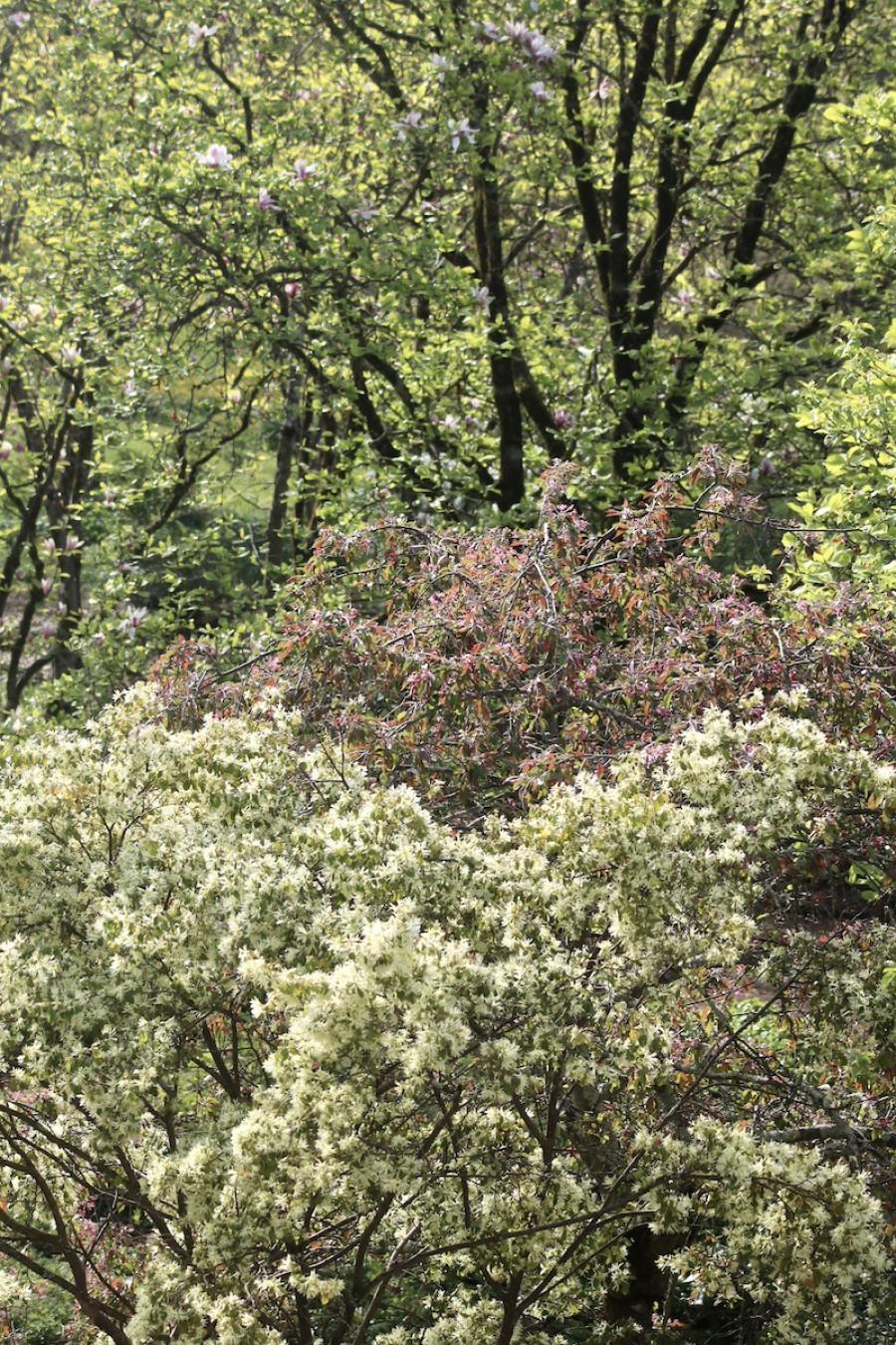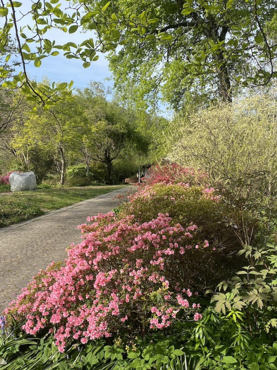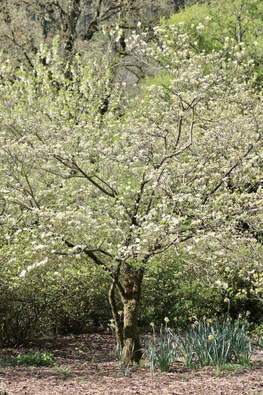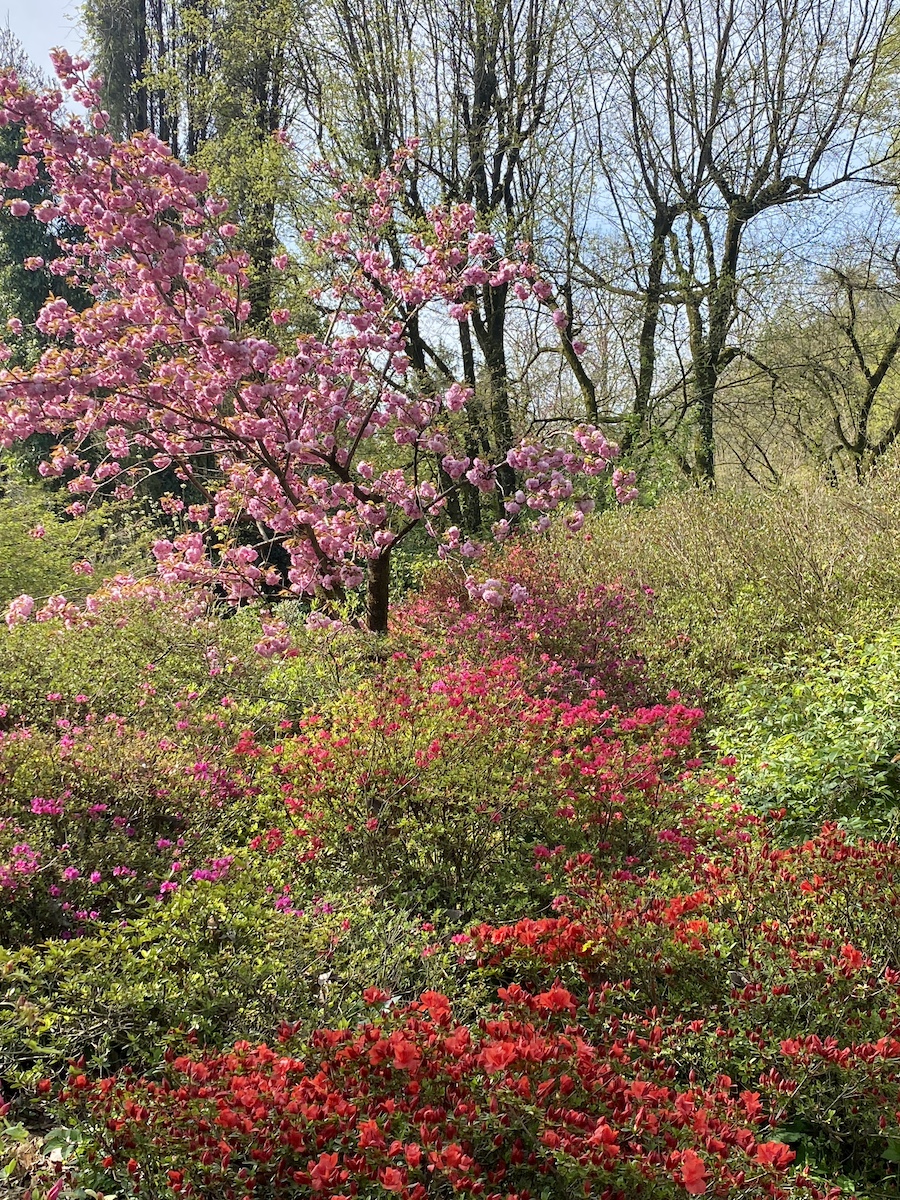 Wir starten unseren geführten Rundgang auf der obersten Ebene, wo auch das Haus steht, das Viatori damals errichtete, und in dem sich heute ein kleines Informationszentrum befindet, indem auch auf dem digitalen Weg viel über den Garten, aber auch das gesamte umliegende Gebiet und Naturschutzthemen erfahren kann. Was mir rund um das Haus gleich auffällt: Die Tulpen sind zum Großteil bereits am Verblühen, zu Hause in Wien sind sie zu diesem Zeitpunkt, Anfang April, noch nicht einmal ansatzweise erblüht. Wir hören, dass im Laufe der Jahre rund 500 Azaleenarten angepflanzt wurden, und das, obwohl der hiesige Boden dafür nicht geeignet ist. Nachgeholfen wurde daher in den Azaleenbeeten mit Sägespänen, die man sich in Sägewerken in der Umgebung besorgt hat, und mit Kompostmaterial – die Azaleen scheint es jedenfalls überzeugt zu haben. Denn sie wuchern geradezu und leuchten in den unglaublichsten Farben. Viatori experimentierte mit Böden, Mikroklima und Gestaltung und erschuf so seine eigene botanische Welt. In welcher z. B. auch der Albero di San Bartolomeo Platz gefunden: Noch steht die chinesische Kräuselmyrthe mit nackt anmutenden, glatten, zimtfarbenen Stämmen da. Ihre Rinde löst sich über den Herbst von selbst ab, spätestens im Juli wird sie in Pink, Rot, Weiß oder Violett blühen. Was mich ebenfalls begeistert: Der Nuttalls Blüten-Hartriegel, mit wunderschönen weißen Blüten, die schon fast wächsern-artifiziell aussehen – ein Baum, den ich hier zum ersten Mal in meinem Leben sehe. Was für eine unglaublich schöne Pflanze!