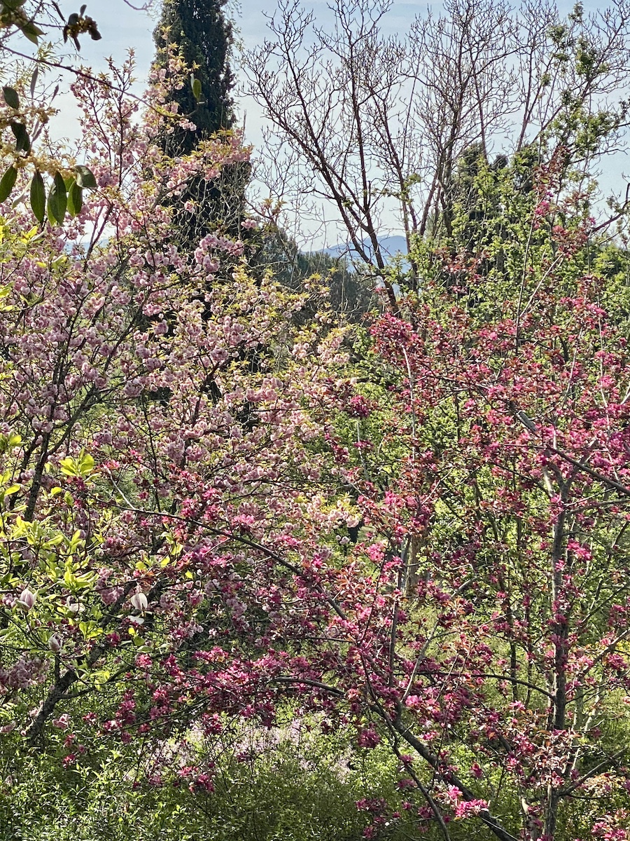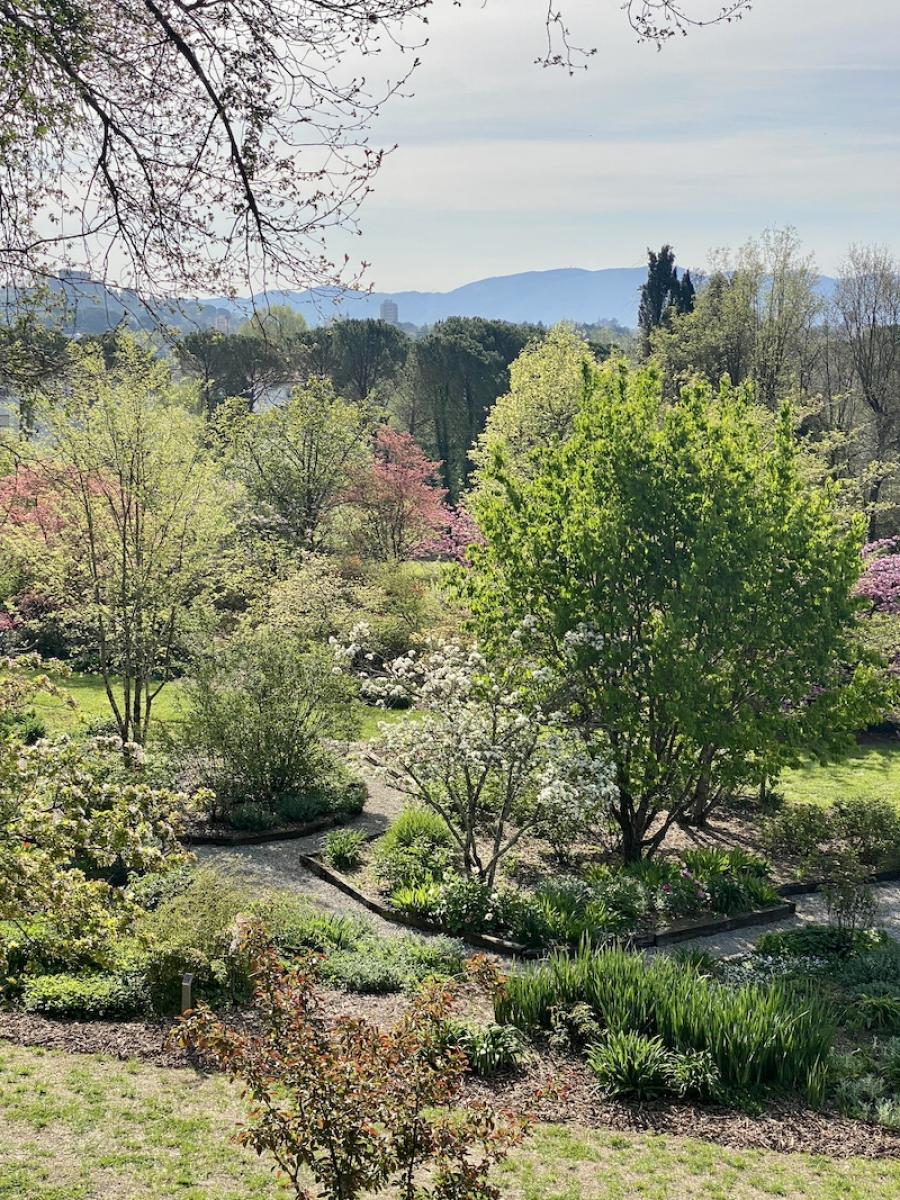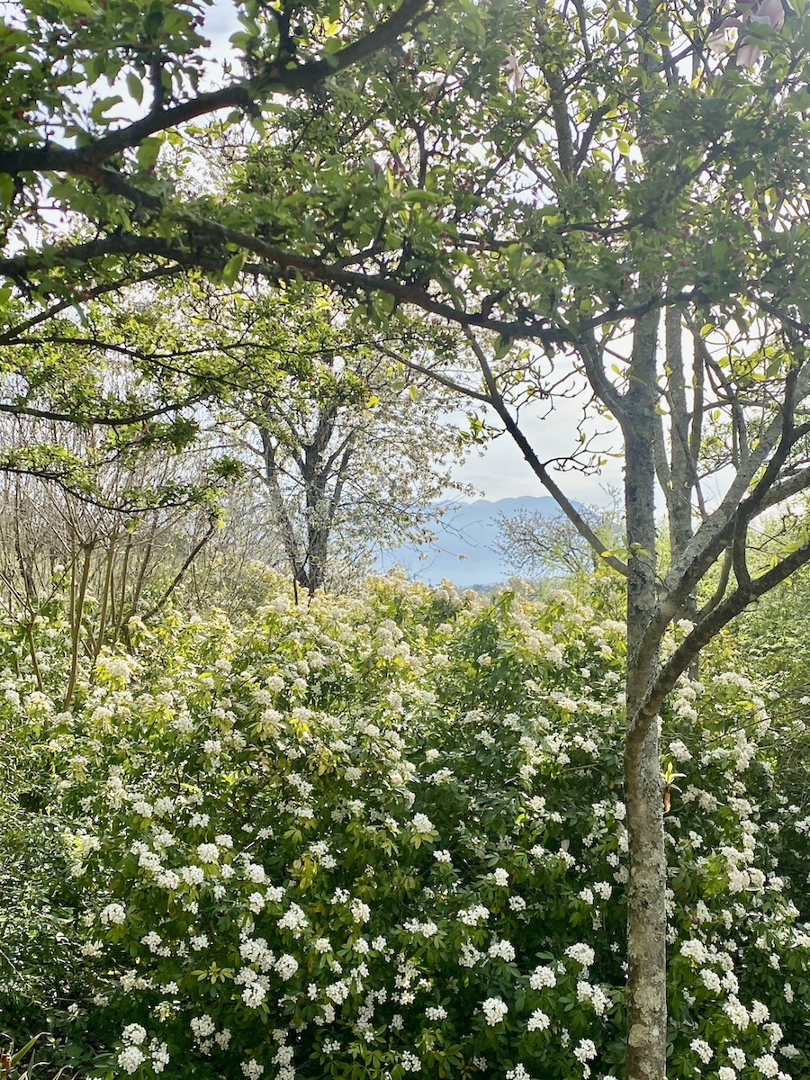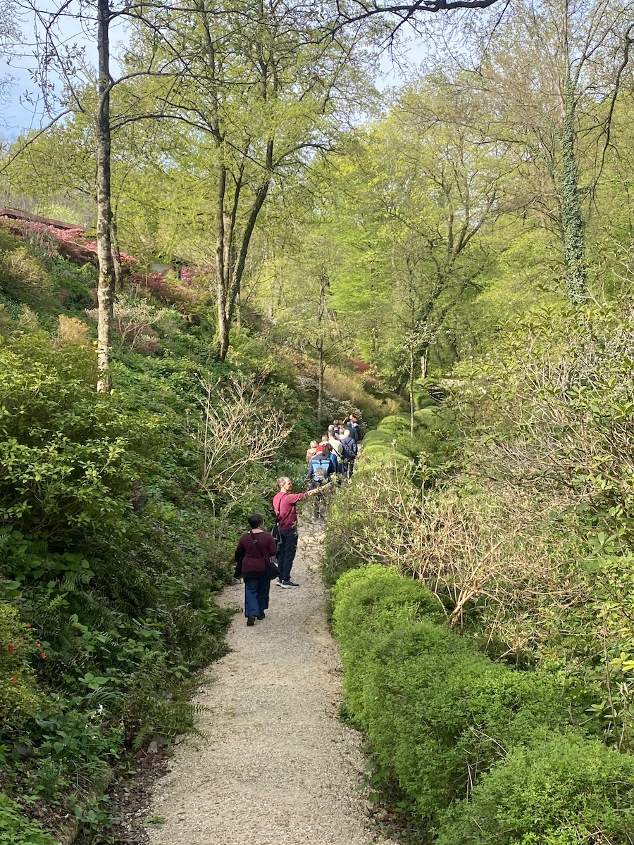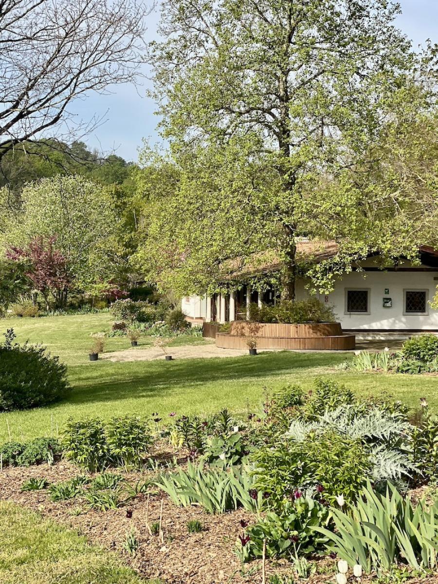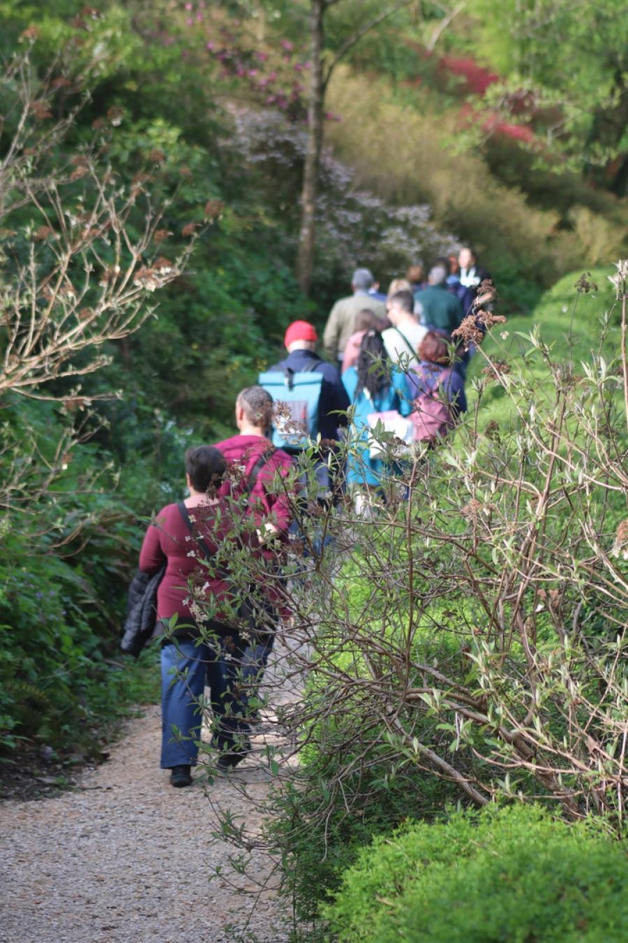 Wir starten unseren geführten Rundgang auf der obersten Ebene, wo auch das Haus steht, das Viatori damals errichtete, und in dem sich heute ein kleines Informationszentrum befindet, indem auch auf dem digitalen Weg viel über den Garten, aber auch das gesamte umliegende Gebiet und Naturschutzthemen erfahren kann. Was mir rund um das Haus gleich auffällt: Die Tulpen sind zum Großteil bereits am Verblühen, zu Hause in Wien sind sie zu diesem Zeitpunkt, Anfang April, noch nicht einmal ansatzweise erblüht. Wir hören, dass im Laufe der Jahre rund 500 Azaleenarten angepflanzt wurden, und das, obwohl der hiesige Boden dafür nicht geeignet ist. Nachgeholfen wurde daher in den Azaleenbeeten mit Sägespänen, die man sich in Sägewerken in der Umgebung besorgt hat, und mit Kompostmaterial – die Azaleen scheint es jedenfalls überzeugt zu haben. Denn sie wuchern geradezu und leuchten in den unglaublichsten Farben. Viatori experimentierte mit Böden, Mikroklima und Gestaltung und erschuf so seine eigene botanische Welt. In welcher z. B. auch der Albero di San Bartolomeo Platz gefunden: Noch steht die chinesische Kräuselmyrthe mit nackt anmutenden, glatten, zimtfarbenen Stämmen da. Ihre Rinde löst sich über den Herbst von selbst ab, spätestens im Juli wird sie in Pink, Rot, Weiß oder Violett blühen. Was mich ebenfalls begeistert: Der Nuttalls Blüten-Hartriegel, mit wunderschönen weißen Blüten, die schon fast wächsern-artifiziell aussehen – ein Baum, den ich hier zum ersten Mal in meinem Leben sehe. Was für eine unglaublich schöne Pflanze!