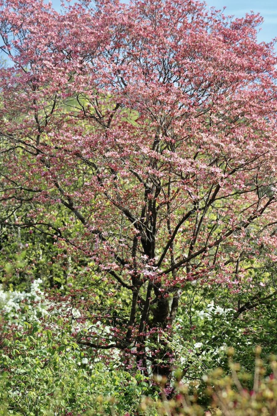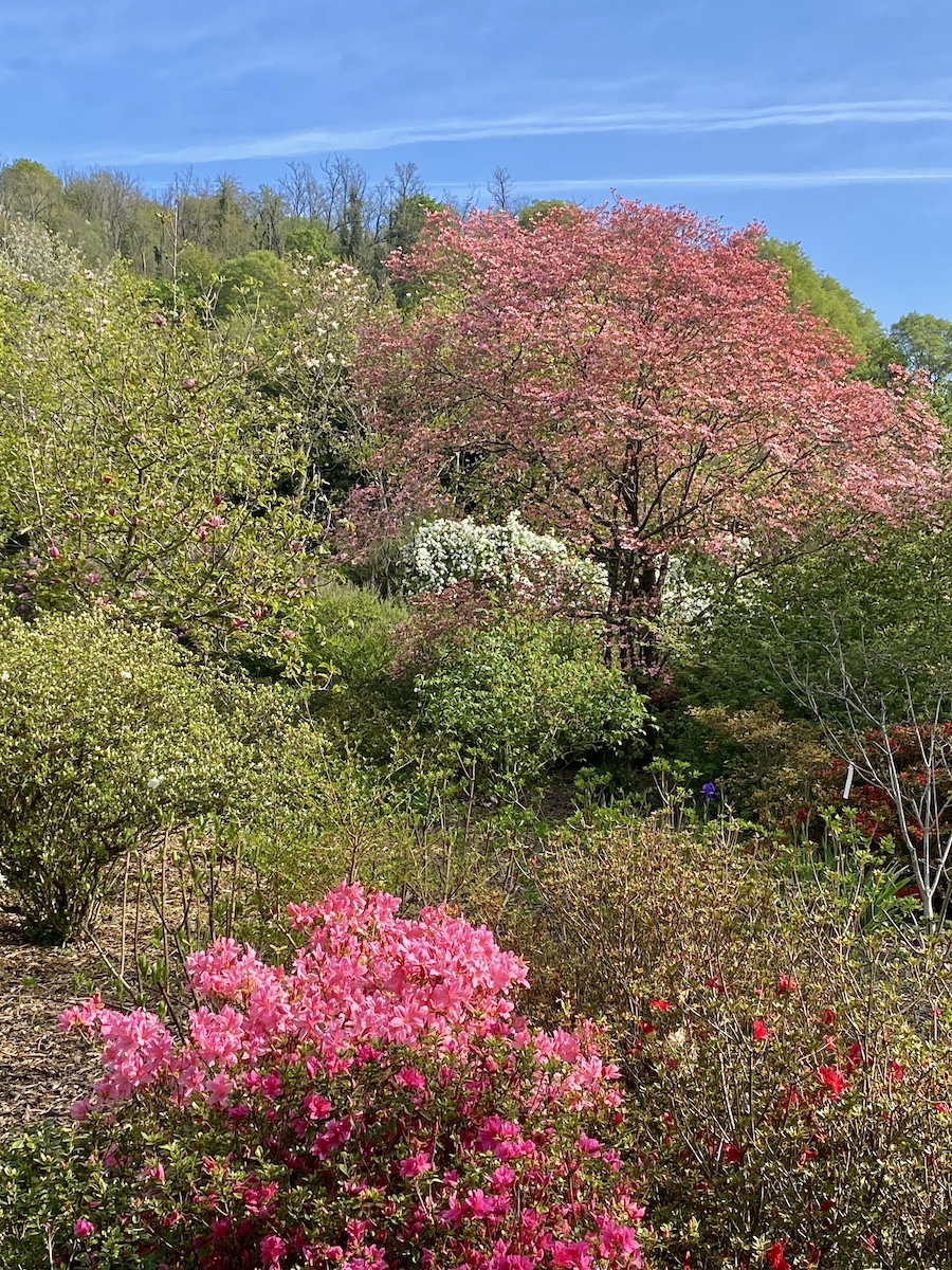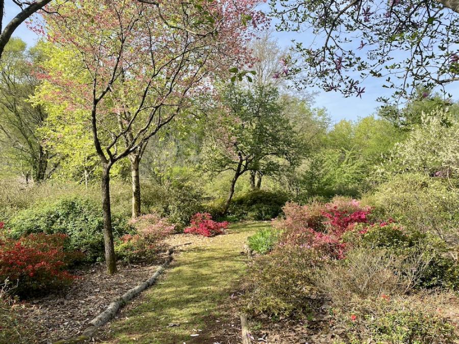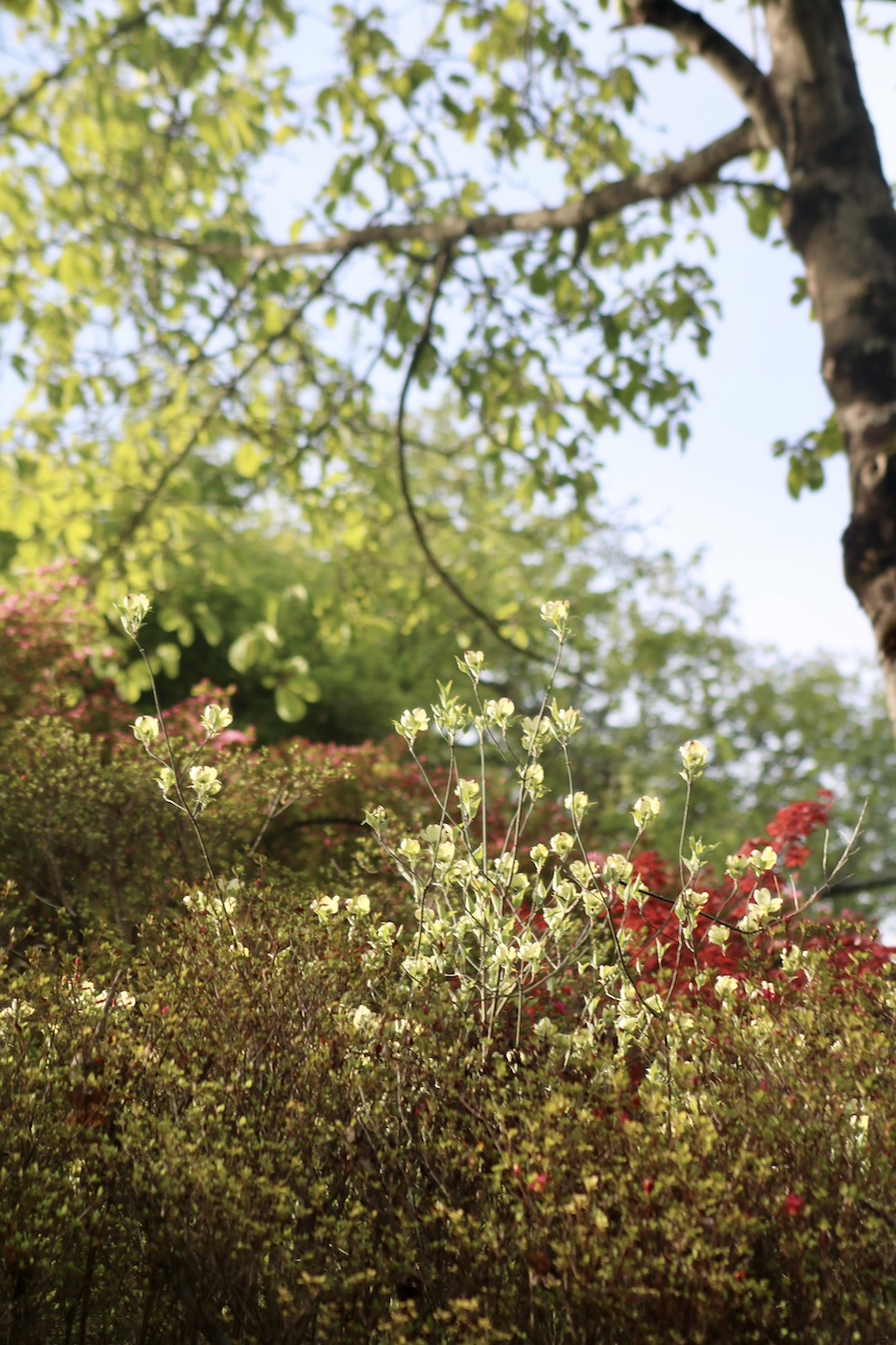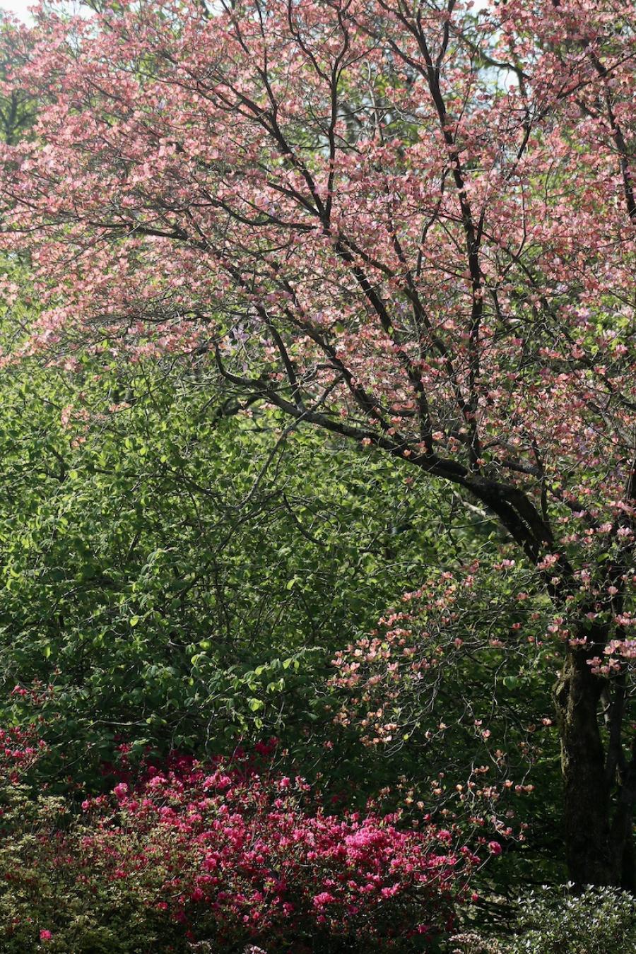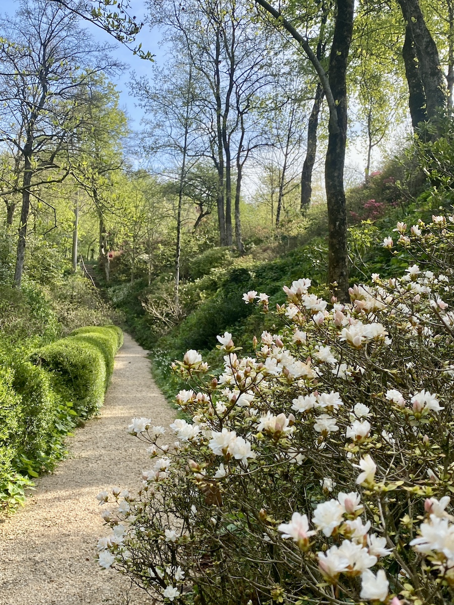 Wir starten unseren geführten Rundgang auf der obersten Ebene, wo auch das Haus steht, das Viatori damals errichtete, und in dem sich heute ein kleines Informationszentrum befindet, indem auch auf dem digitalen Weg viel über den Garten, aber auch das gesamte umliegende Gebiet und Naturschutzthemen erfahren kann. Was mir rund um das Haus gleich auffällt: Die Tulpen sind zum Großteil bereits am Verblühen, zu Hause in Wien sind sie zu diesem Zeitpunkt, Anfang April, noch nicht einmal ansatzweise erblüht. Wir hören, dass im Laufe der Jahre rund 500 Azaleenarten angepflanzt wurden, und das, obwohl der hiesige Boden dafür nicht geeignet ist. Nachgeholfen wurde daher in den Azaleenbeeten mit Sägespänen, die man sich in Sägewerken in der Umgebung besorgt hat, und mit Kompostmaterial – die Azaleen scheint es jedenfalls überzeugt zu haben. Denn sie wuchern geradezu und leuchten in den unglaublichsten Farben. Viatori experimentierte mit Böden, Mikroklima und Gestaltung und erschuf so seine eigene botanische Welt. In welcher z. B. auch der Albero di San Bartolomeo Platz gefunden: Noch steht die chinesische Kräuselmyrthe mit nackt anmutenden, glatten, zimtfarbenen Stämmen da. Ihre Rinde löst sich über den Herbst von selbst ab, spätestens im Juli wird sie in Pink, Rot, Weiß oder Violett blühen. Was mich ebenfalls begeistert: Der Nuttalls Blüten-Hartriegel, mit wunderschönen weißen Blüten, die schon fast wächsern-artifiziell aussehen – ein Baum, den ich hier zum ersten Mal in meinem Leben sehe. Was für eine unglaublich schöne Pflanze!