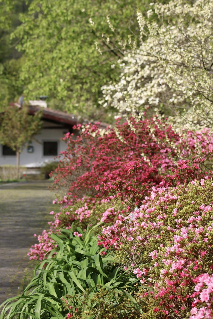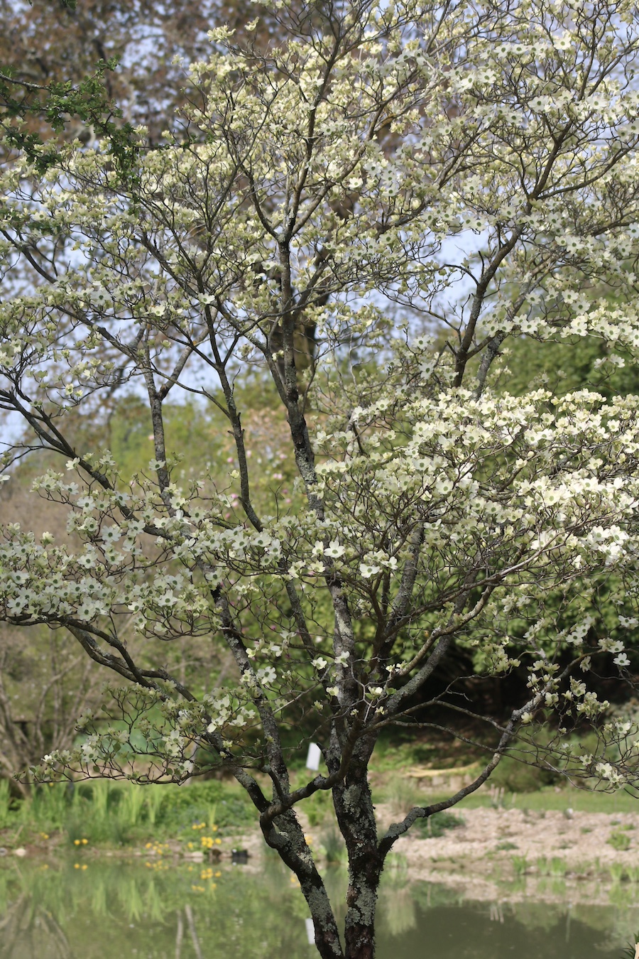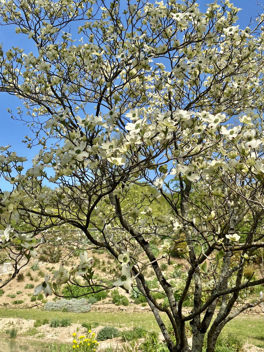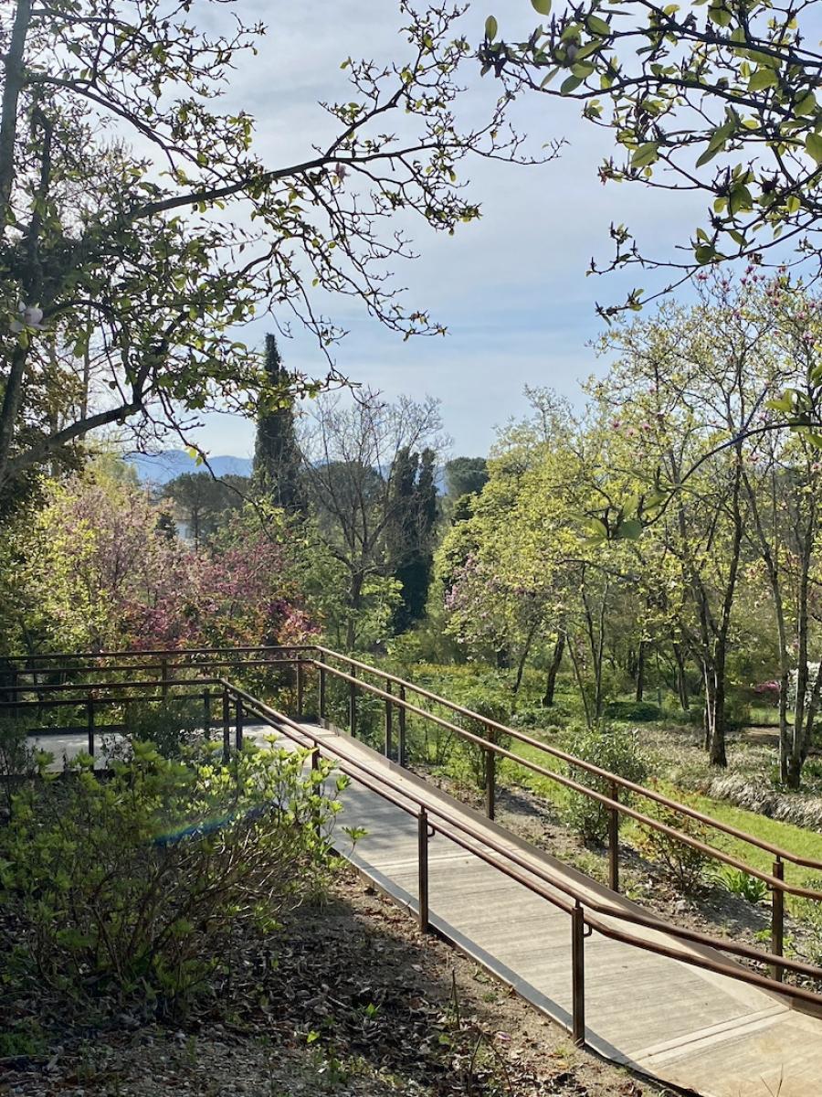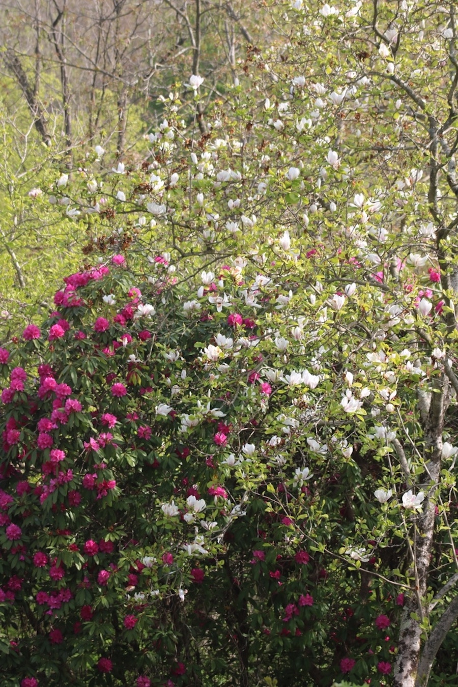 Wir starten unseren geführten Rundgang auf der obersten Ebene, wo auch das Haus steht, das Viatori damals errichtete, und in dem sich heute ein kleines Informationszentrum befindet, indem auch auf dem digitalen Weg viel über den Garten, aber auch das gesamte umliegende Gebiet und Naturschutzthemen erfahren kann. Was mir rund um das Haus gleich auffällt: Die Tulpen sind zum Großteil bereits am Verblühen, zu Hause in Wien sind sie zu diesem Zeitpunkt, Anfang April, noch nicht einmal ansatzweise erblüht. Wir hören, dass im Laufe der Jahre rund 500 Azaleenarten angepflanzt wurden, und das, obwohl der hiesige Boden dafür nicht geeignet ist. Nachgeholfen wurde daher in den Azaleenbeeten mit Sägespänen, die man sich in Sägewerken in der Umgebung besorgt hat, und mit Kompostmaterial – die Azaleen scheint es jedenfalls überzeugt zu haben. Denn sie wuchern geradezu und leuchten in den unglaublichsten Farben. Viatori experimentierte mit Böden, Mikroklima und Gestaltung und erschuf so seine eigene botanische Welt. In welcher z. B. auch der Albero di San Bartolomeo Platz gefunden: Noch steht die chinesische Kräuselmyrthe mit nackt anmutenden, glatten, zimtfarbenen Stämmen da. Ihre Rinde löst sich über den Herbst von selbst ab, spätestens im Juli wird sie in Pink, Rot, Weiß oder Violett blühen. Was mich ebenfalls begeistert: Der Nuttalls Blüten-Hartriegel, mit wunderschönen weißen Blüten, die schon fast wächsern-artifiziell aussehen – ein Baum, den ich hier zum ersten Mal in meinem Leben sehe. Was für eine unglaublich schöne Pflanze!