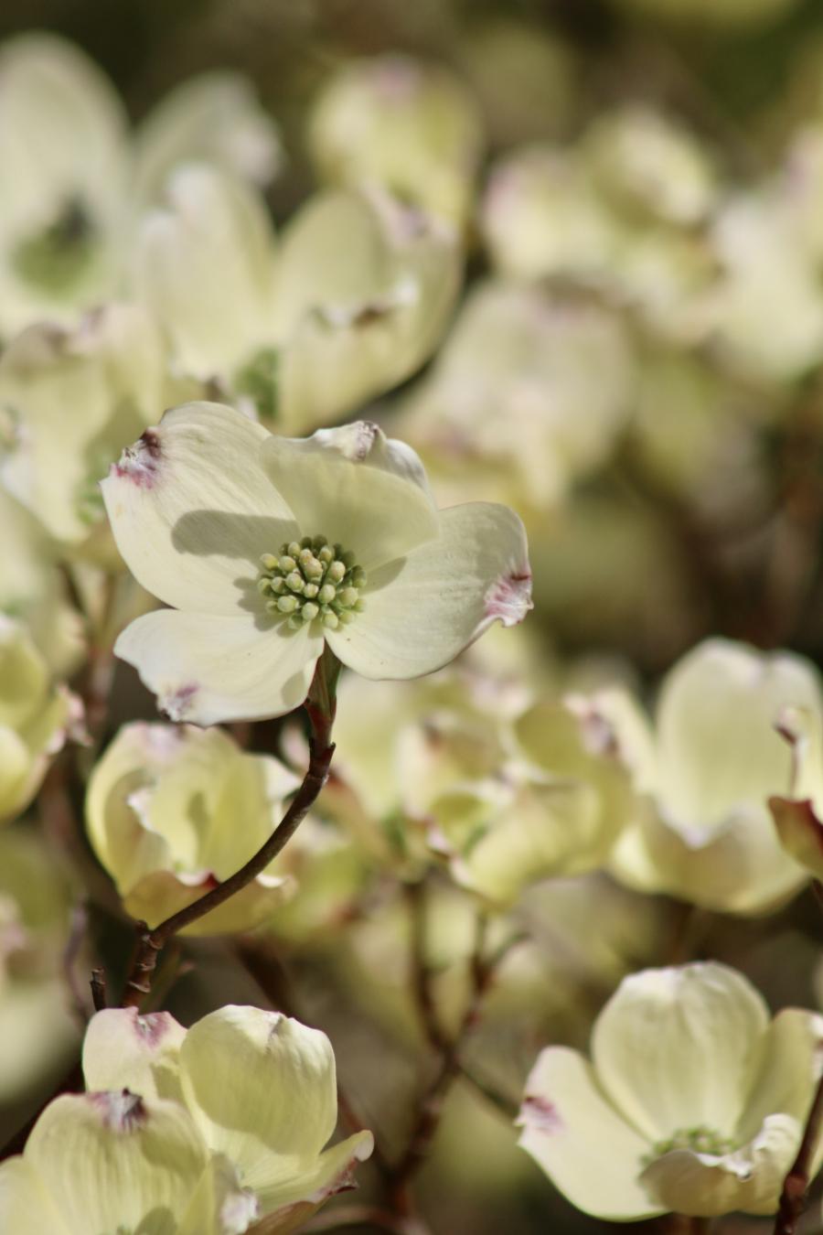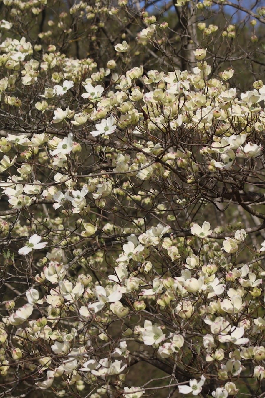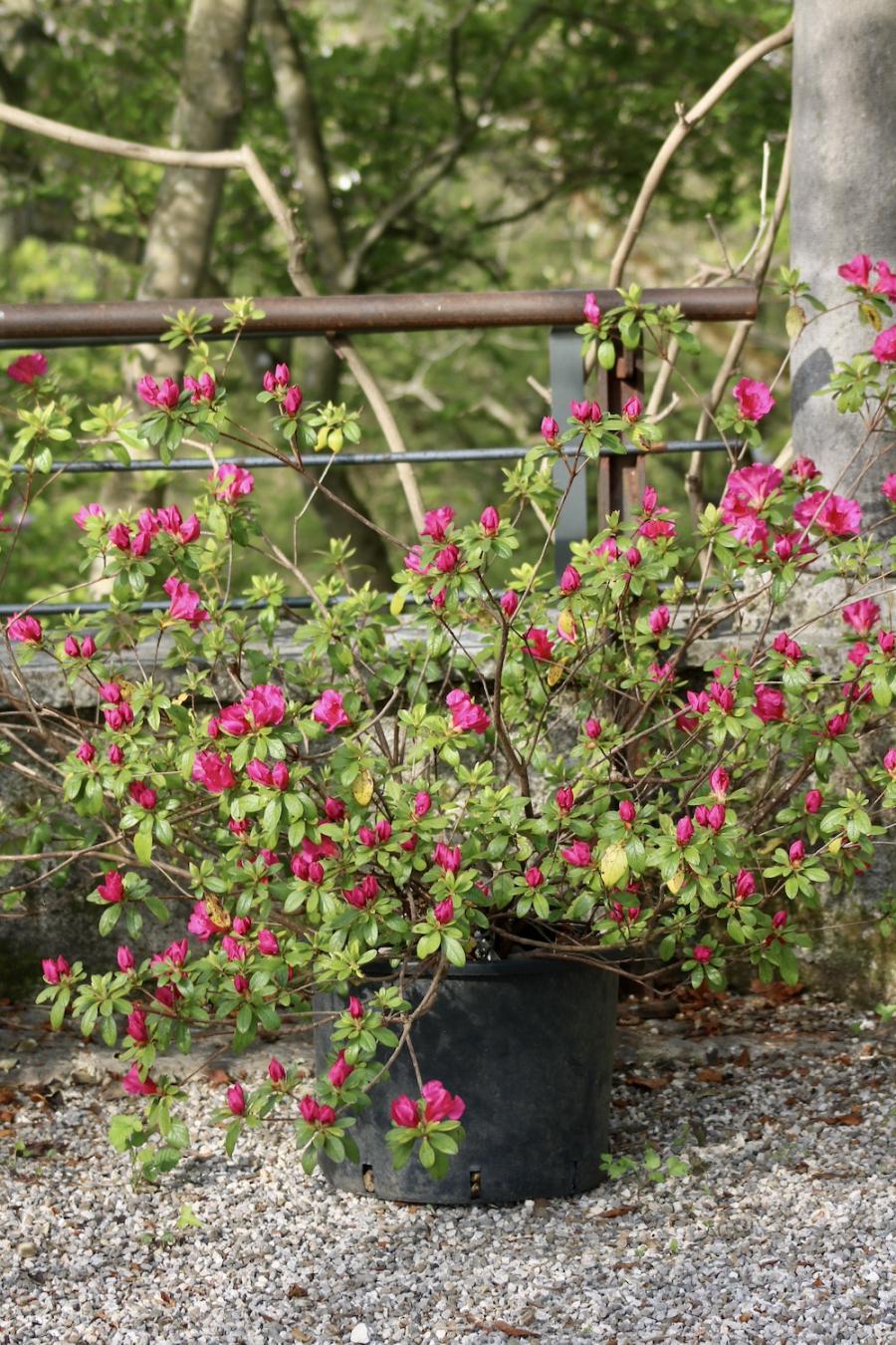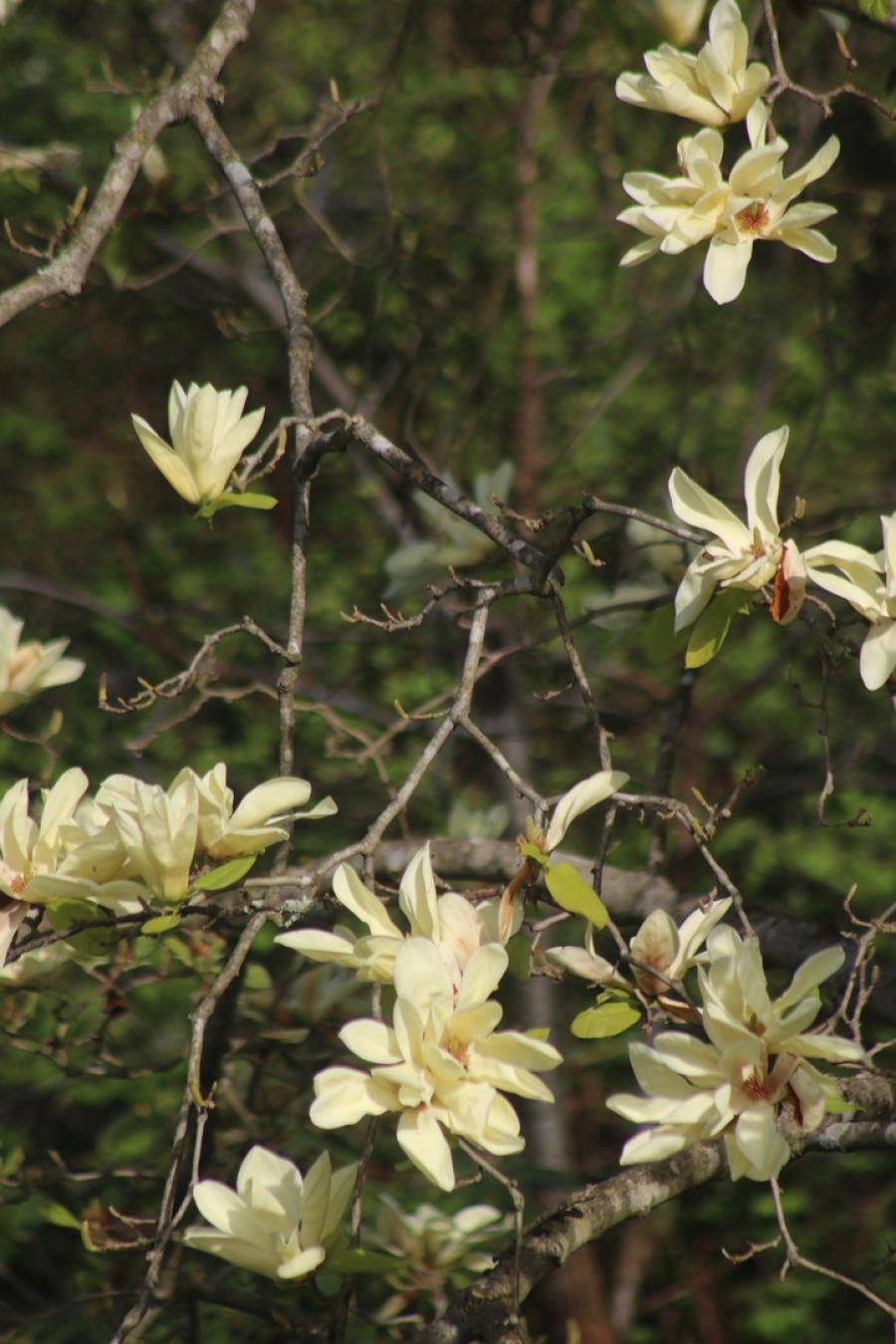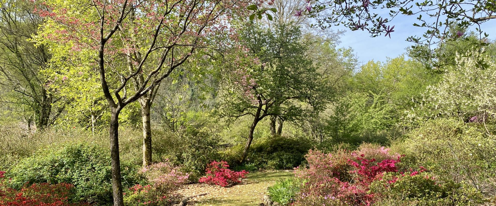 Wir starten unseren geführten Rundgang auf der obersten Ebene, wo auch das Haus steht, das Viatori damals errichtete, und in dem sich heute ein kleines Informationszentrum befindet, indem auch auf dem digitalen Weg viel über den Garten, aber auch das gesamte umliegende Gebiet und Naturschutzthemen erfahren kann. Was mir rund um das Haus gleich auffällt: Die Tulpen sind zum Großteil bereits am Verblühen, zu Hause in Wien sind sie zu diesem Zeitpunkt, Anfang April, noch nicht einmal ansatzweise erblüht. Wir hören, dass im Laufe der Jahre rund 500 Azaleenarten angepflanzt wurden, und das, obwohl der hiesige Boden dafür nicht geeignet ist. Nachgeholfen wurde daher in den Azaleenbeeten mit Sägespänen, die man sich in Sägewerken in der Umgebung besorgt hat, und mit Kompostmaterial – die Azaleen scheint es jedenfalls überzeugt zu haben. Denn sie wuchern geradezu und leuchten in den unglaublichsten Farben. Viatori experimentierte mit Böden, Mikroklima und Gestaltung und erschuf so seine eigene botanische Welt. In welcher z. B. auch der Albero di San Bartolomeo Platz gefunden: Noch steht die chinesische Kräuselmyrthe mit nackt anmutenden, glatten, zimtfarbenen Stämmen da. Ihre Rinde löst sich über den Herbst von selbst ab, spätestens im Juli wird sie in Pink, Rot, Weiß oder Violett blühen. Was mich ebenfalls begeistert: Der Nuttalls Blüten-Hartriegel, mit wunderschönen weißen Blüten, die schon fast wächsern-artifiziell aussehen – ein Baum, den ich hier zum ersten Mal in meinem Leben sehe. Was für eine unglaublich schöne Pflanze!