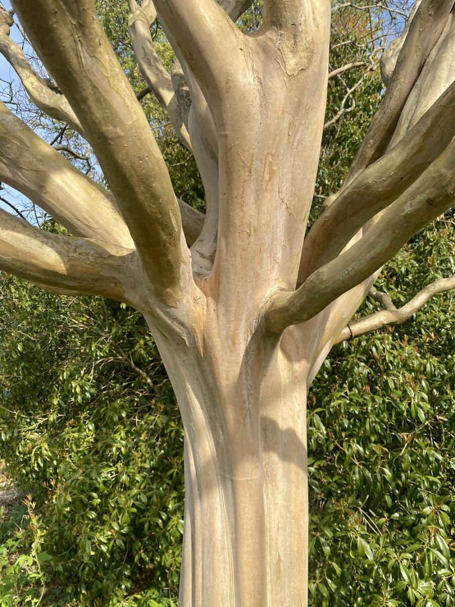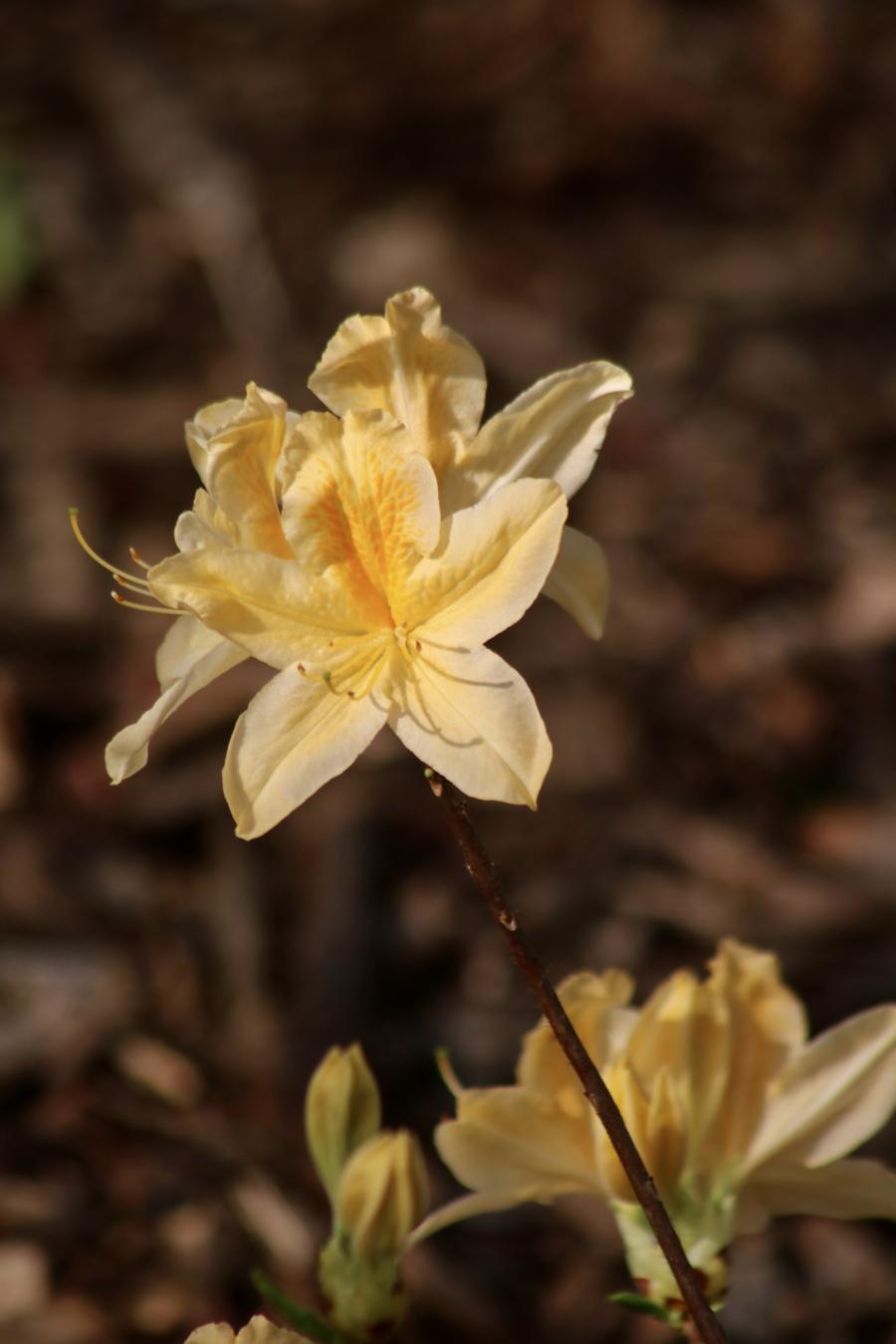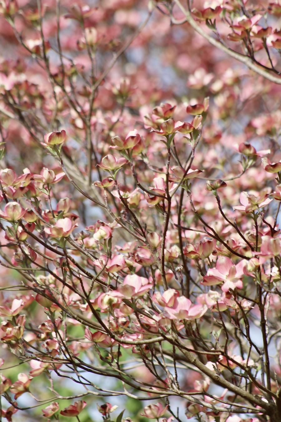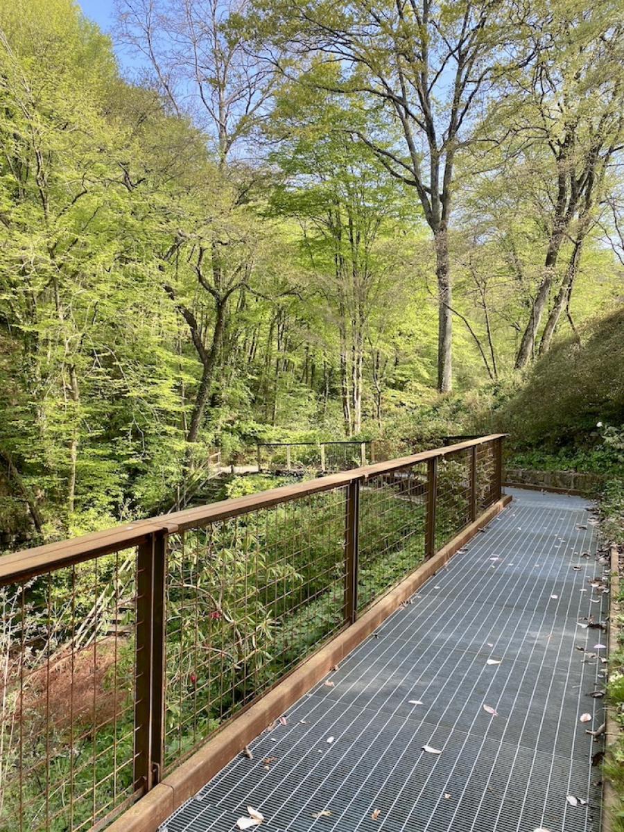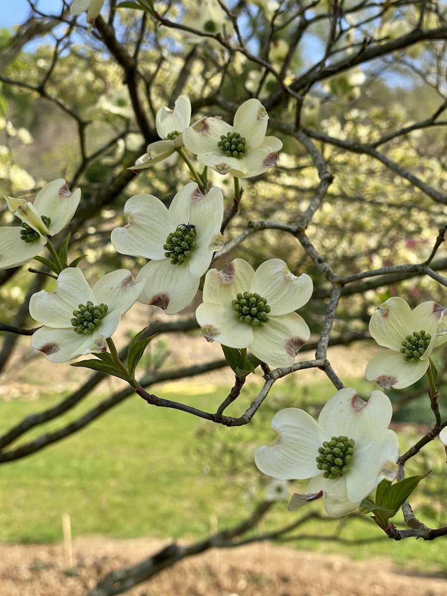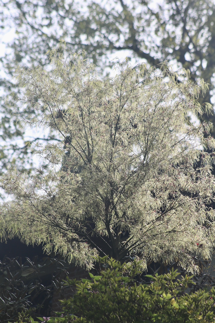 Wir starten unseren geführten Rundgang auf der obersten Ebene, wo auch das Haus steht, das Viatori damals errichtete, und in dem sich heute ein kleines Informationszentrum befindet, indem auch auf dem digitalen Weg viel über den Garten, aber auch das gesamte umliegende Gebiet und Naturschutzthemen erfahren kann. Was mir rund um das Haus gleich auffällt: Die Tulpen sind zum Großteil bereits am Verblühen, zu Hause in Wien sind sie zu diesem Zeitpunkt, Anfang April, noch nicht einmal ansatzweise erblüht. Wir hören, dass im Laufe der Jahre rund 500 Azaleenarten angepflanzt wurden, und das, obwohl der hiesige Boden dafür nicht geeignet ist. Nachgeholfen wurde daher in den Azaleenbeeten mit Sägespänen, die man sich in Sägewerken in der Umgebung besorgt hat, und mit Kompostmaterial – die Azaleen scheint es jedenfalls überzeugt zu haben. Denn sie wuchern geradezu und leuchten in den unglaublichsten Farben. Viatori experimentierte mit Böden, Mikroklima und Gestaltung und erschuf so seine eigene botanische Welt. In welcher z. B. auch der Albero di San Bartolomeo Platz gefunden: Noch steht die chinesische Kräuselmyrthe mit nackt anmutenden, glatten, zimtfarbenen Stämmen da. Ihre Rinde löst sich über den Herbst von selbst ab, spätestens im Juli wird sie in Pink, Rot, Weiß oder Violett blühen. Was mich ebenfalls begeistert: Der Nuttalls Blüten-Hartriegel, mit wunderschönen weißen Blüten, die schon fast wächsern-artifiziell aussehen – ein Baum, den ich hier zum ersten Mal in meinem Leben sehe. Was für eine unglaublich schöne Pflanze!