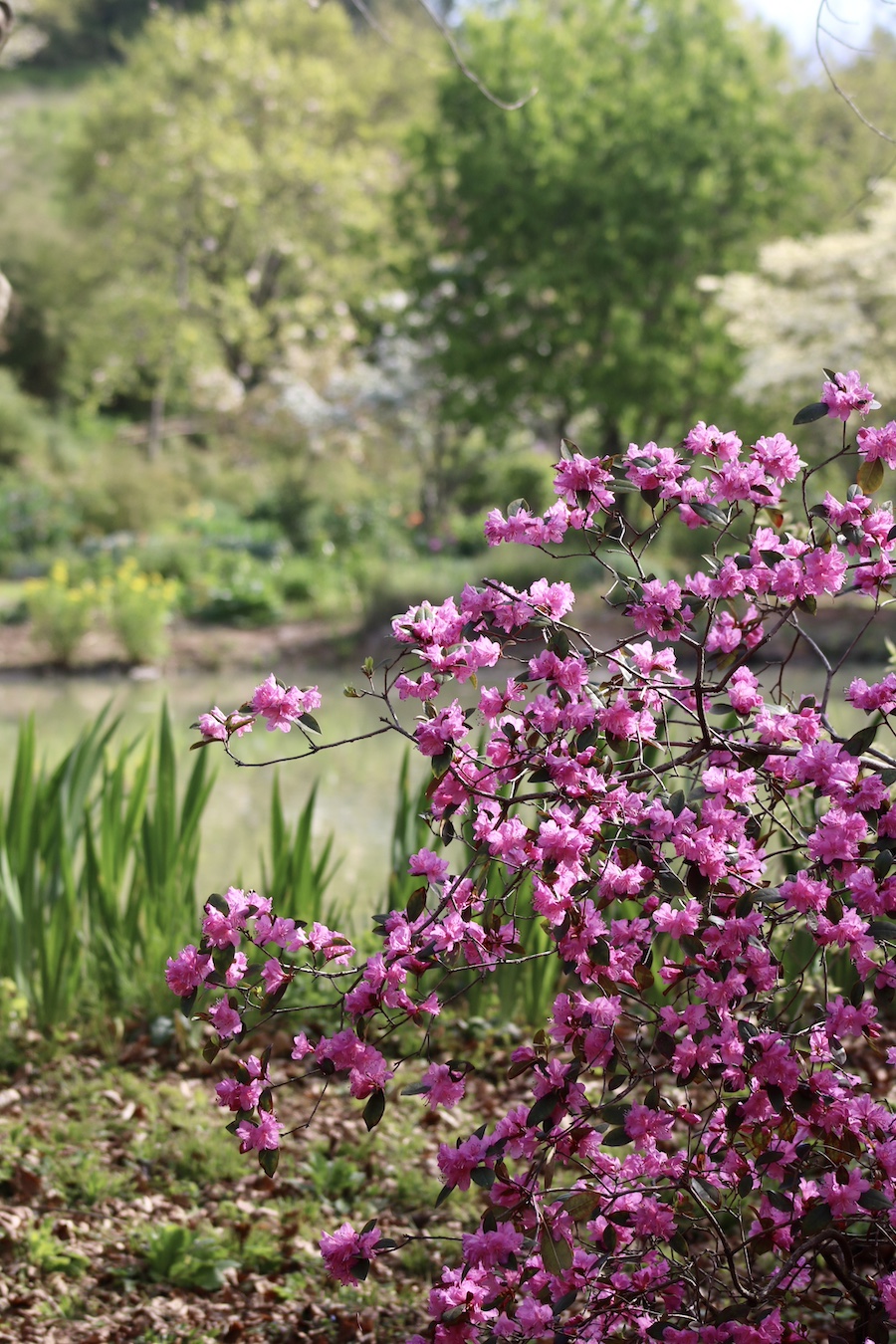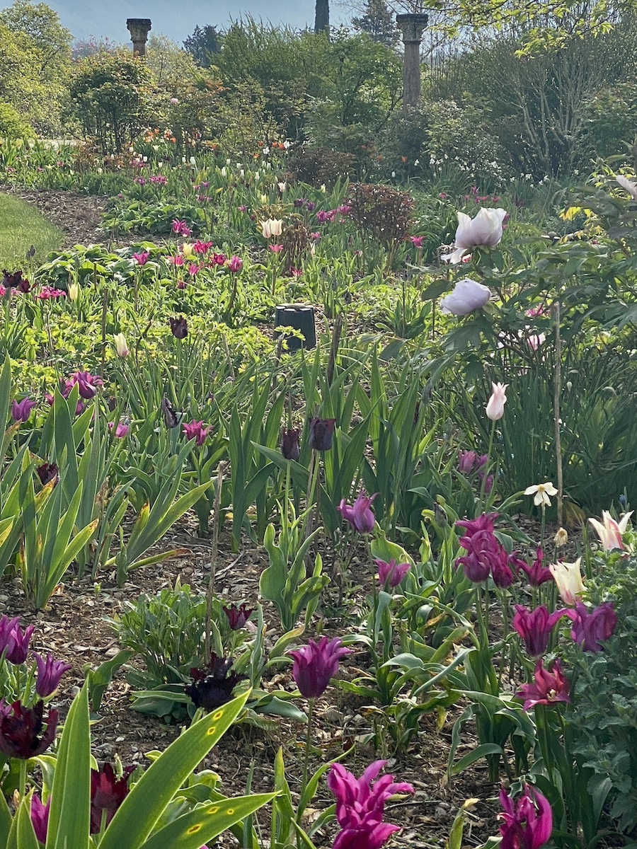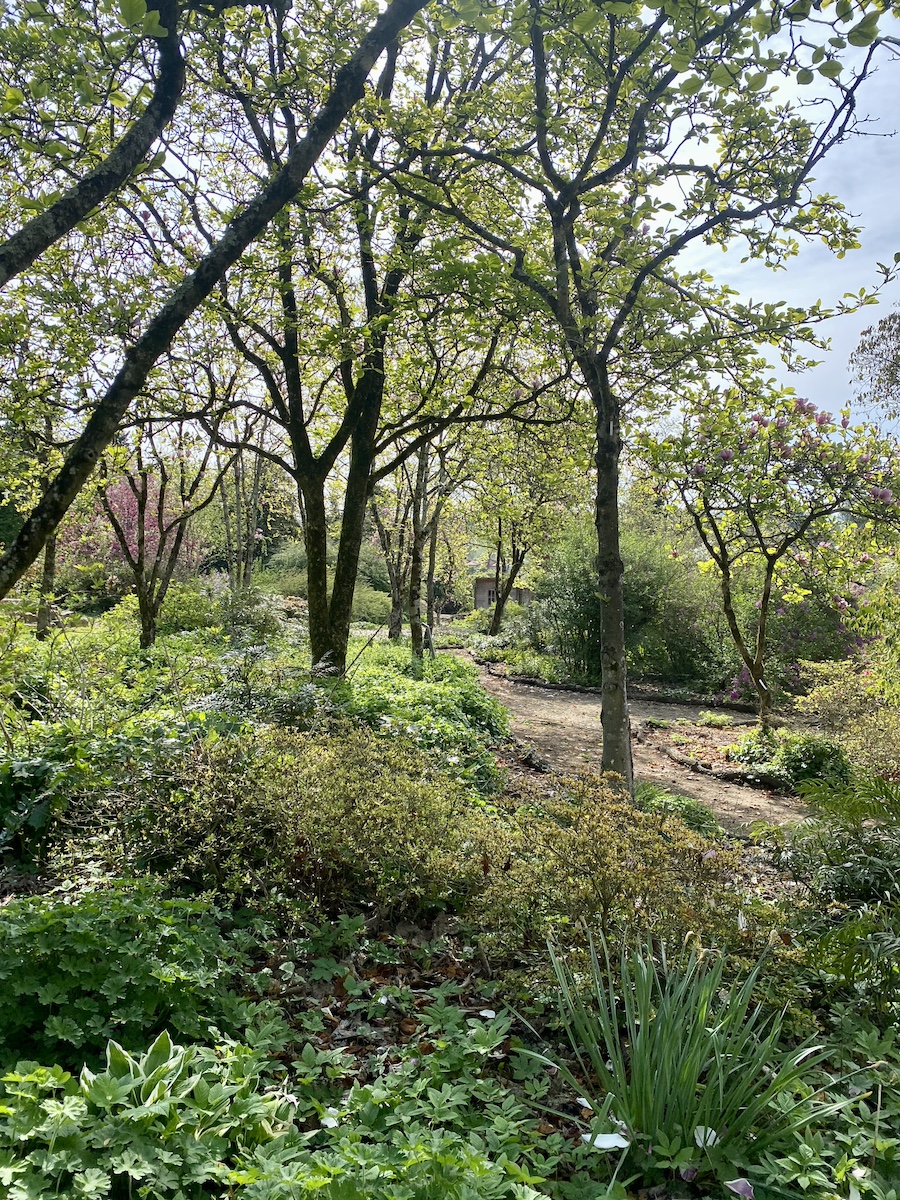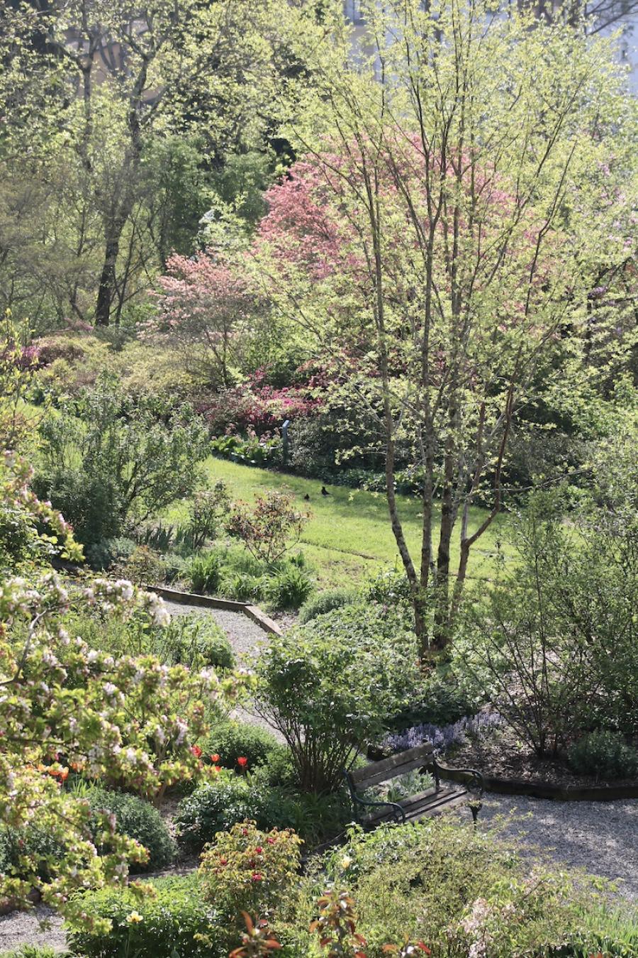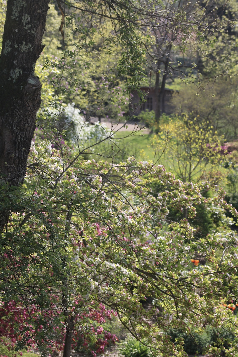 Besonders schön ist der Garten jetzt im Frühjahr, Anfang April. Die Pflanzen- und Blumensammlungen bestechen mit einem Farbspektrum zwischen zarten Pastelltönen und überbordend intensiven Pink- und Violettnuancen. Bienen summen, erste Schmetterlinge eilen von Blüte zu Blüte, und ja, mag es klischeehaft klingen, aber irgendwie scheint Zeit hier plötzlich keine Rolle zu spielen. Und ich, ich hätte hier noch gerne mehr Zeit...