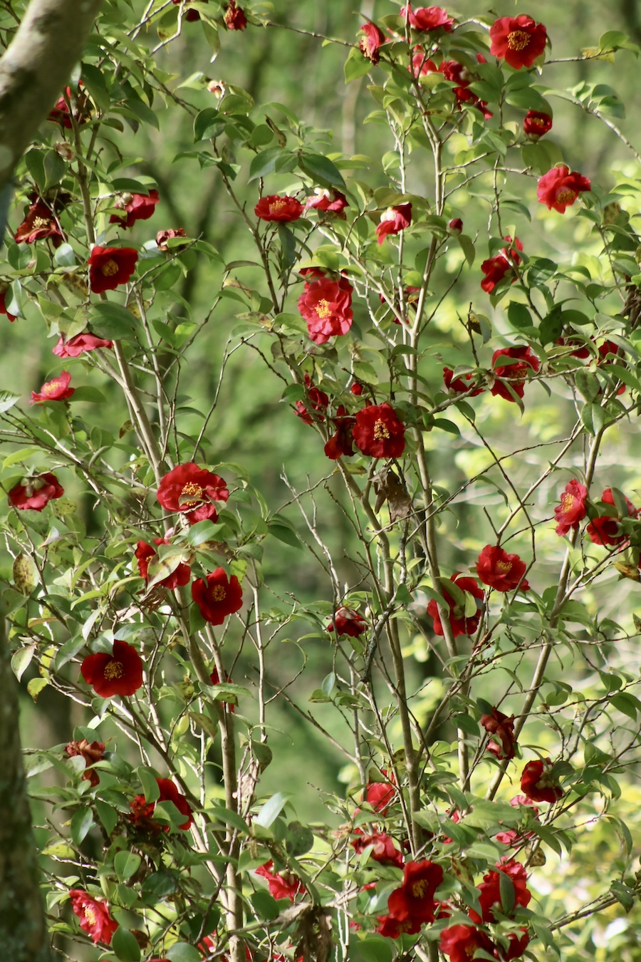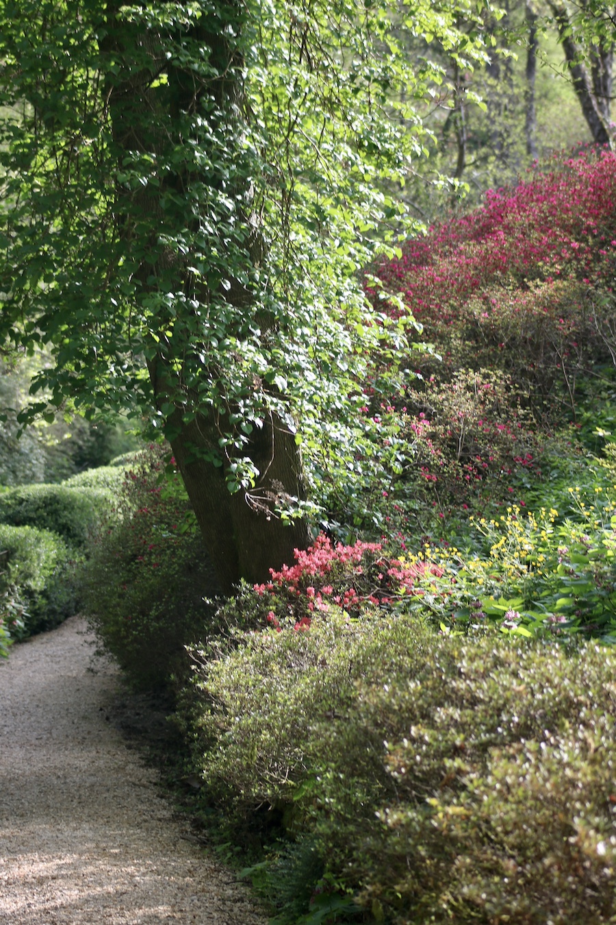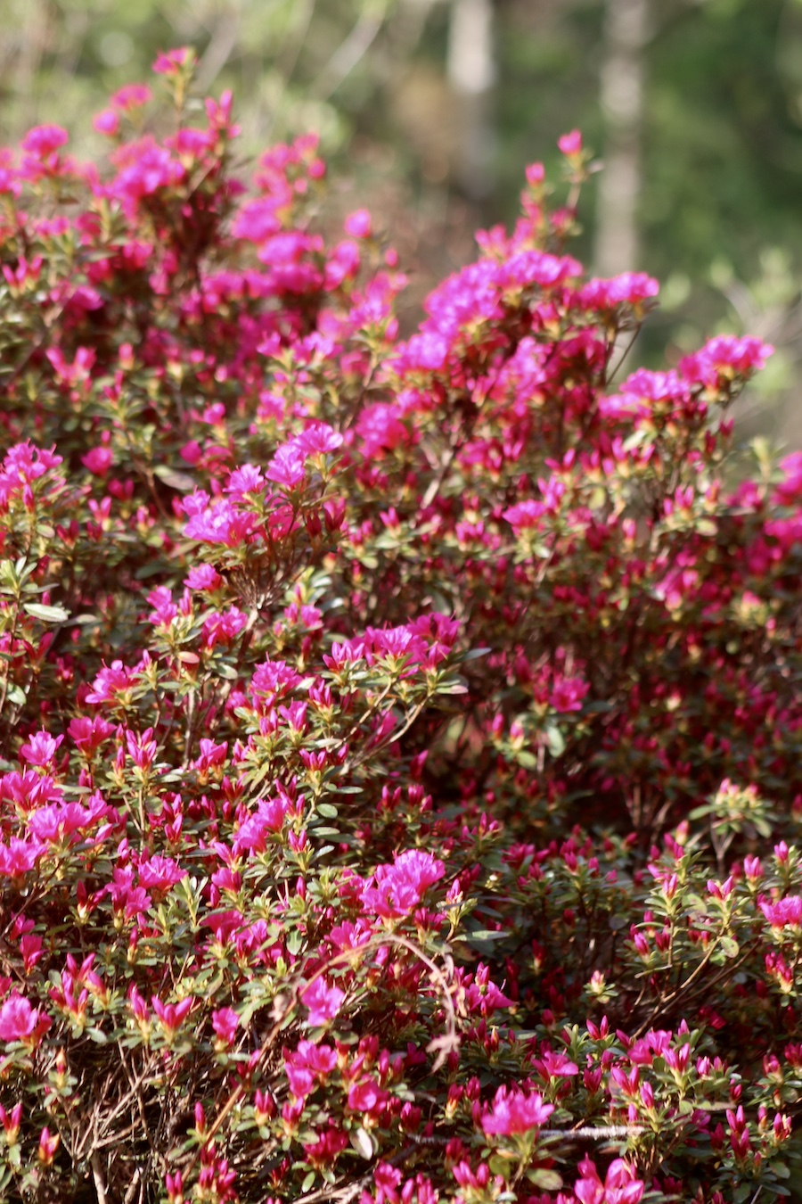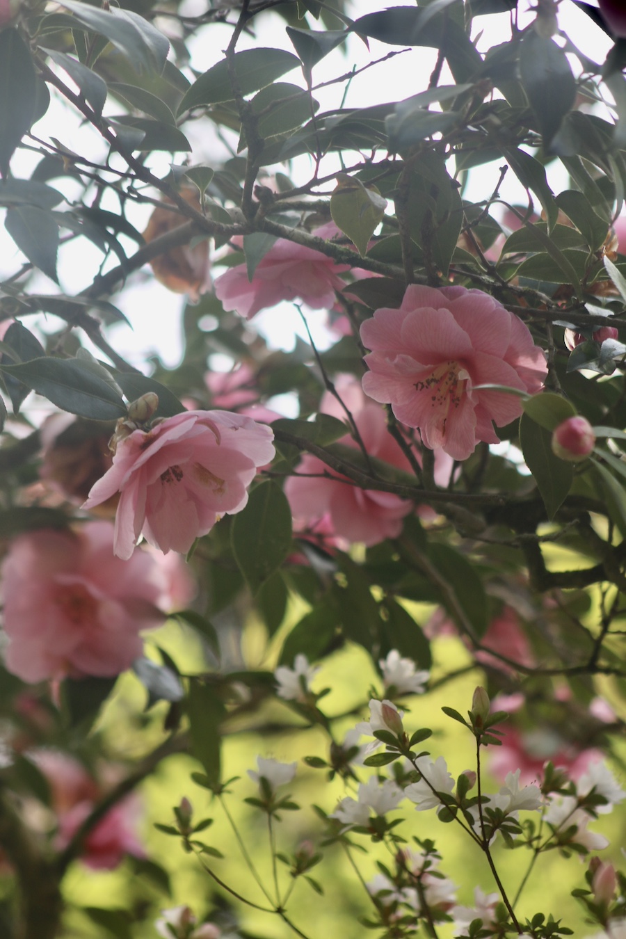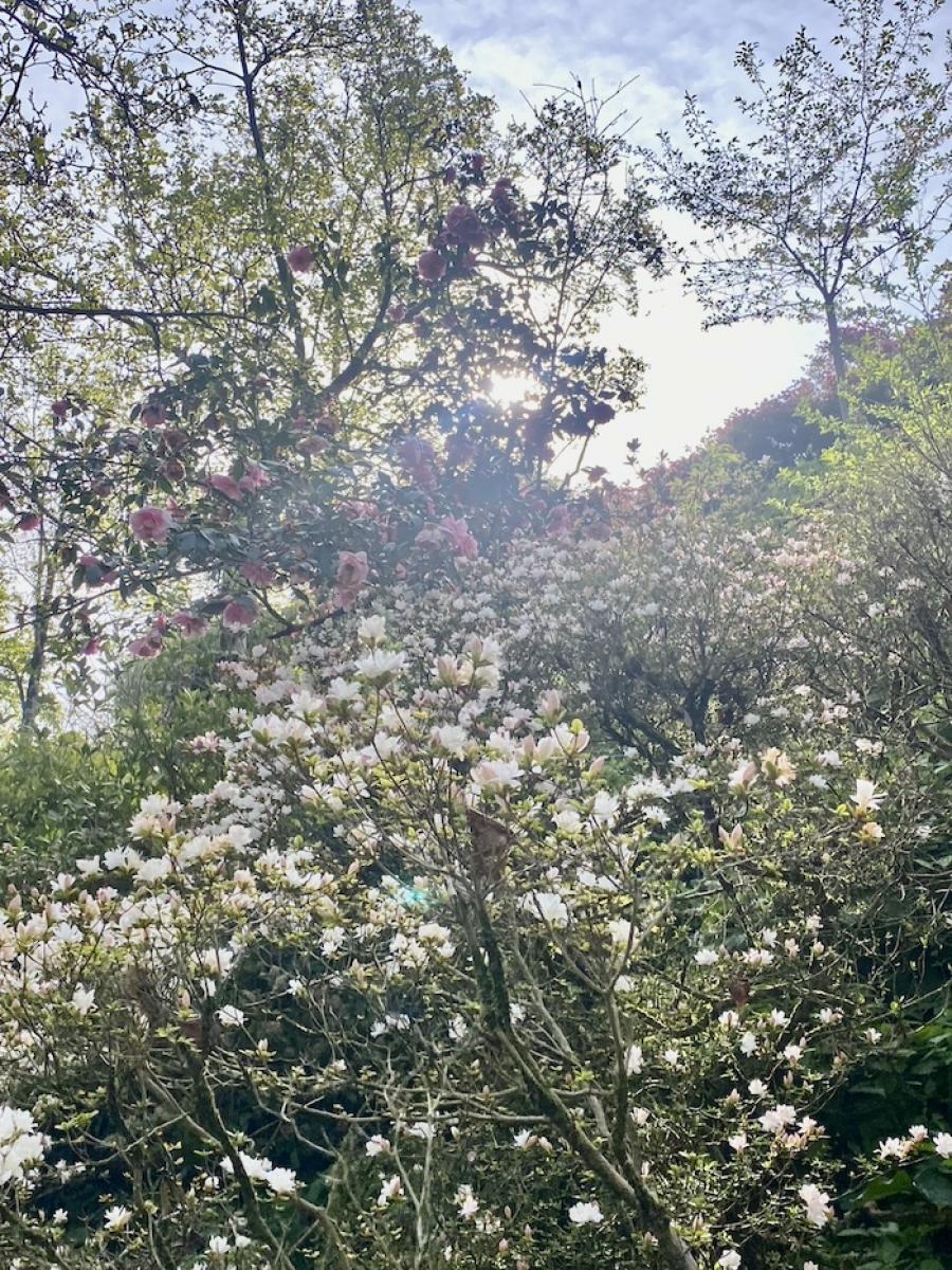 Und dann geht es schon hinunter zur nächsten, tiefer gelegenen Ebene: Vorbei an großartig blühenden Magnolienbäumen und Rhododendren – von denen es auf dem Gelände hunderte gibt –, an zarten Kamelien in unglaublichen Farben, entlang eines gewundenen Wegs, umwuchert von Pflanzen, die ich teilweise gar nicht kenne. Die Lichtstimmung, der Duft, die Stille, nur von Vogelzwitschern unterbrochen wird. Ich lasse mich etwas zurückfallen, zücke die Kamera. Eigentlich sollte man die Kamera wegstecken und das ganze einfach so auf sich wirken lassen. Sollte…