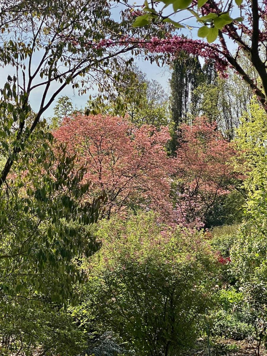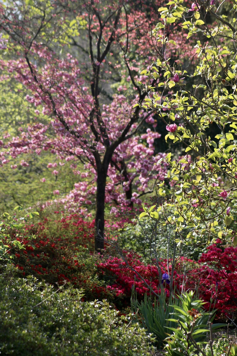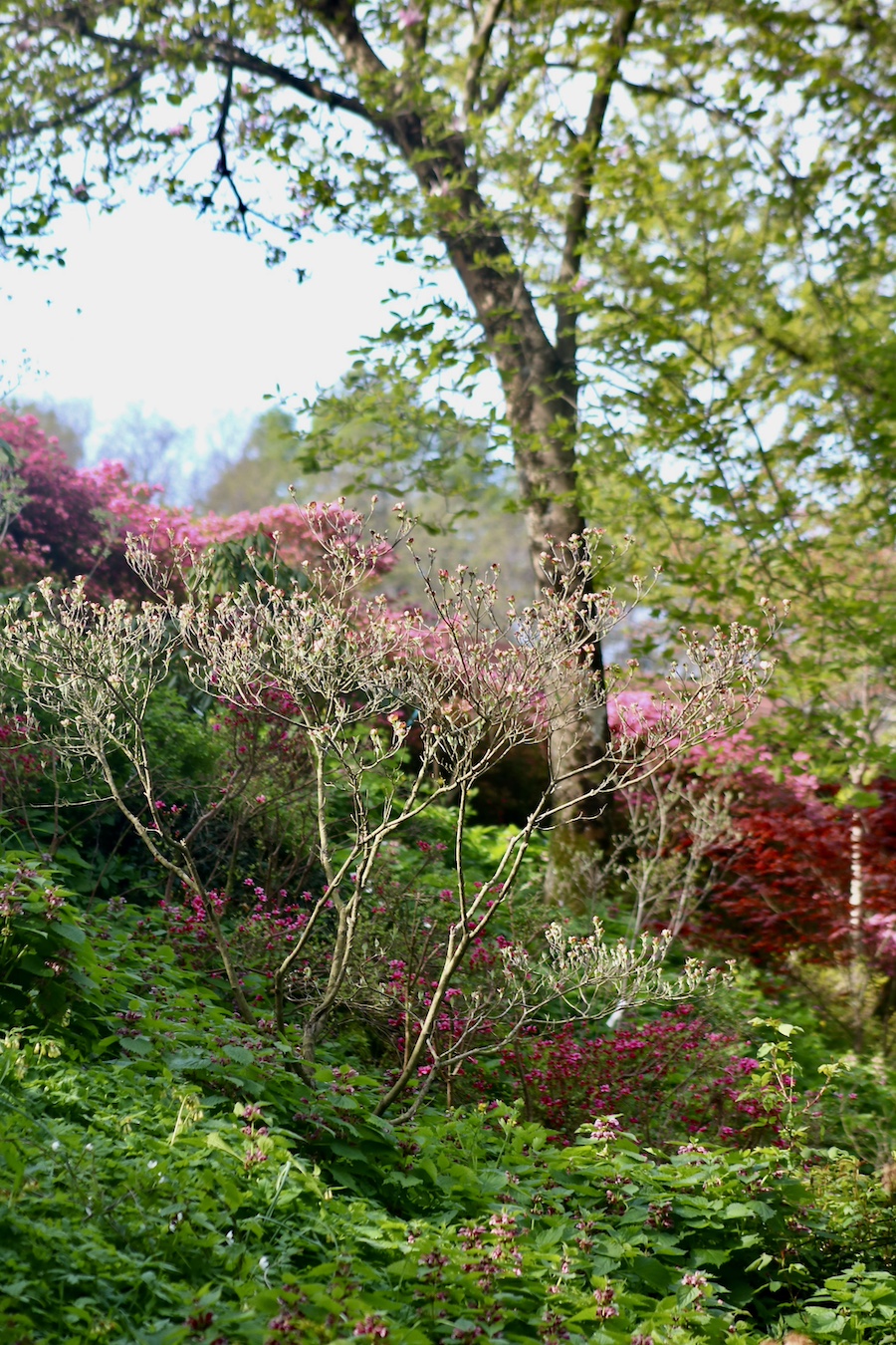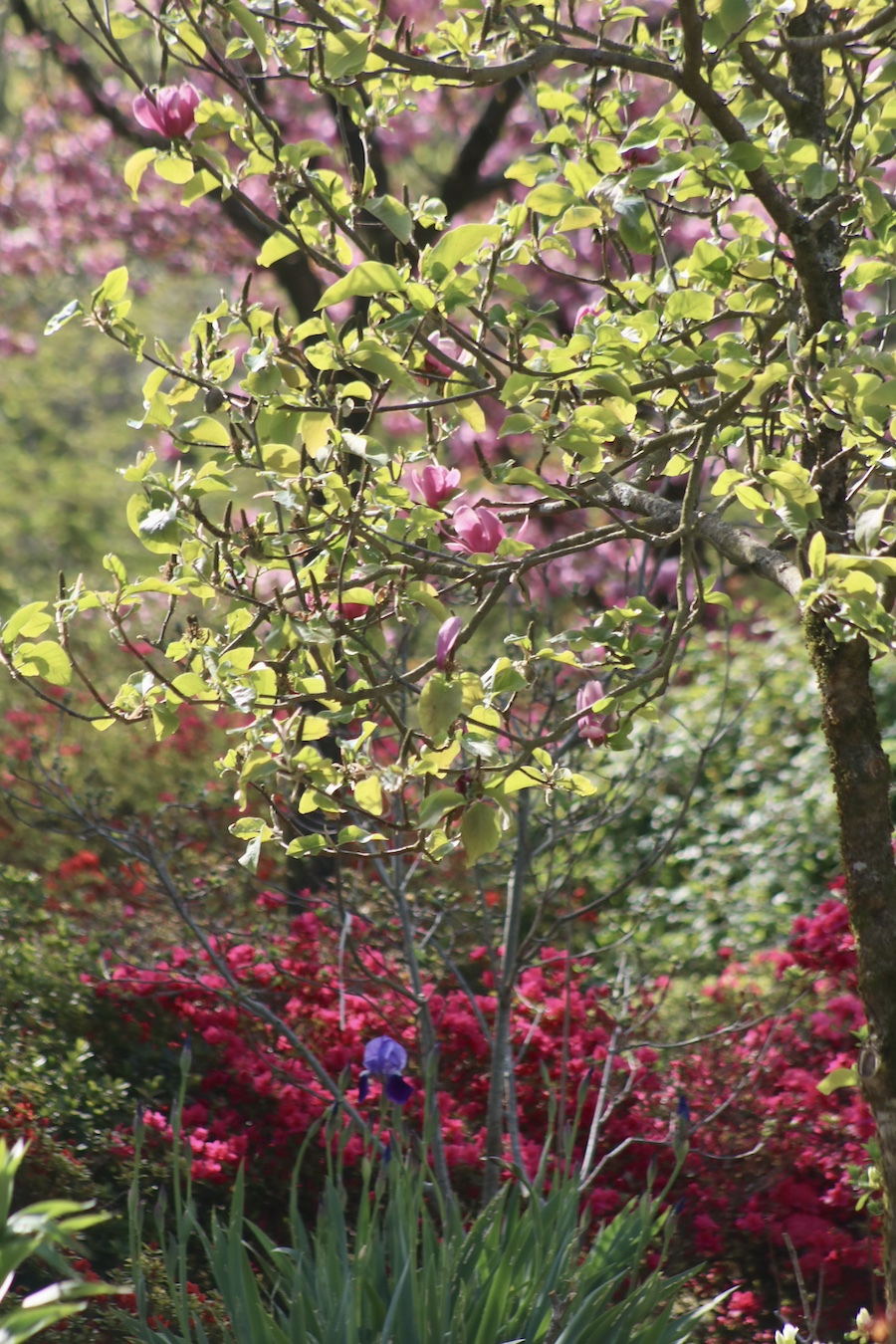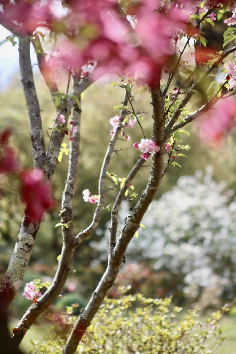 Dann stehen wir vor einem Teich und vor üppigst blühenden Kirschbäumen, darunter auch wunderschöne, tiefrosa blühende japanische Kirschbäume. Kamelien, Flieder, seltene Rosen, Tulpen, Pfingstrosen, Spireen. Und so viel mehr. Mein Herz hüpft. Und dann bleibt mein Auge an einer bestimmten Szenerie hängen: Zartblühende Kirschbäume in weiß und rosa, Azaleen in kräftigen Farben, dazwischen das zarte Frühlingsgrün. Ich habe das Gefühl auf eine Malerei des Impressionisten Claude Monet zu blicken. Oder nein, vielmehr fühlt es sich an wie der Spaziergang durch ein lebendiges Gemälde. Dieser Garten verzaubert. Es ist kein Ort, den man „abarbeitet“ – eher einer, in dem man sich treiben lässt.