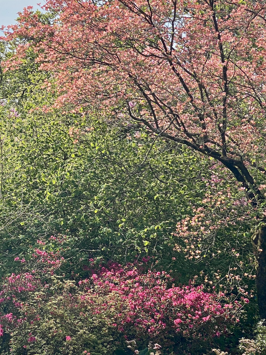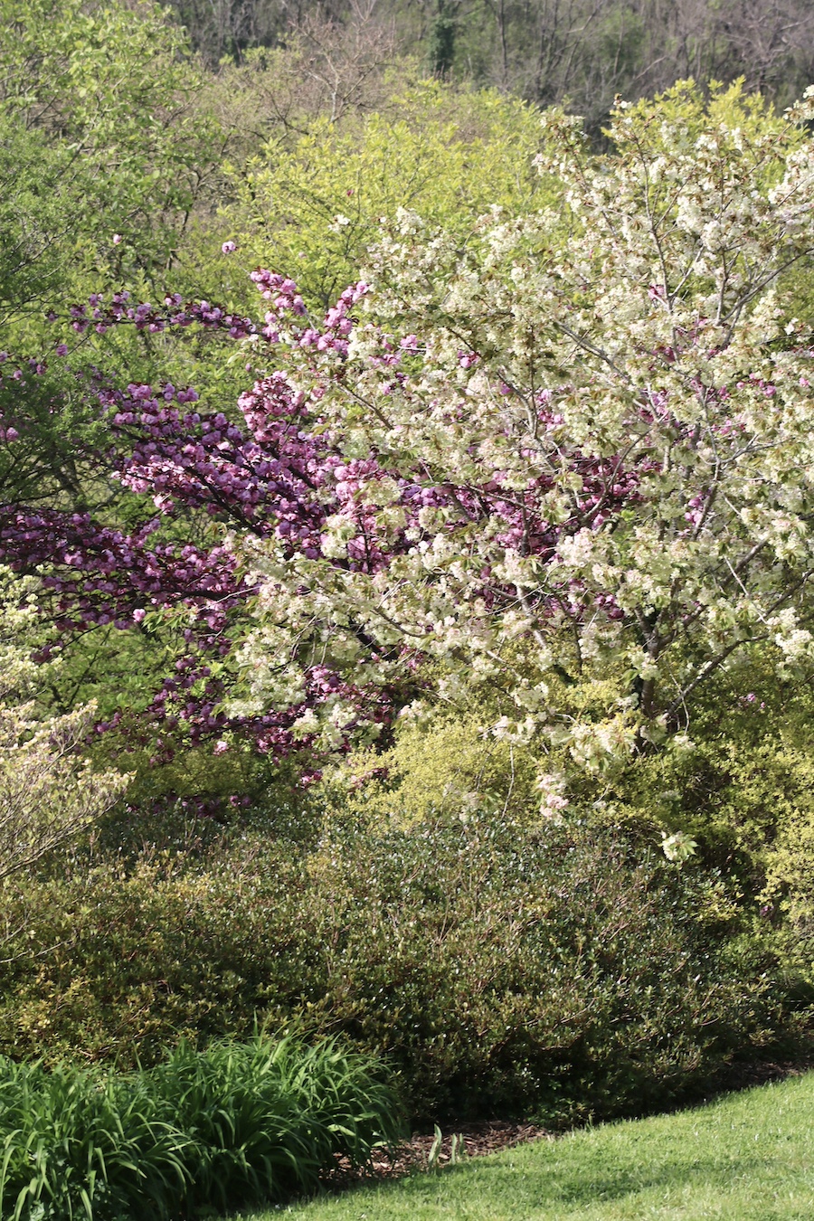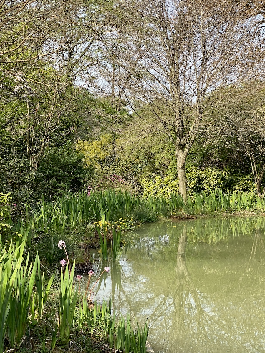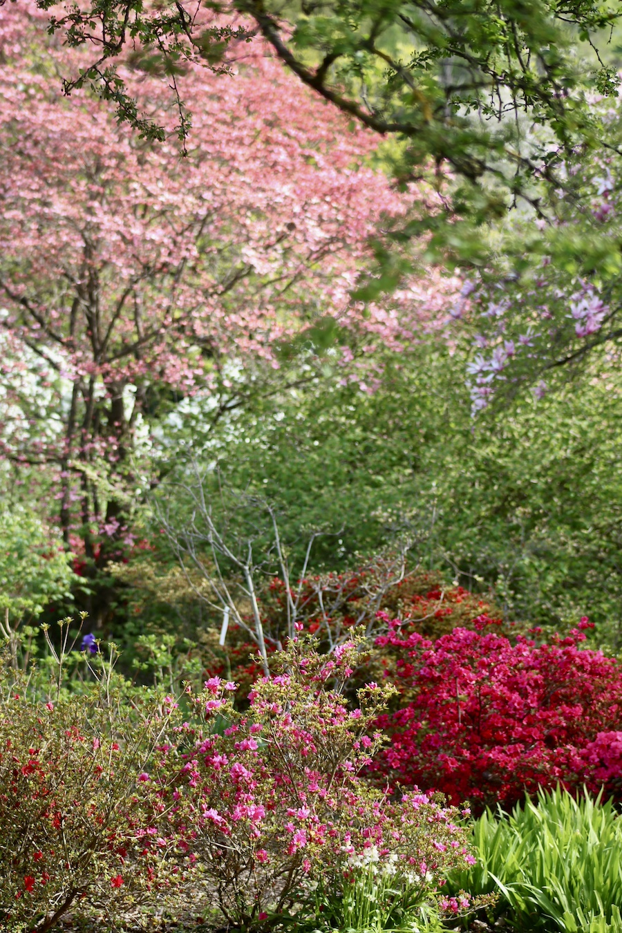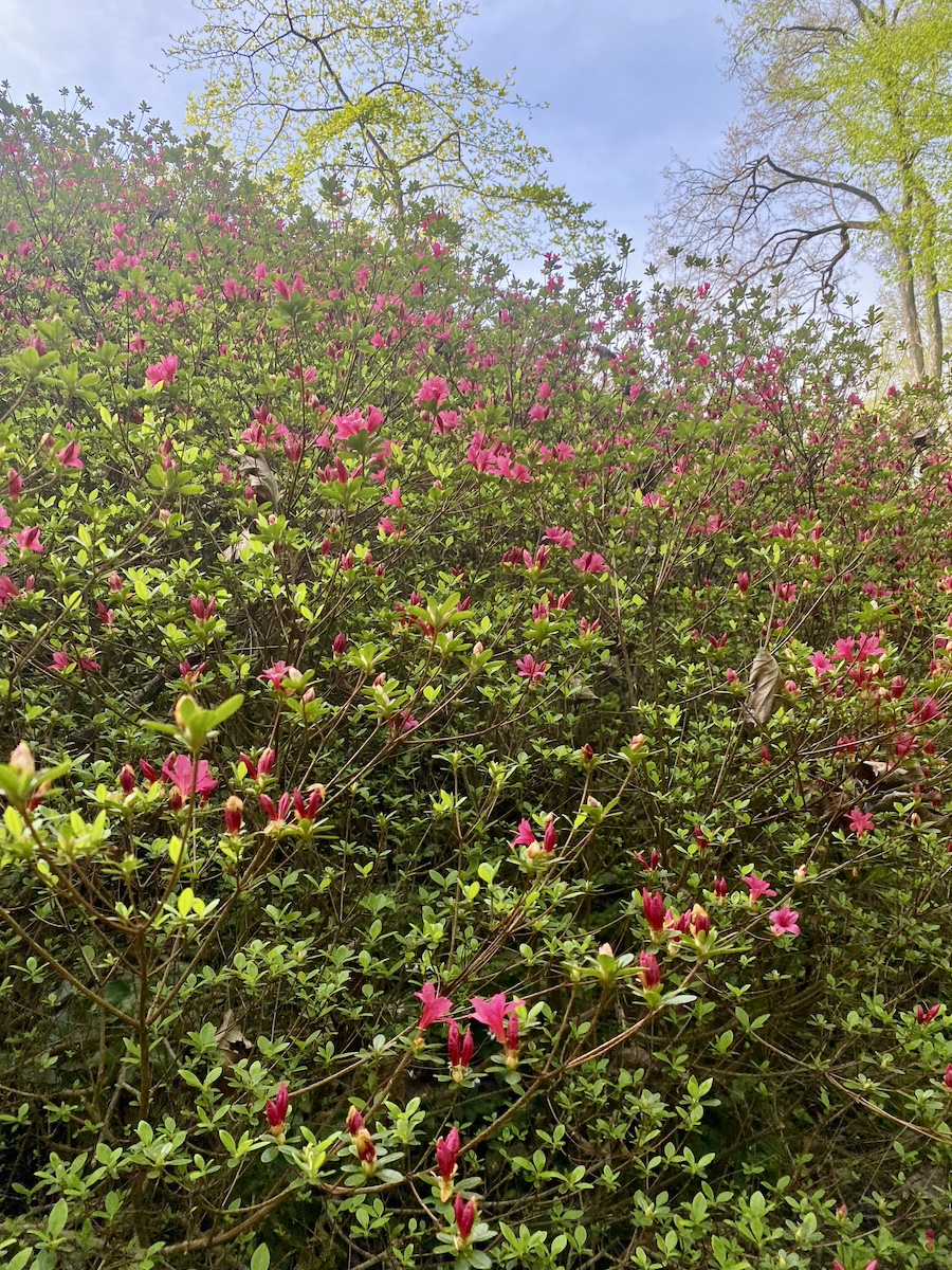 Dann stehen wir vor einem Teich und vor üppigst blühenden Kirschbäumen, darunter auch wunderschöne, tiefrosa blühende japanische Kirschbäume. Kamelien, Flieder, seltene Rosen, Tulpen, Pfingstrosen, Spireen. Und so viel mehr. Mein Herz hüpft. Und dann bleibt mein Auge an einer bestimmten Szenerie hängen: Zartblühende Kirschbäume in weiß und rosa, Azaleen in kräftigen Farben, dazwischen das zarte Frühlingsgrün. Ich habe das Gefühl auf eine Malerei des Impressionisten Claude Monet zu blicken. Oder nein, vielmehr fühlt es sich an wie der Spaziergang durch ein lebendiges Gemälde. Dieser Garten verzaubert. Es ist kein Ort, den man „abarbeitet“ – eher einer, in dem man sich treiben lässt.
