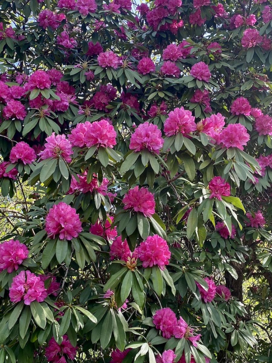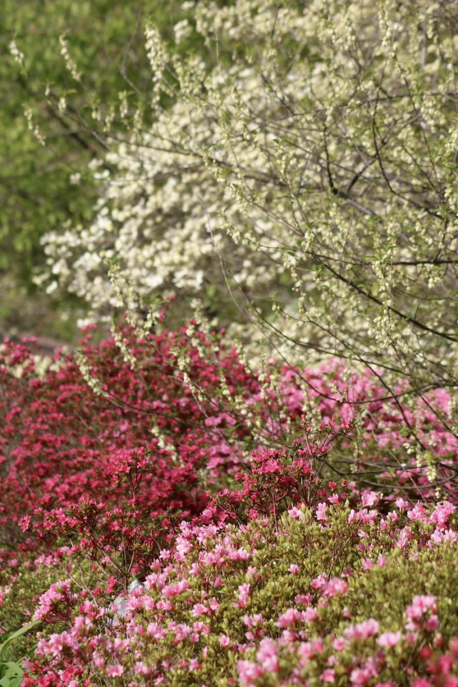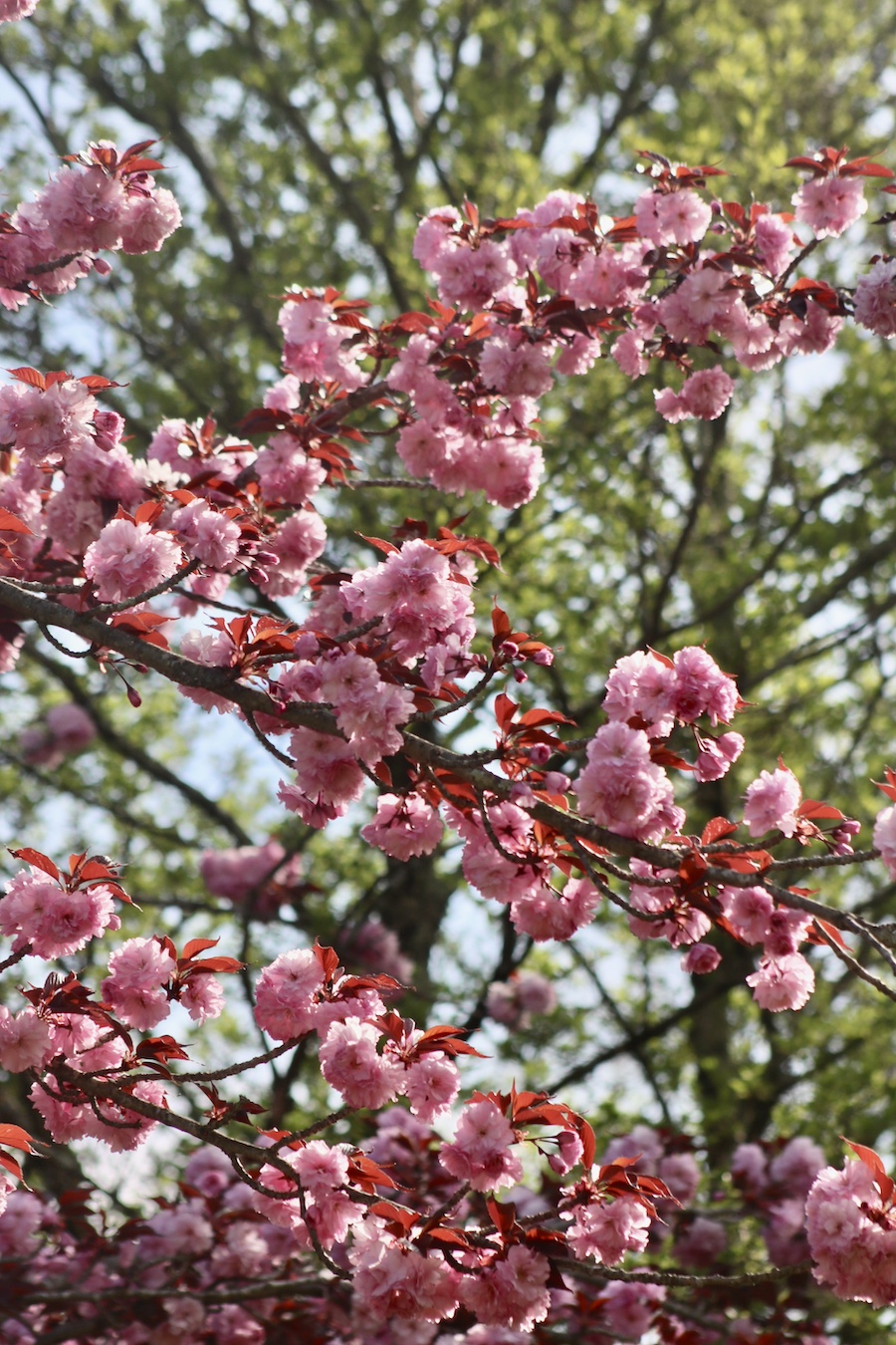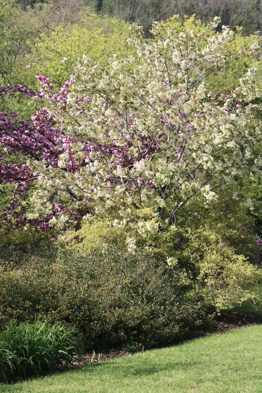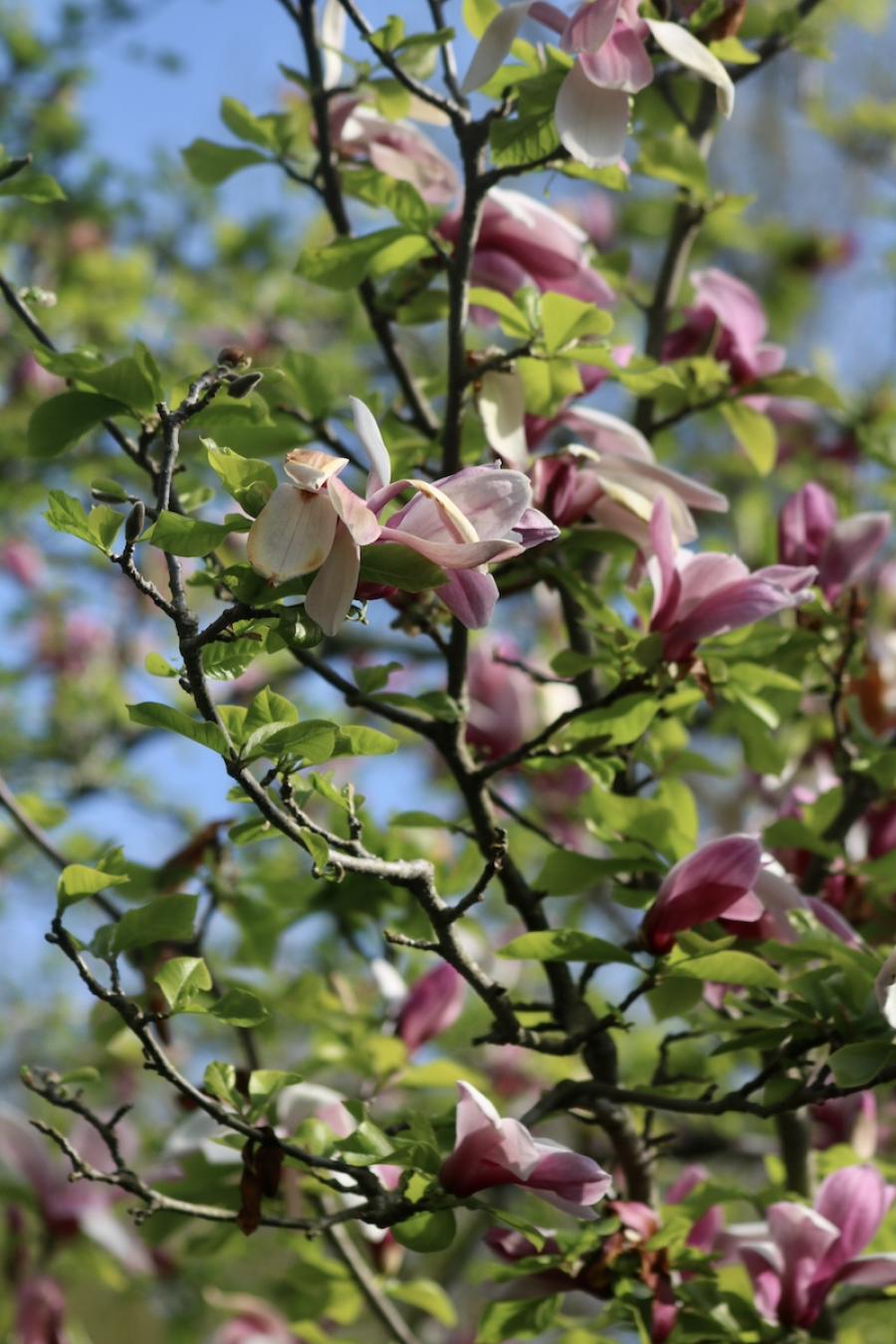 Dann stehen wir vor einem Teich und vor üppigst blühenden Kirschbäumen, darunter auch wunderschöne, tiefrosa blühende japanische Kirschbäume. Kamelien, Flieder, seltene Rosen, Tulpen, Pfingstrosen, Spireen. Und so viel mehr. Mein Herz hüpft. Und dann bleibt mein Auge an einer bestimmten Szenerie hängen: Zartblühende Kirschbäume in weiß und rosa, Azaleen in kräftigen Farben, dazwischen das zarte Frühlingsgrün. Ich habe das Gefühl auf eine Malerei des Impressionisten Claude Monet zu blicken. Oder nein, vielmehr fühlt es sich an wie der Spaziergang durch ein lebendiges Gemälde. Dieser Garten verzaubert. Es ist kein Ort, den man „abarbeitet“ – eher einer, in dem man sich treiben lässt.