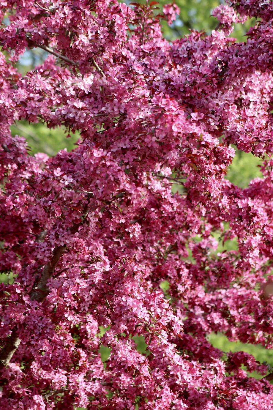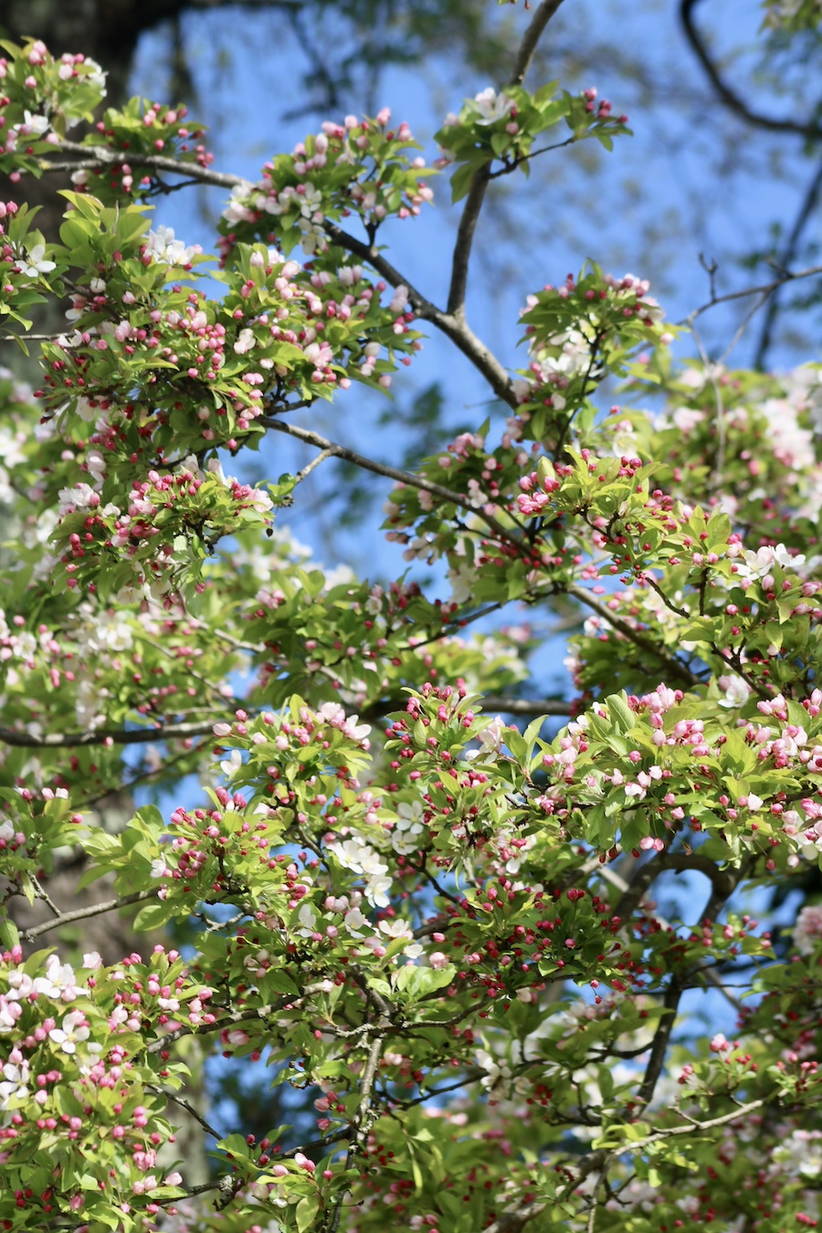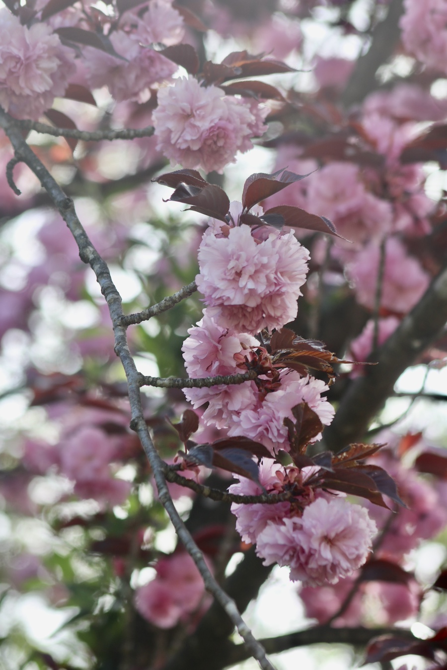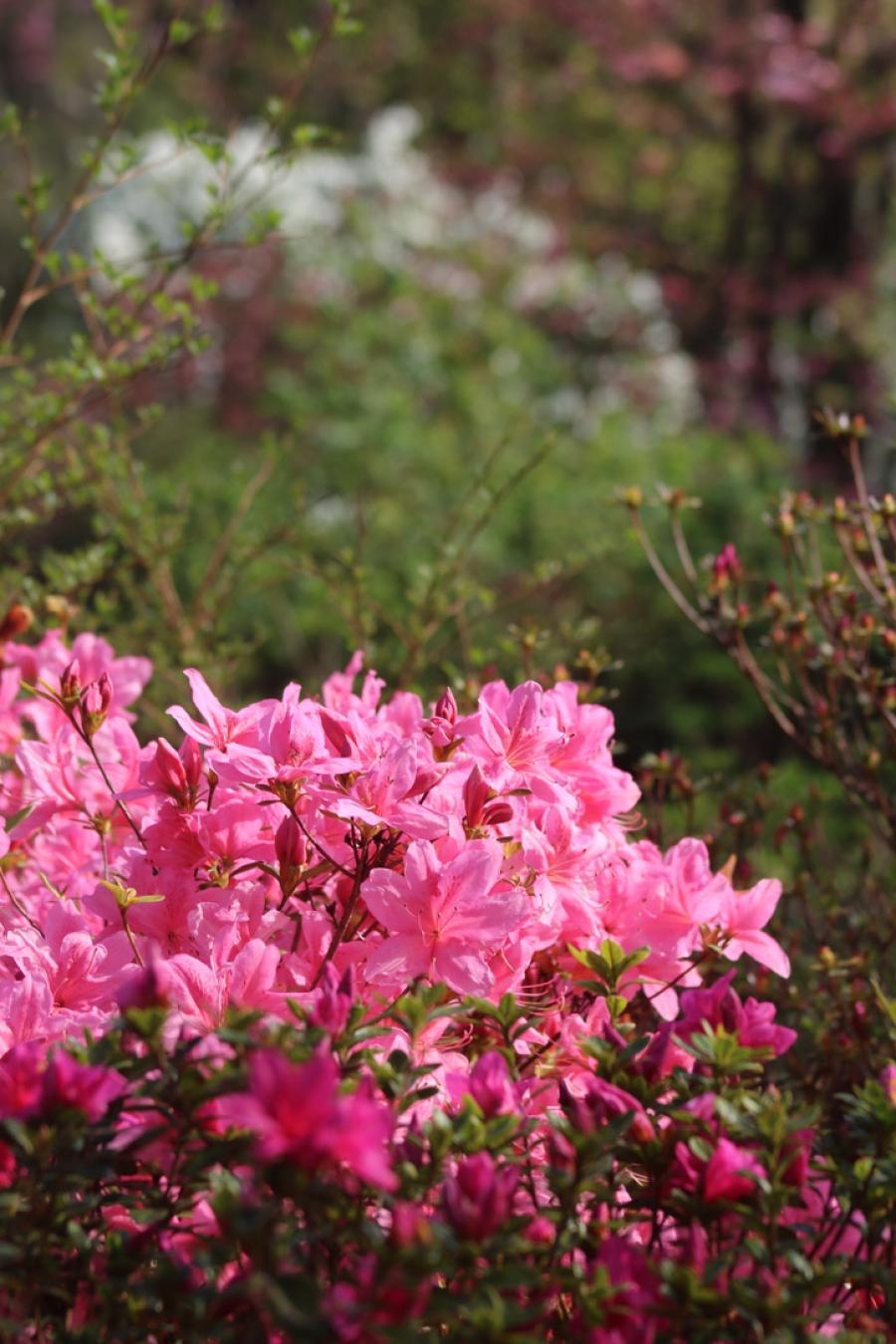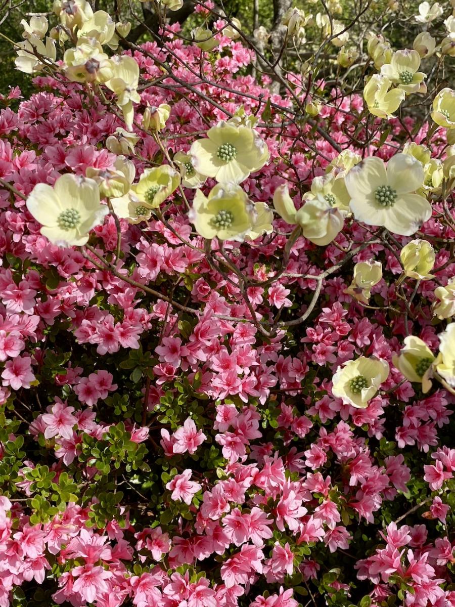 Dann stehen wir vor einem Teich und vor üppigst blühenden Kirschbäumen, darunter auch wunderschöne, tiefrosa blühende japanische Kirschbäume. Kamelien, Flieder, seltene Rosen, Tulpen, Pfingstrosen, Spireen. Und so viel mehr. Mein Herz hüpft. Und dann bleibt mein Auge an einer bestimmten Szenerie hängen: Zartblühende Kirschbäume in weiß und rosa, Azaleen in kräftigen Farben, dazwischen das zarte Frühlingsgrün. Ich habe das Gefühl auf eine Malerei des Impressionisten Claude Monet zu blicken. Oder nein, vielmehr fühlt es sich an wie der Spaziergang durch ein lebendiges Gemälde. Dieser Garten verzaubert. Es ist kein Ort, den man „abarbeitet“ – eher einer, in dem man sich treiben lässt.