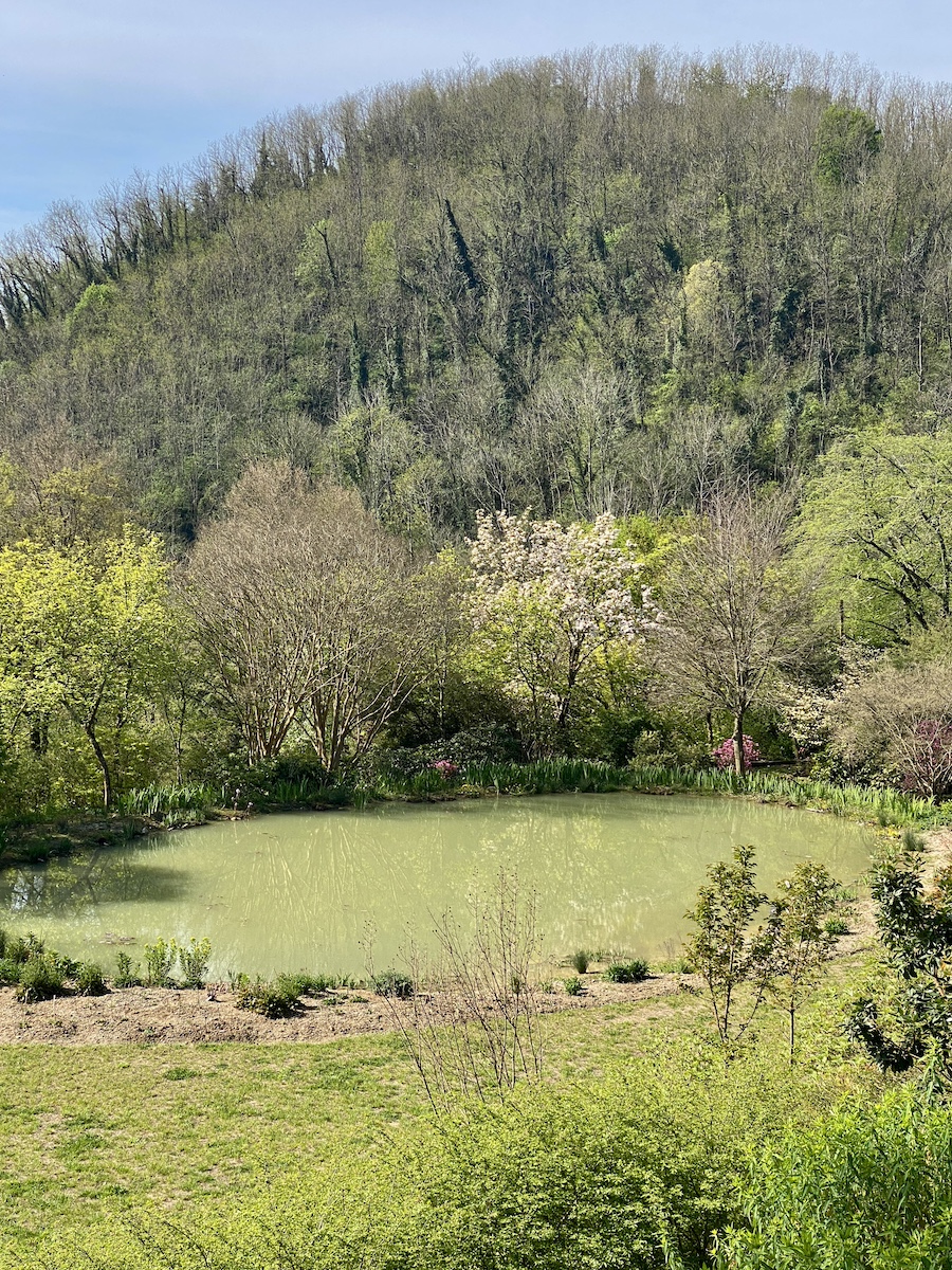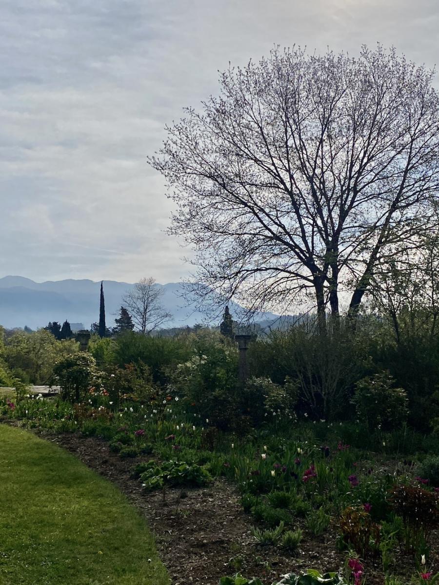 Es ist Ostermontag und der Giardino Viatori hat erst vor ein paar Tagen nach der Winterpause wieder seine Pforten geöffnet. 9 Uhr morgens und wird sind extra früh aufgestanden, um hier rechtzeitig aus dem rund 50 Autominuten entfernten Udine anzukommen. Und dann sind wir fast ein wenig überrascht, dass wir nicht die einzigen early birds sind. Rund um uns stehen rund 20 weitere Pflanzenfreund:innen, bereit den Giardino zu erkunden – und das ist hier nur im Rahmen einer Führung möglich (die auf Italienisch stattfand). Was mir als erstes auffällt: Was für einen schönen Ausblick auf Görz, die Burg, den Isonzo, den Karst und die Voralpen man hier hat, auch wenn uns jetzt noch ein wenig der Morgendunst trennt. Luciano „Lucio“ Viatori hat sich den perfekten Ort ausgesucht. Seine Vision: auf dem Grundstück von 25.000 Quadratmetern einen Landschaftsgarten nach englischem Vorbild zu schaffen – inspiriert vom 19. Jahrhundert, aber verwurzelt im friaulischen Boden.