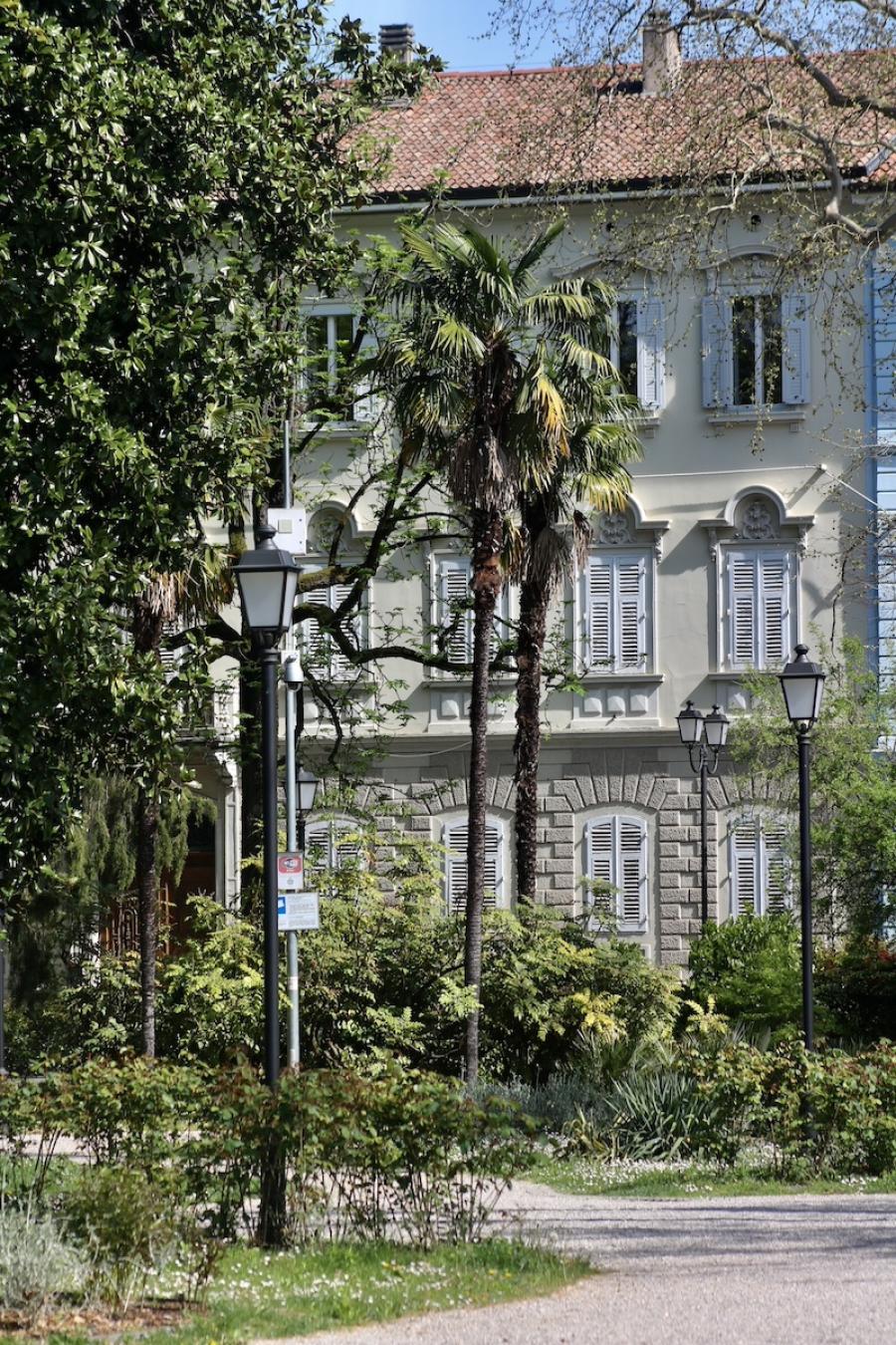 Die Grenzstadt Gorizia (auch als Görz bekannt) trug in Zeiten der Monarchie den Beinamen „österreichisches Nizza“. Und das nicht nur aufgrund der vielen farbigen, pastelligen Fassaden, ähnlich wie im südfranzösischen Nizza, sondern diesen Beinamen verdankte die Stadt auch dem vergleichsweise milden, fast submediterranen Klima: Warme Luftströme aus dem Mittelmeerraum treffen hier auf kühlere Einflüsse aus dem Norden. Dieses Klima galt schon im 19. Jahrhundert als gesundheitsfördernd und so wurde Görz bereits in der Zeit der Habsburgermonarchie zu einem beliebten Winter- und Kurort für wohlhabende Bürger:innen aus Wien, Triest oder Prag. Parks und Gärten waren also nicht nur zur Zierde gedacht, sondern auch Teil eines Lebensstils, der zur Heilung beitragen sollte: Frische Luft, Spaziergänge, gepflegte Natur. Breite Alleen, öffentliche Parks und gepflegte Grünanlagen gehörten somit zum Stadtbild in Gorizia. Davon zeugen auch heute noch die Giardini Pubblici di Gorizia, ein klassischer Stadtpark mit Denkmälern, schattigen Wegen und exotischen Pflanzen.