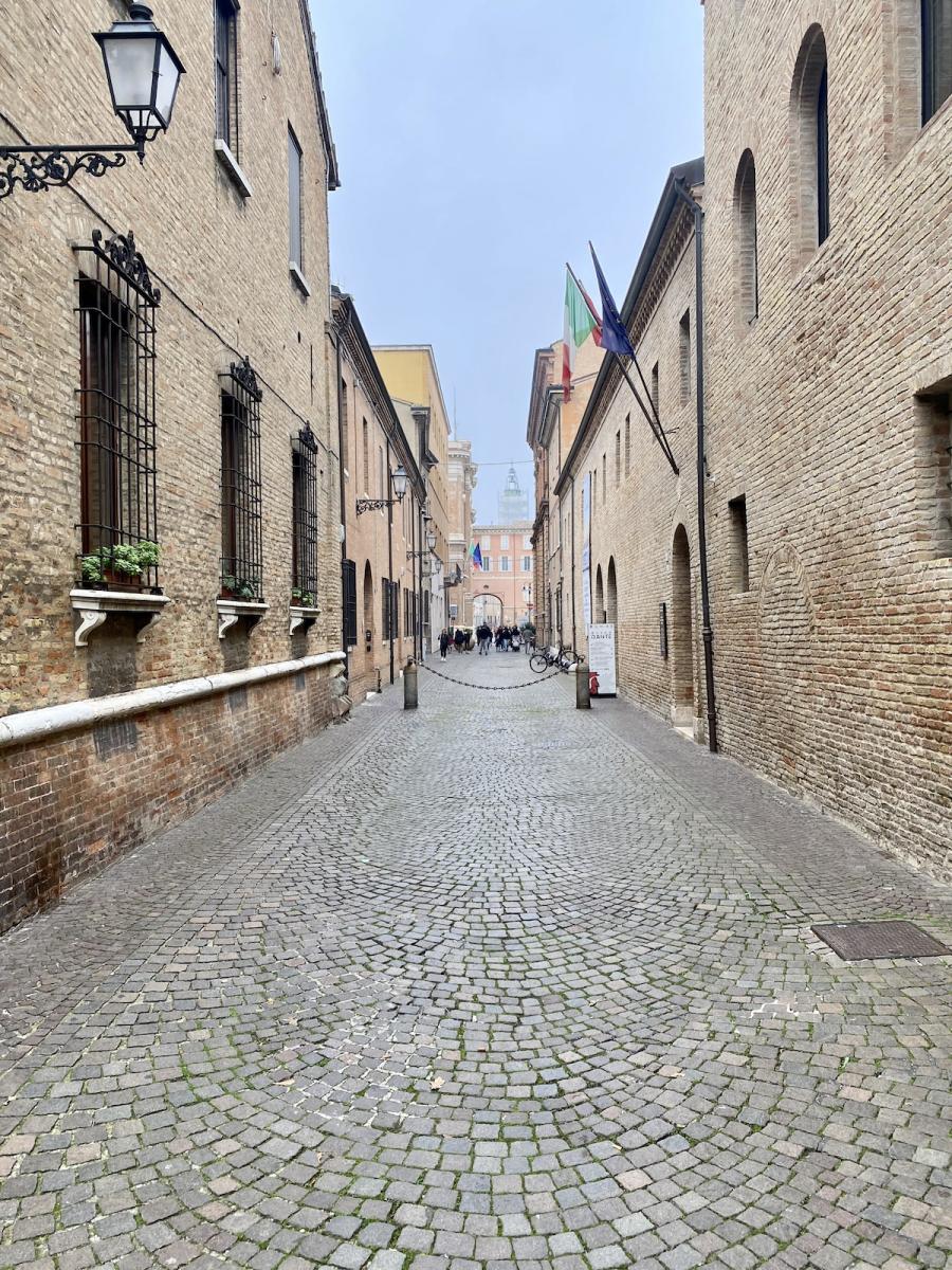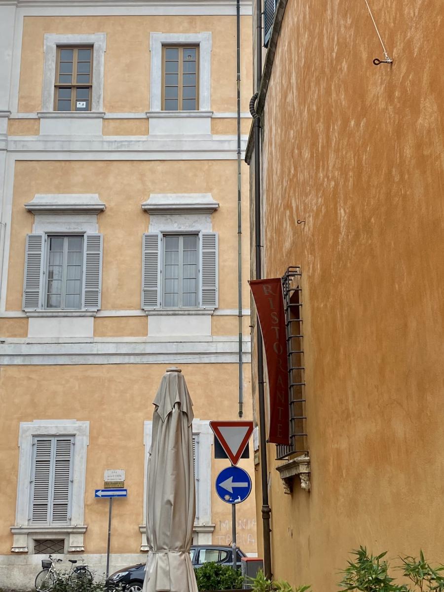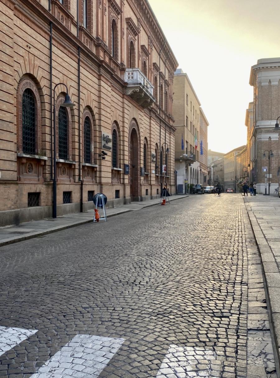 Klingt alles ziemlich schwer und bedeutsam, aber wenn man heute durch Ravenna geht, präsentiert sich die Stadt, abseits ihres historischen Erbes, sehr lebendig und lebensfroh. Auch wenn der graue Himmel die Stimmung in der Stadt an diesem Novembersonntag noch ein wenig zu drücken scheint, schon wenige Stunden später kommt die Sonne heraus und lässt die Altstadt – mit ihren pastelligen und auch immer wieder in kräftigeren Rot-Tönen gehaltenen Fassaden – gleich viel lebenslustiger herüberkommen. Zumeist kommen Reisende ja aus einem ganz speziellen Grund – wegen der prächtigen und so großartig erhaltenen frühchristlichen und byzantinischen Mosaiken – nach Ravenna. Damit allein wird man der Stadt aber so gar nicht gerecht, wie zumindest ich finde. Denn die kompakte und gut erhaltene Altstadt ist durchaus charmant und liebenswert und es lohnt sich abseits der üblichen Mosaiken-Stopps auch ein bisschen durch die Altstadtgassen zu schlendern und einfach mal die Stimmung dieser Stadt, die spannenderweise (zumindest bei unserem Besuch im November) so gar nicht touristisch herüberkommt, in sich aufzunehmen. Prächtige Palazzi, mächtige Tore, schöne Türen, bunte Fassaden, hübsche, belebte Plätze mit gut besuchten Caffès – das alles macht Ravennas angenehme Atmosphäre aus und Lust sich hier einfach ein bisschen treiben zu lassen.