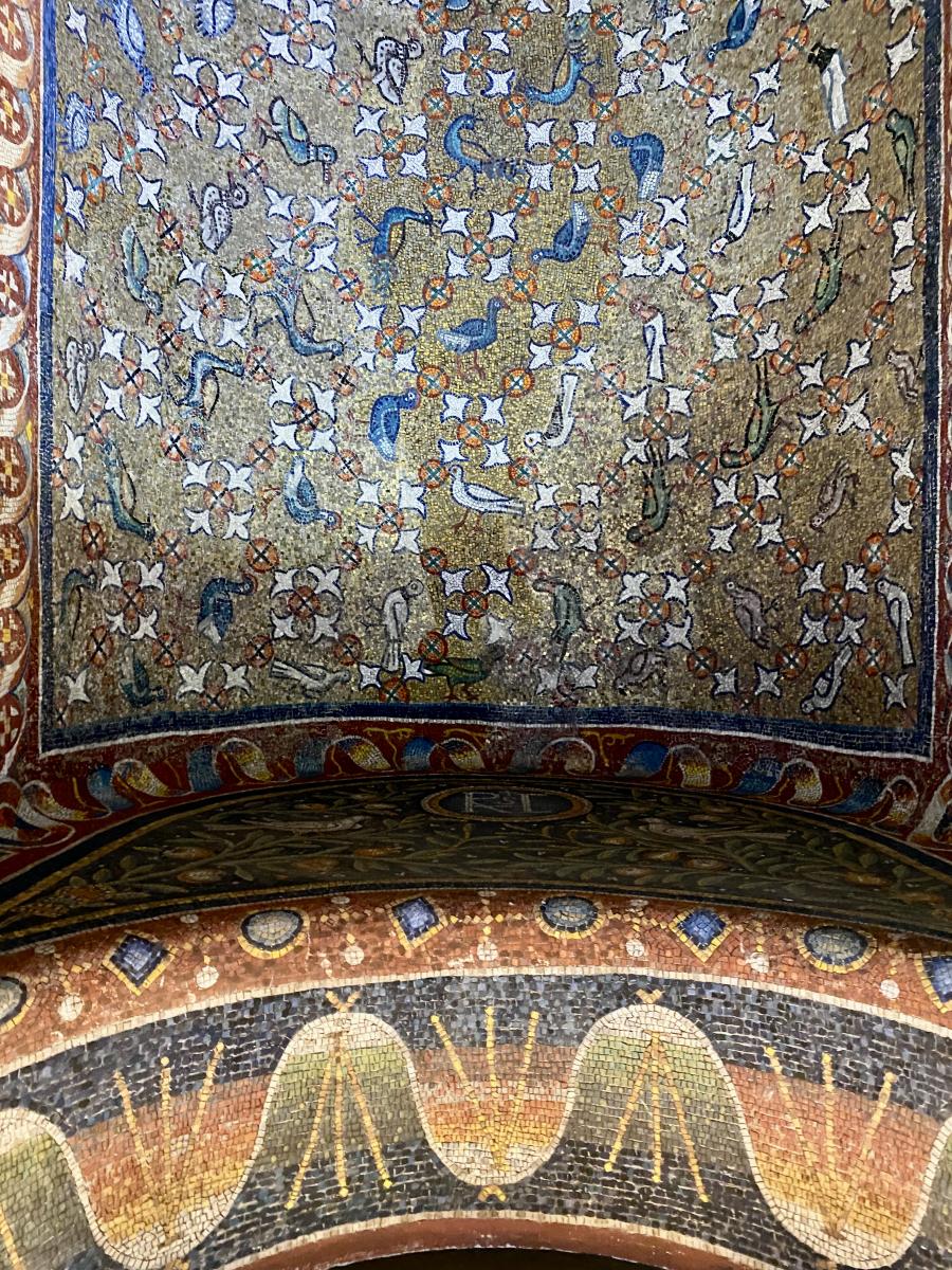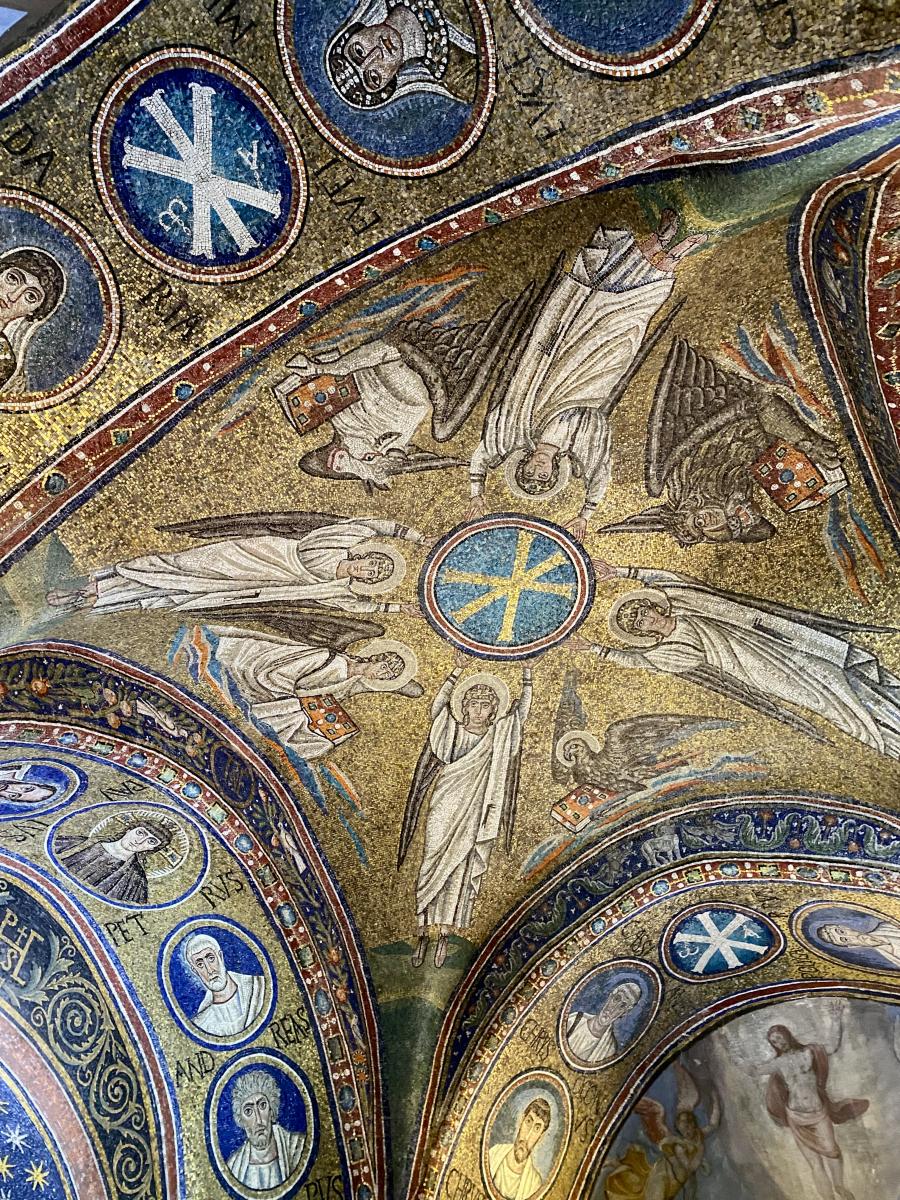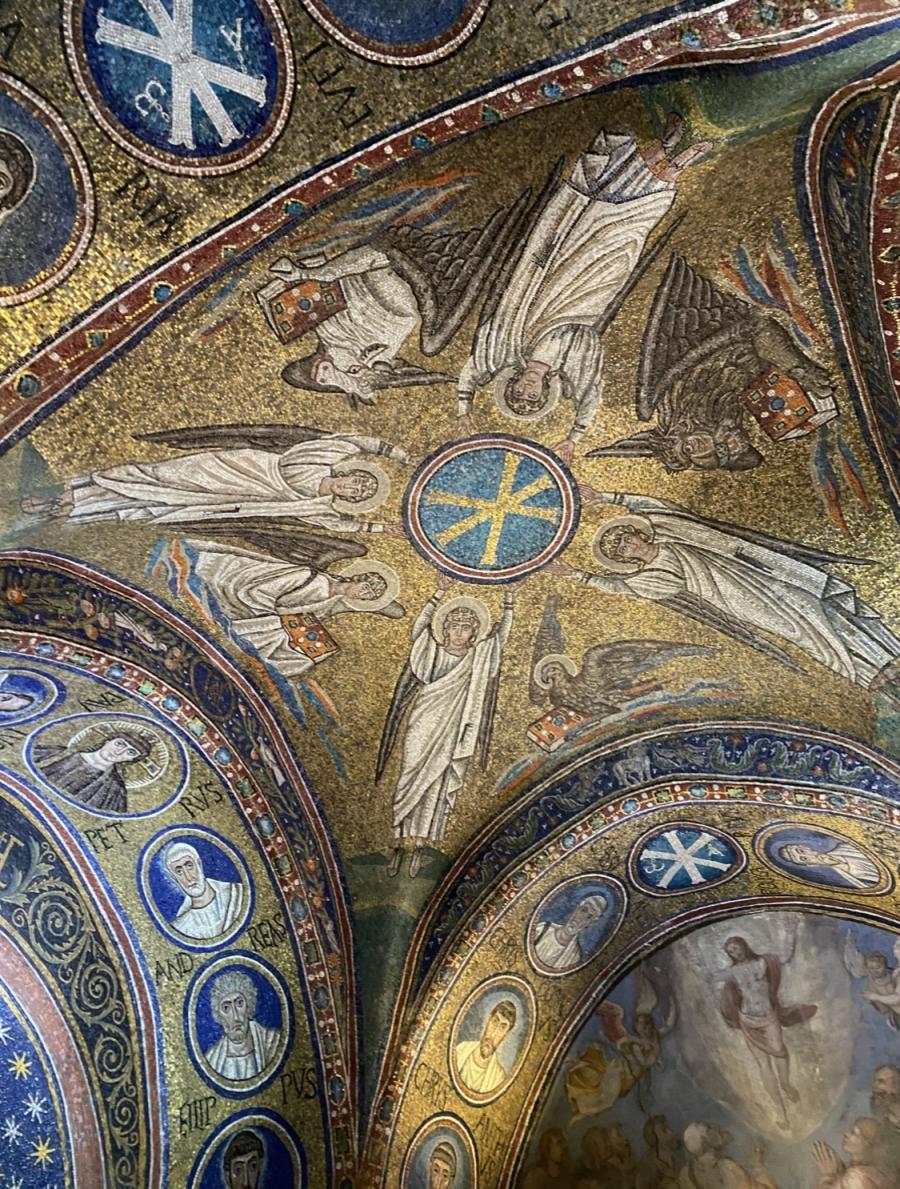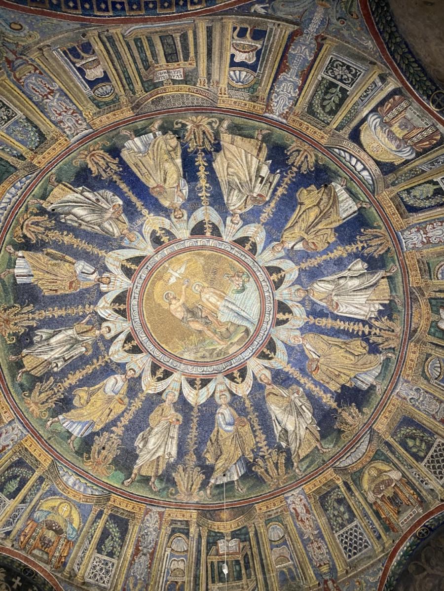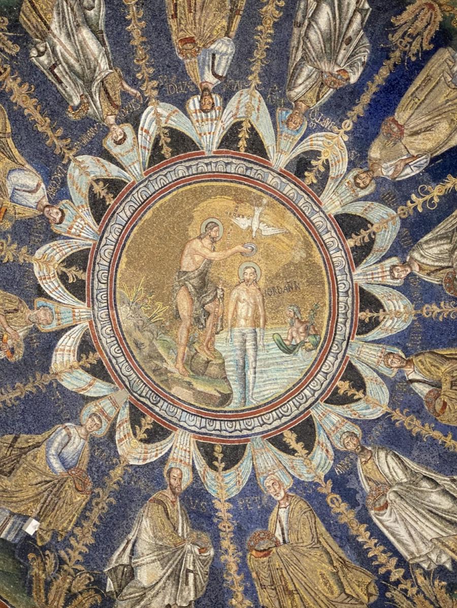 Und dann heißt es: Kopf in den Nacken! In der mit Mosaiken gestalteten Kuppel ist ein großes Medaillon mit der Taufe Christi zu sehen: Jesus steht im Fluss Jordan, neben ihm Johannes der Täufer, der ein Kreuz hält und mit der anderen Hand Wasser über Jesus Kopf schüttet. Rund um das Medaillon dann zwei darum herum verlaufende Friese, im inneren Fries sieht man die zwölf Apostel. Es gibt hier noch viel mehr Beeindruckendes zu sehen und mein Tipp ist, einen guten Kunst-Reiseführer dabei zu haben, um sich vorher schon ein wenig einzulesen – denn, wie gesagt, drinnen muss es dann aufgrund der recht knapp bemessenen Time Slots schnell gehen.