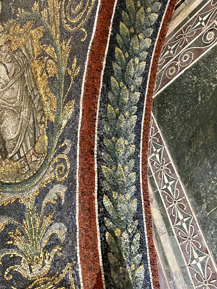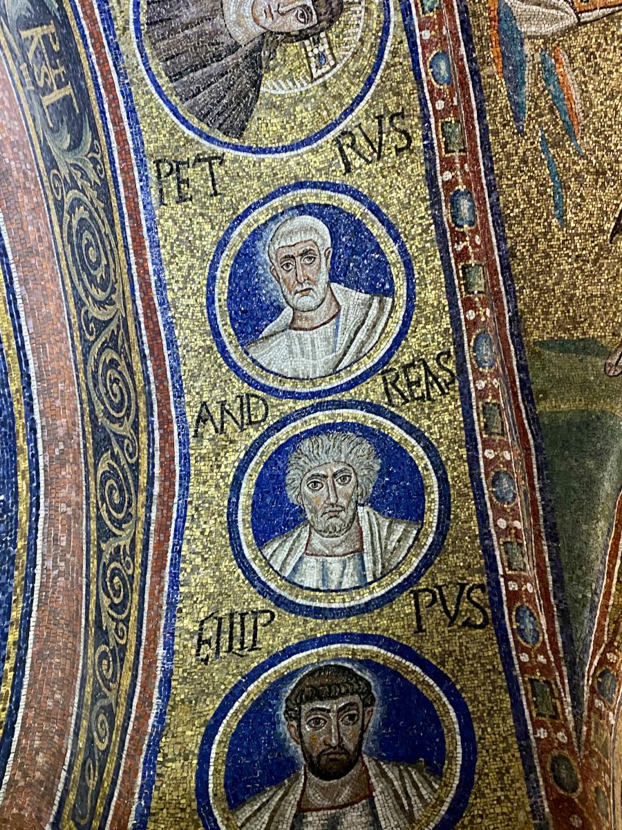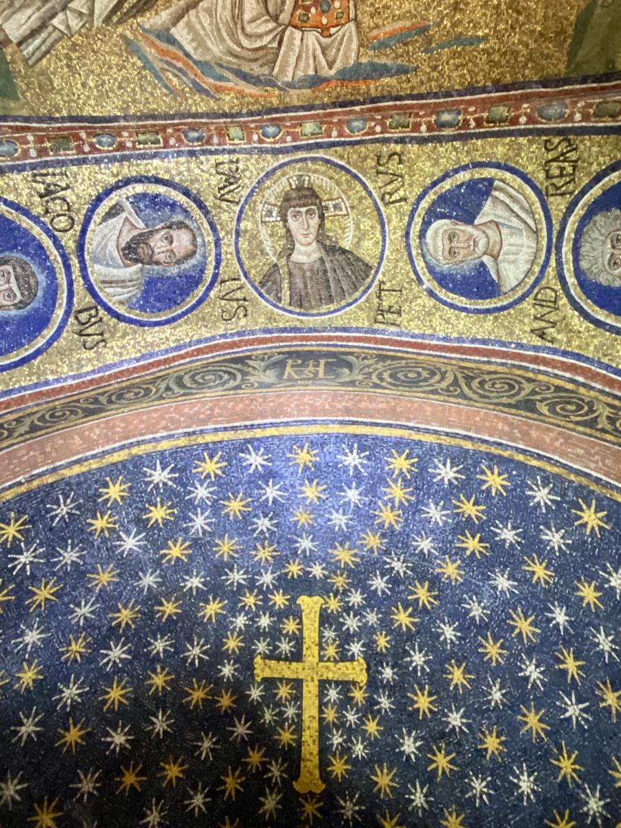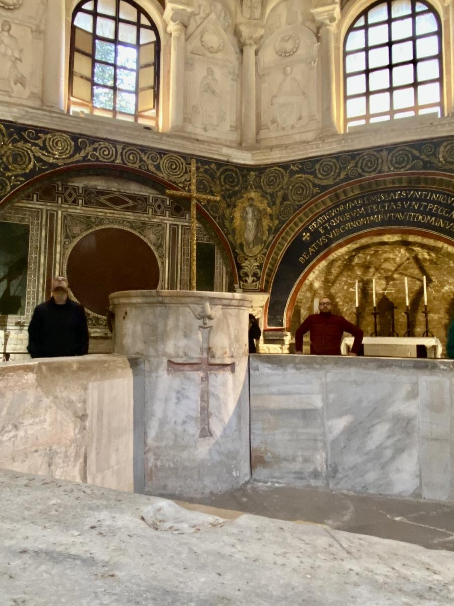 Und dann heißt es: Kopf in den Nacken! In der mit Mosaiken gestalteten Kuppel ist ein großes Medaillon mit der Taufe Christi zu sehen: Jesus steht im Fluss Jordan, neben ihm Johannes der Täufer, der ein Kreuz hält und mit der anderen Hand Wasser über Jesus Kopf schüttet. Rund um das Medaillon dann zwei darum herum verlaufende Friese, im inneren Fries sieht man die zwölf Apostel. Es gibt hier noch viel mehr Beeindruckendes zu sehen und mein Tipp ist, einen guten Kunst-Reiseführer dabei zu haben, um sich vorher schon ein wenig einzulesen – denn, wie gesagt, drinnen muss es dann aufgrund der recht knapp bemessenen Time Slots schnell gehen.