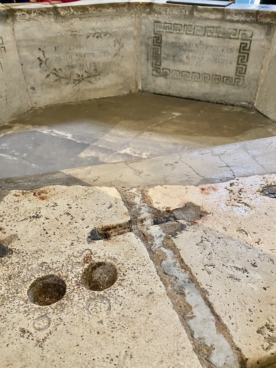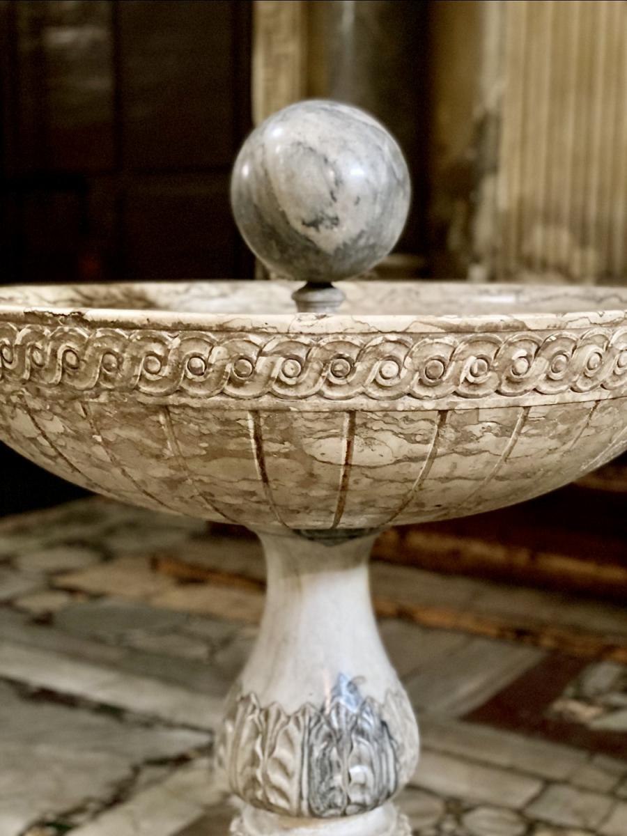 Ebenfalls achteckig ist der (Marmor-)Taufbrunnen in der Mitte des Raums: Er stammt aus dem 13. Jahrhundert, im 16. Jahrhundert wurde das Becken neu errichtet, wobei ältere Teile wiederverwendet wurden. Noch aus der Zeit der Errichtung der Kapelle, also aus dem 5. Jahrhundert, stammt der Ambo, an dem der Priester die Taufzeremonie leitete.