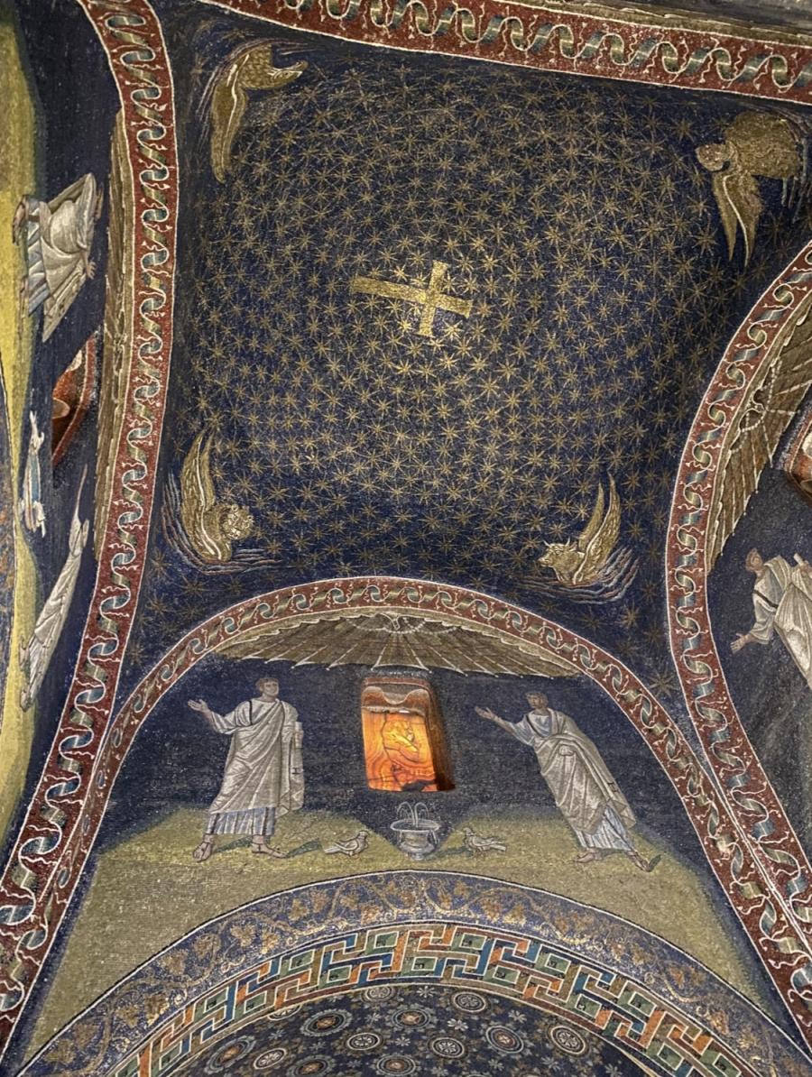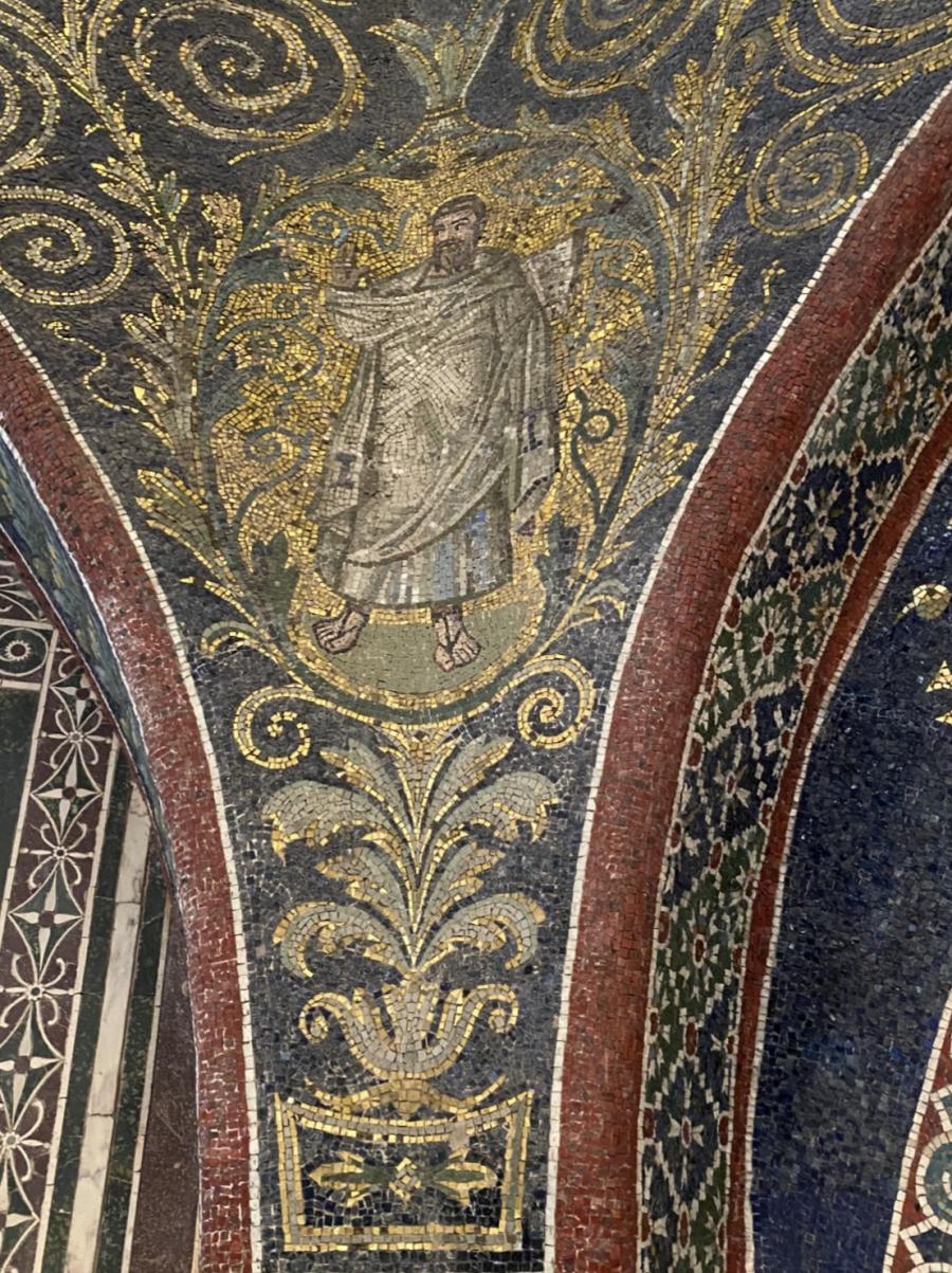 Zurück zu unserer ersten Mosaiken-Station: dem Battisterio Neoniano, der zur Kathedrale gehörenden Taufkapelle, einem achteckigen Ziegelbau, der von außen sehr unscheinbar wirkt. Die Kapelle ist das älteste erhaltene Bauwerk der Stadt und als wir dieses, in kleiner Gruppe zum gewählten time slot-Zeitpunkt, betreten, verschlägt es uns erst mal die Sprache. Wohin soll man zuerst blicken? Man weiß es eigentlich nicht. Da wir aber nur ca. 10 Minuten herinnen bleiben dürfen (denn draußen wartet schon die nächste Gruppe), muss man die Augen schnell dazu bringen ausgiebig herumzuwandern über diese unglaubliche Mosaiken-Pracht an den Wänden und im Gewölbe, die in der 2. Hälfte des 5. Jahrhunderts entstanden ist (und zum UNESCO-Welterbe gehört).