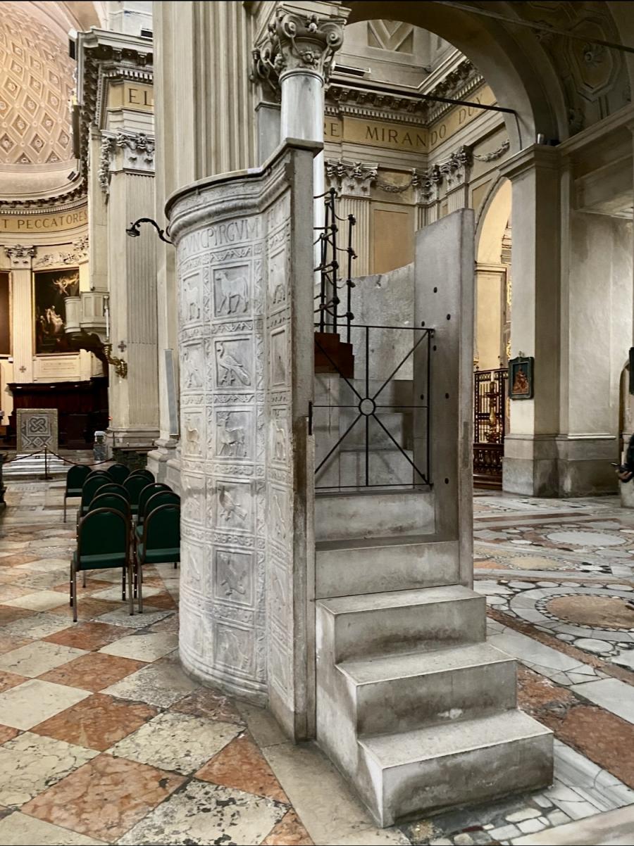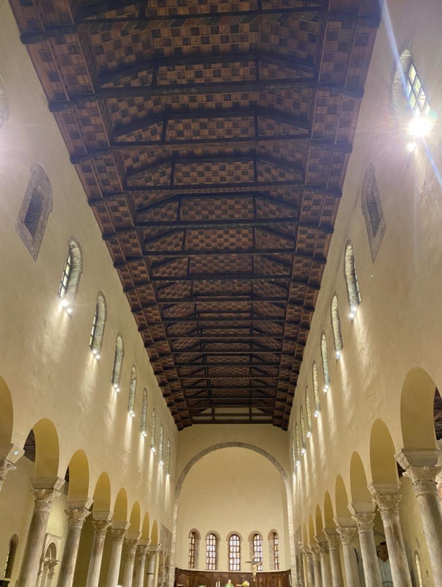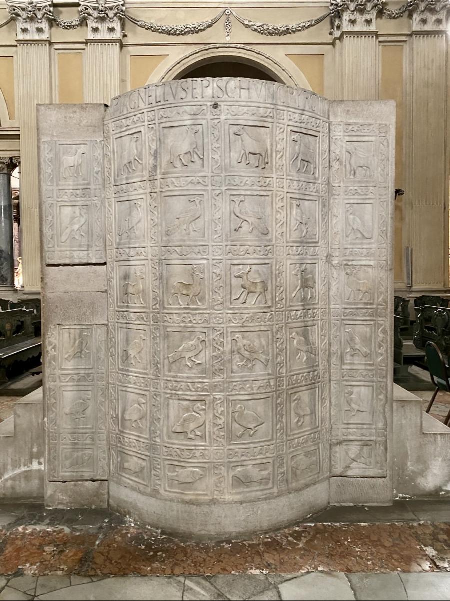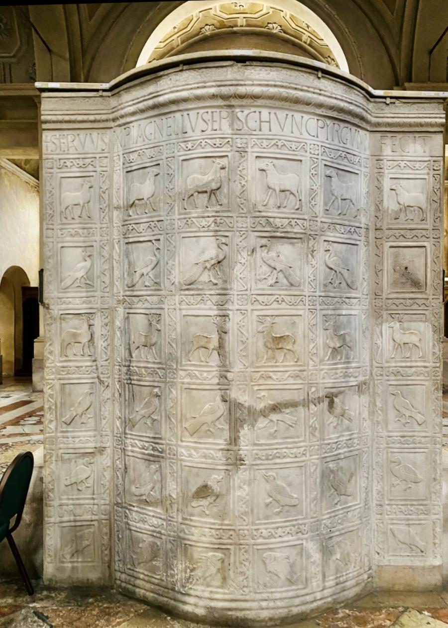 Ein absolutes Highlight ist aber – auf der rechten Seite des Langhauses – der kostbare Ambo des Bischofs Agnellus: Diese Lesekanzel in Form eines Ambos wurde aus griechischem Marmor gearbeitet und zwischen 557 und 570 für die antike Basilika errichtet. Später wurde sie zerlegt, ihre Teile wurden in den Mauern des barocken Chorraums eingebaut. Anfang des 20. Jahrhunderts wurde sie jedoch rekonstruiert und wieder aufgestellt. Wer sich die Kanzel aus nächster Nähe ansieht, wird Tiere auf den Flachreliefs, die sich an beiden Seiten befinden, entdecken. Insgesamt zählt die Kanzel rund 36 solcher Rechteckfelder mit Tierdarstellungen.