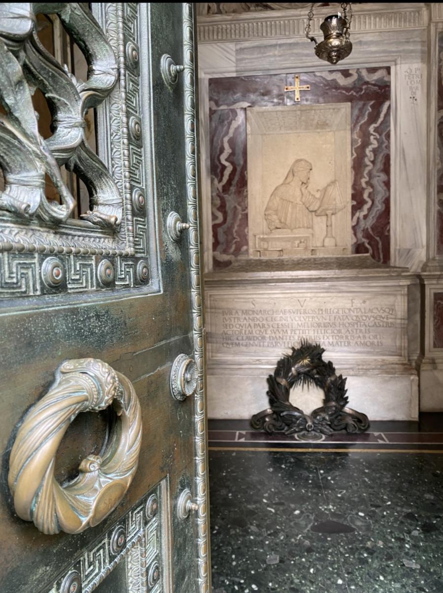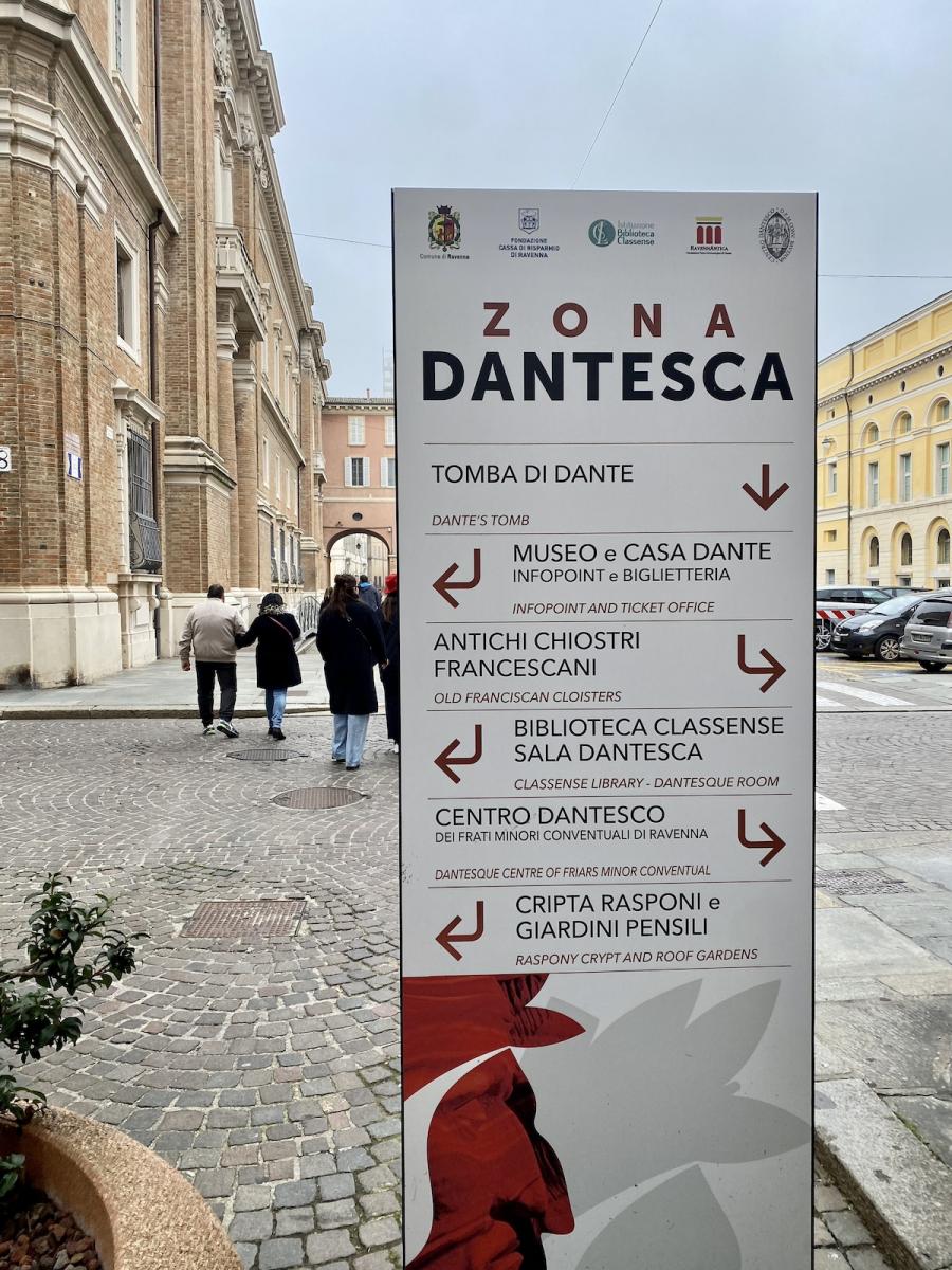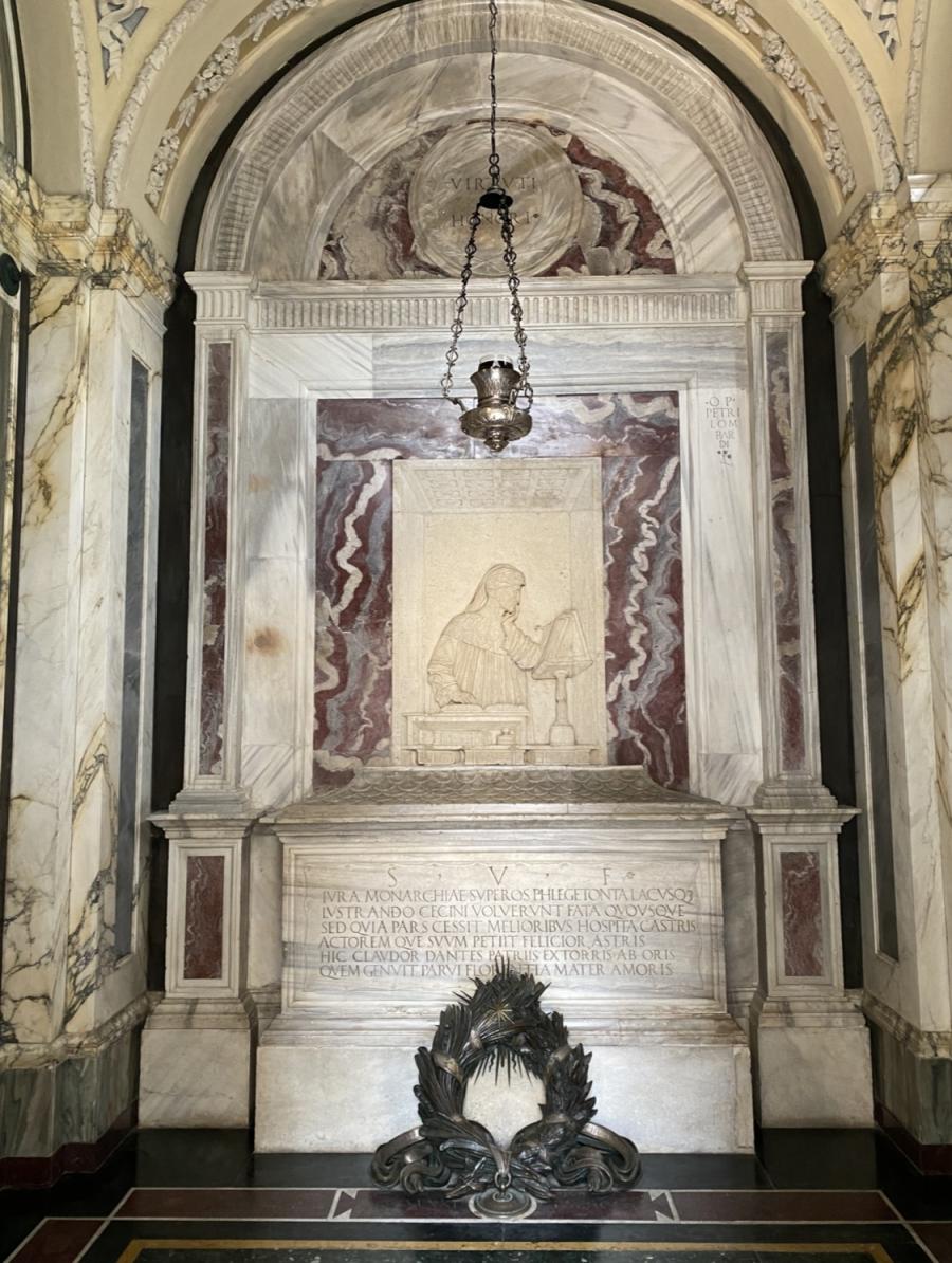Angeblich sollen in der Kirche die Begräbnisfeierlichkeiten für den Dichter und Philosophen Dante Alighieri (geboren ca. 1265 in Florenz, verstorben 1321 in Ravenna; bekanntestes Werk „Die Göttliche Komödie“) stattgefunden haben. Was irgendwie nicht verwundern würde, schließlich befindet sich sein Grabmal in nächster Nähe – und das müssen wir uns natürlich auch ansehen. Eine kleine Schlange hat sich davor schon gebildet, aber dann können auch wir einen Blick auf das Tomba di Dante werfen: Hier steht Dante Alighieris Marmorbüste, in einem kleinen, sehr weiß gehaltenen, neoklassizistischen Tempel. Nur ein paar Meter entfernt befindet sich das Museo Dante, in dem man alles über das Lebenswerk des berühmten Dichters und Philosophen erfährt. Wir werfen einen kurzen Blick in den schönen Innenhof, kaufen ein paar Postkarten mit Dante-Motiv und das war´s dann auch schon wieder, für mehr haben wir schlichtweg nicht genug Zeit.