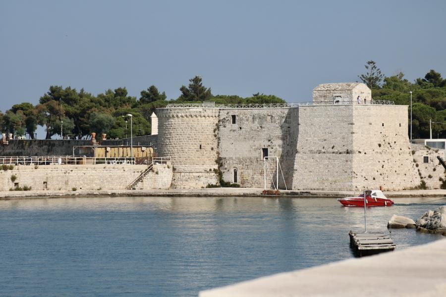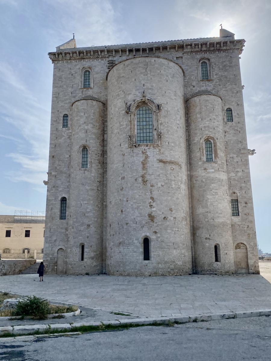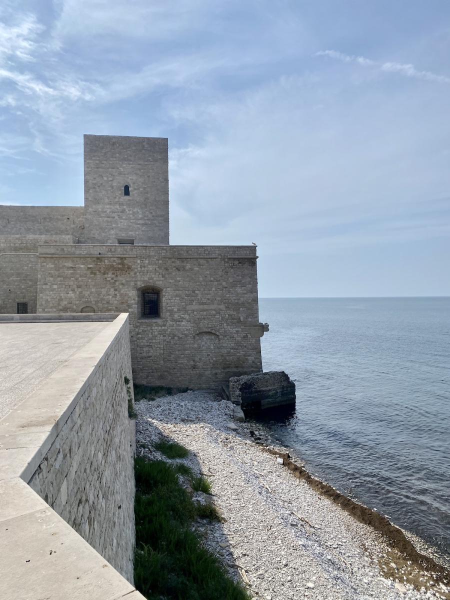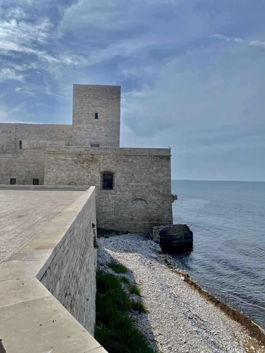 Die Hafenstadt Trani, rund 50 Kilometer nördlich von Bari gelegen und mit rund 50.000 Einwohner:innen um einiges kleiner als Bari, bietet gleich zwei kulturhistorische Highlights in allernächster Nähe zueinander: Steigt man beim Parcheggio Piazza Castello aus dem Auto, liegt linker Hand das trutzige Castello Normanno Svevo, rechter Hand die beeindruckende Kathedrale San Nicola Pellegrino, errichtet aus Trani-Stein, einem auffallend hellen Stein, der in der Gegend um Trani bis heute abgebaut wird, und die Kathedrale im harten Mittagslicht geradezu strahlen lässt. Eines haben Kathedrale und Castello jedenfalls gemeinsam: Die spektakuläre Lage direkt am Meer.
