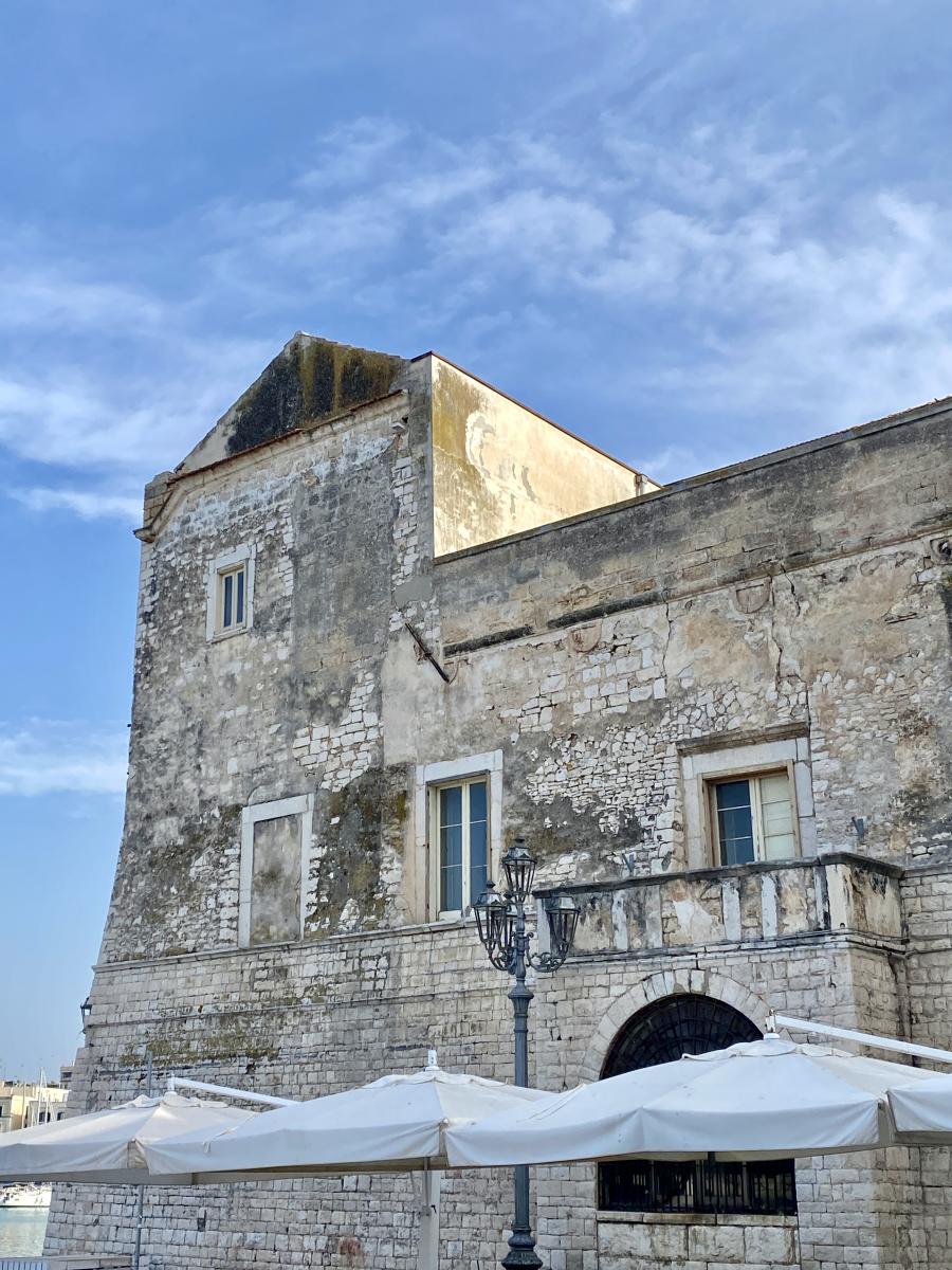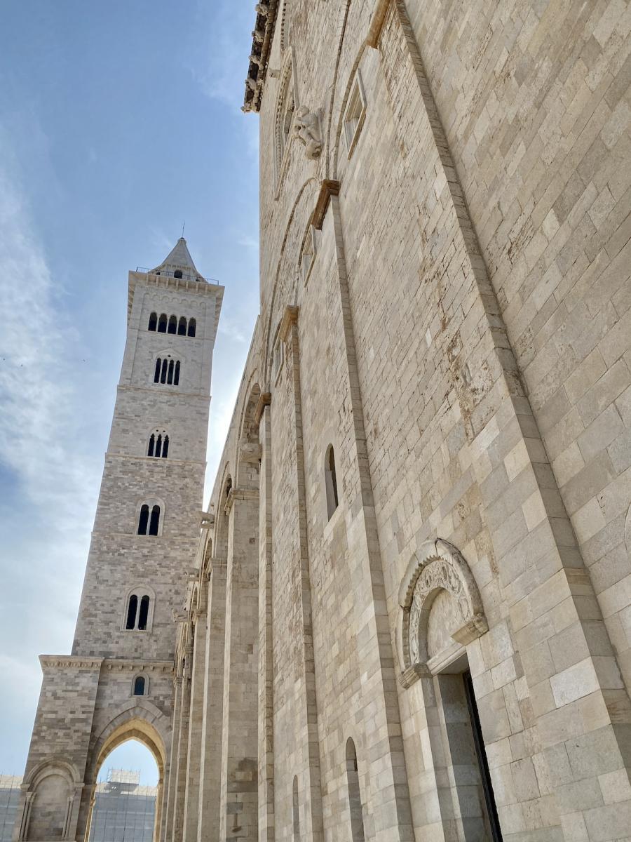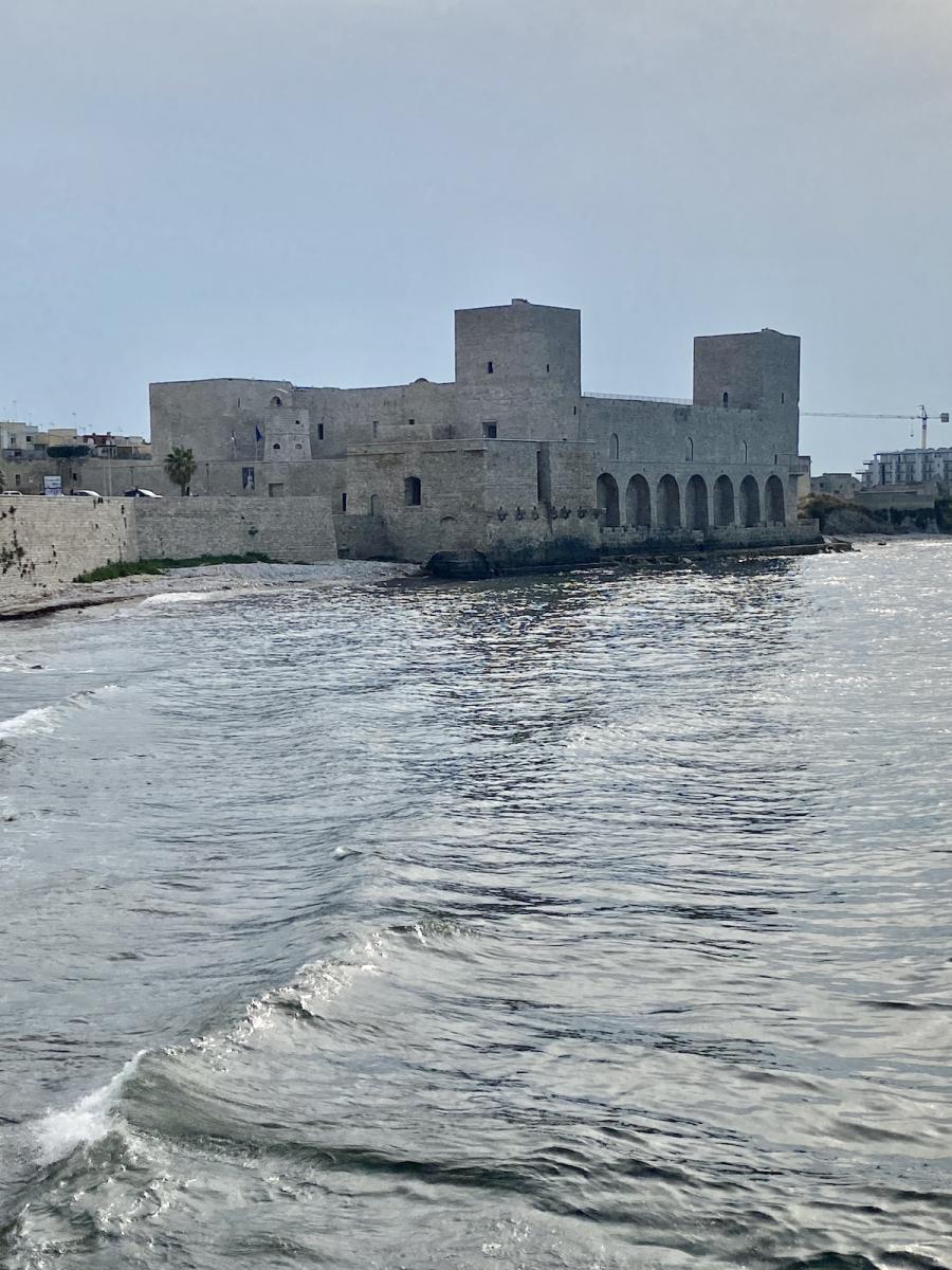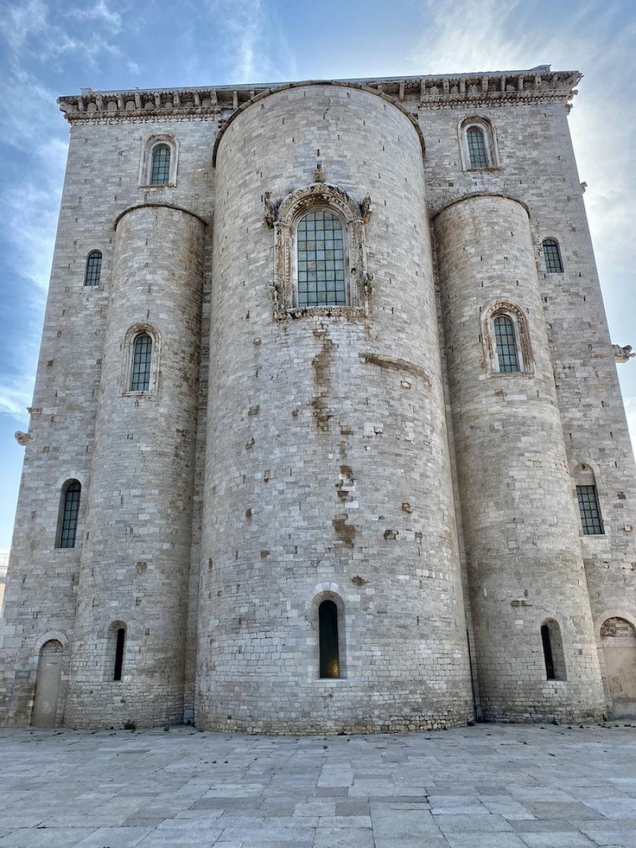 Die Hafenstadt Trani, rund 50 Kilometer nördlich von Bari gelegen und mit rund 50.000 Einwohner:innen um einiges kleiner als Bari, bietet gleich zwei kulturhistorische Highlights in allernächster Nähe zueinander: Steigt man beim Parcheggio Piazza Castello aus dem Auto, liegt linker Hand das trutzige Castello Normanno Svevo, rechter Hand die beeindruckende Kathedrale San Nicola Pellegrino, errichtet aus Trani-Stein, einem auffallend hellen Stein, der in der Gegend um Trani bis heute abgebaut wird, und die Kathedrale im harten Mittagslicht geradezu strahlen lässt. Eines haben Kathedrale und Castello jedenfalls gemeinsam: Die spektakuläre Lage direkt am Meer.