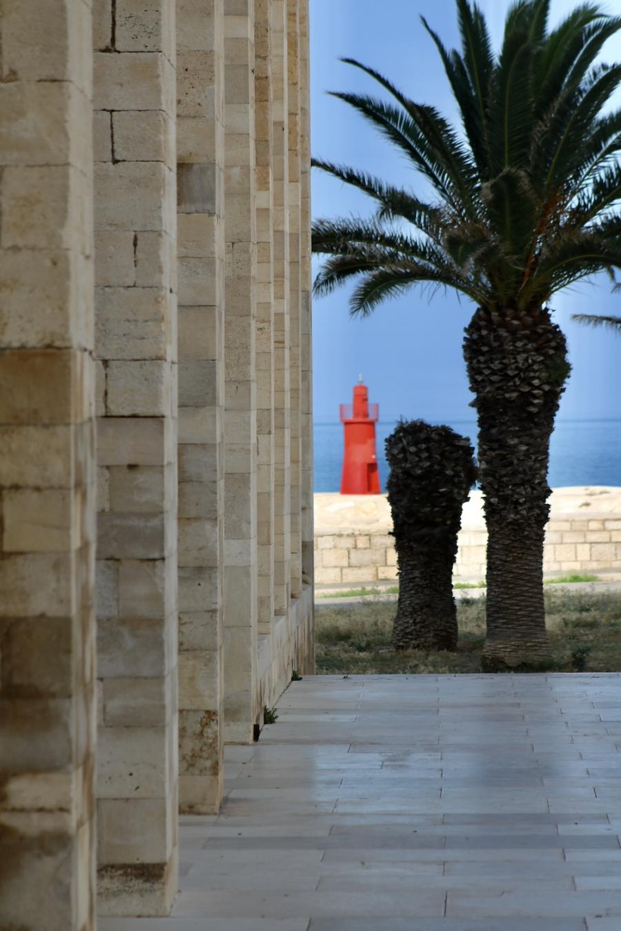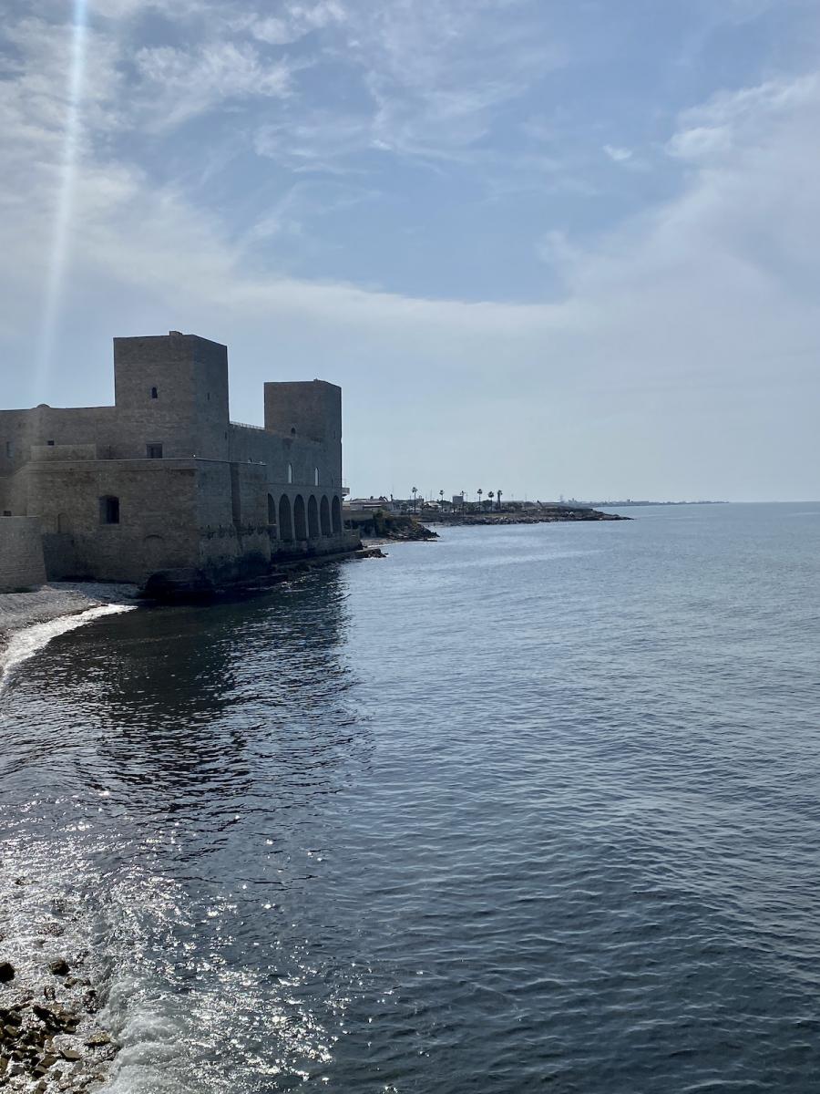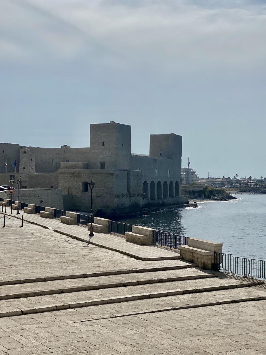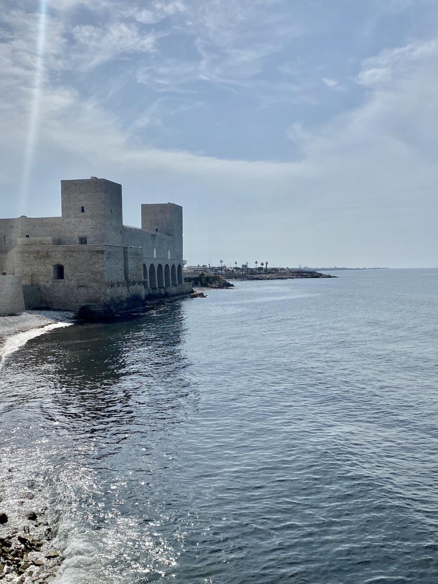 Die Hafenstadt Trani, rund 50 Kilometer nördlich von Bari gelegen und mit rund 50.000 Einwohner:innen um einiges kleiner als Bari, bietet gleich zwei kulturhistorische Highlights in allernächster Nähe zueinander: Steigt man beim Parcheggio Piazza Castello aus dem Auto, liegt linker Hand das trutzige Castello Normanno Svevo, rechter Hand die beeindruckende Kathedrale San Nicola Pellegrino, errichtet aus Trani-Stein, einem auffallend hellen Stein, der in der Gegend um Trani bis heute abgebaut wird, und die Kathedrale im harten Mittagslicht geradezu strahlen lässt. Eines haben Kathedrale und Castello jedenfalls gemeinsam: Die spektakuläre Lage direkt am Meer.