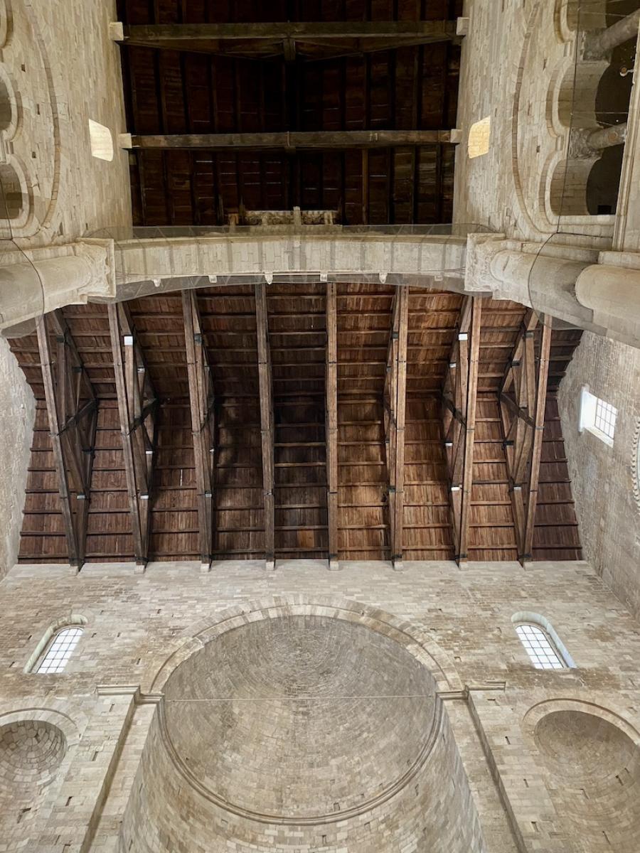 Wir steigen von der Unterkirche, in der zwei Reihen mit insgesamt 28 Säulen für eine beeindruckende Raumwirkung sorgen und wo die Gebeine des hl. Pilgers Nikolaus in einem silbernen Schrein unter dem Altar aufbewahrt sind, in den Innenraum der Kathedrale hinauf: Licht und Weite dominieren hier. Heute wirkt das Kircheninnere geradezu nackt, einst war das anders: Unzählige bunte Fresken zierten die Wände, ein Mosaik den Boden. Heutzutage erahnt man dies nur mehr anhand von Mosaikresten im Chor-Bereich.