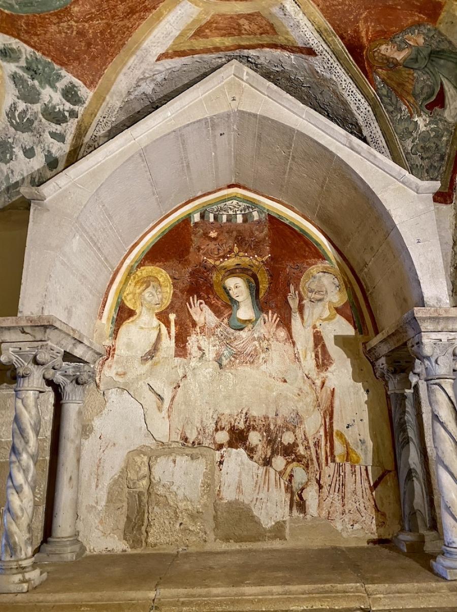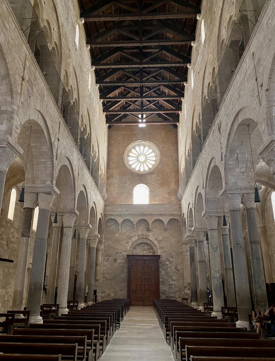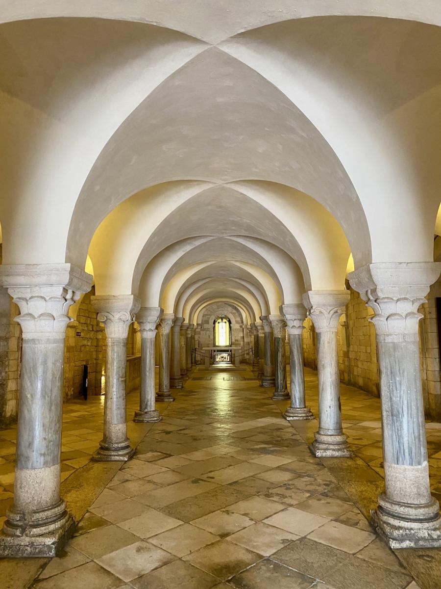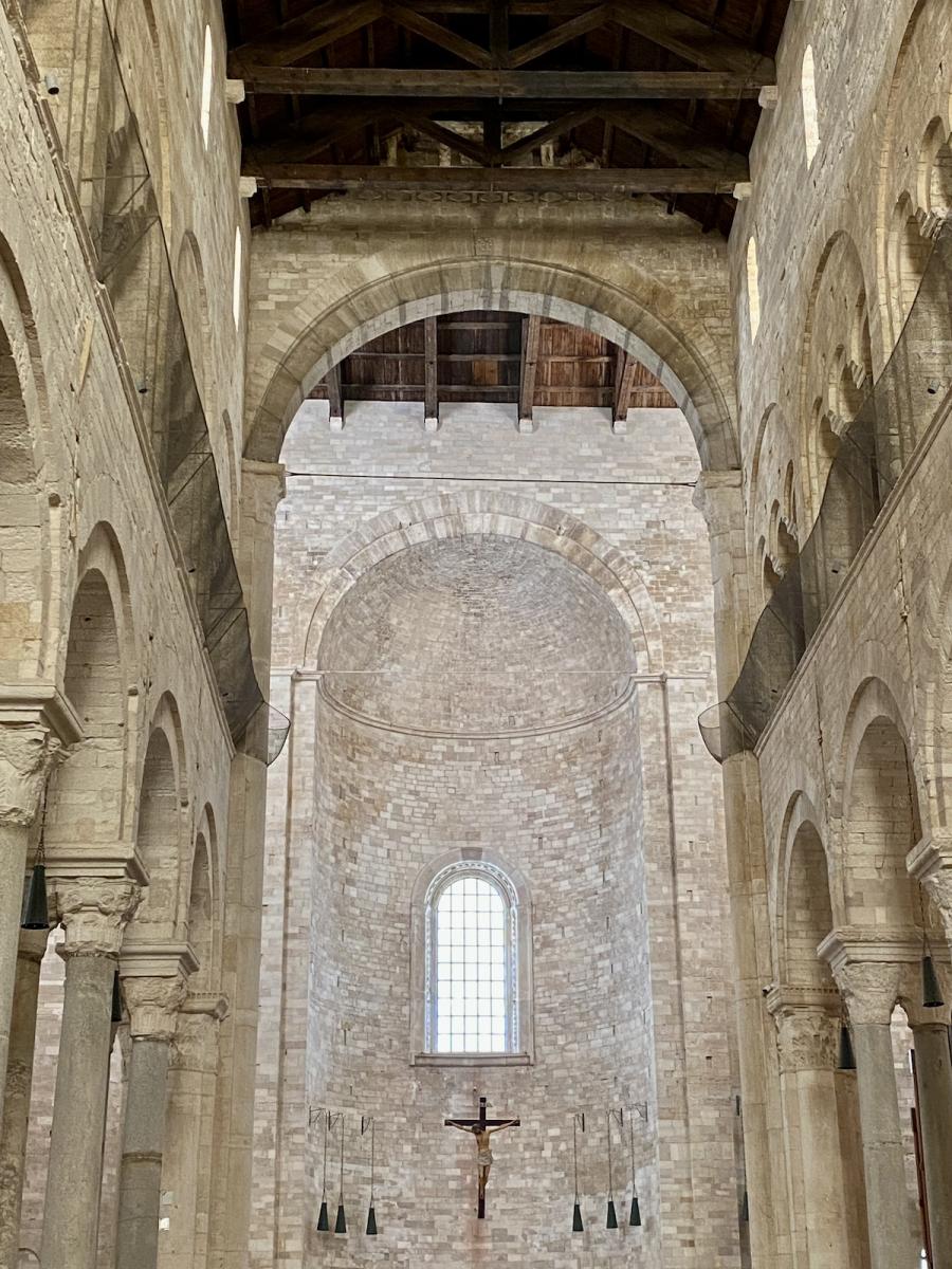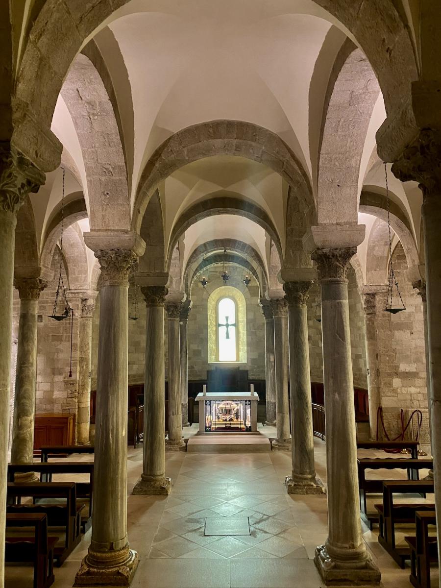 Aber jetzt geht es erst mal in die Unterkirche, die ehemalige Kirche Santa Maria della Scala, über der die heutige Kathedrale errichtet wurde. Wer sich ein wenig mit der Geschichte der heutigen Kathedrale beschäftigt, wird auf eine spannende Legende stoßen, in deren Mittelpunkt – der Name der Kathedrale lässt es schon erahnen – der hl. Nikolaus stand. Dessen Gebeine waren ins nahe Bari gebracht worden und ruhen bis heute in der Kathedrale San Nicolo. Trani ging damals leer aus, aber wie so oft im Leben gab es auch hier eine zweite Chance – und zwar im Jahr 1094 als ein griechischer Pilger namens Nikolaus nach Trani kam, ein Kreuz geschultert. Auf der Treppe zur Kirche Santa Maria della Scala soll er zusammengebrochen sein und wurde nur drei Jahre später von Papst Urban II. heiliggesprochen. Der Erzbischof von Trani witterte seine Chance und nahm sofort den Bau der Kathedrale San Nicola Pellegrino oberhalb der bestehenden Kirche in Angriff, um San Nicolo Pellegrino würdig zu bestatten, und, ganz banal gesprochen, künftig, wie auch Bari, vom damaligen Pilger-Tourismus zu profitieren. Noch beeindruckender als die Kathedrale San Nicolo in Bari sollte diese Kathedrale, unmittelbar am Meer gelegen, werden – und in vielerlei Hinsicht scheint das auch gelungen.