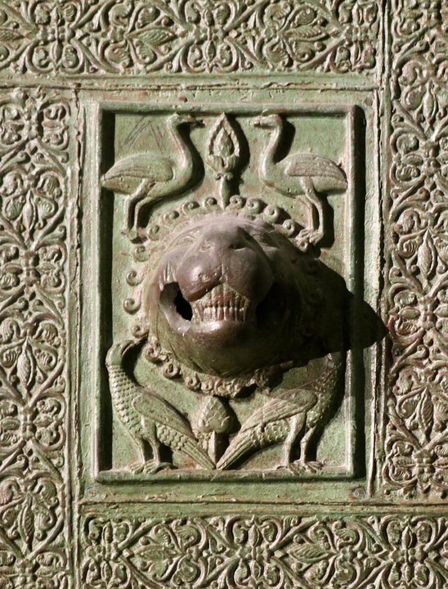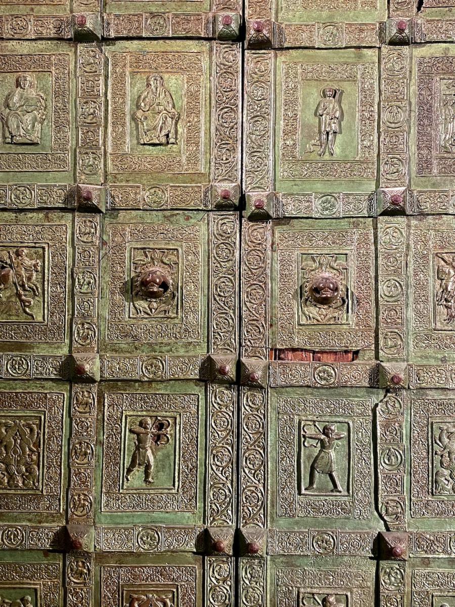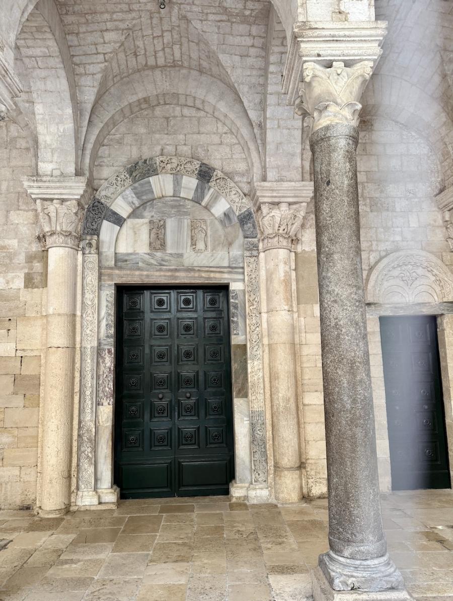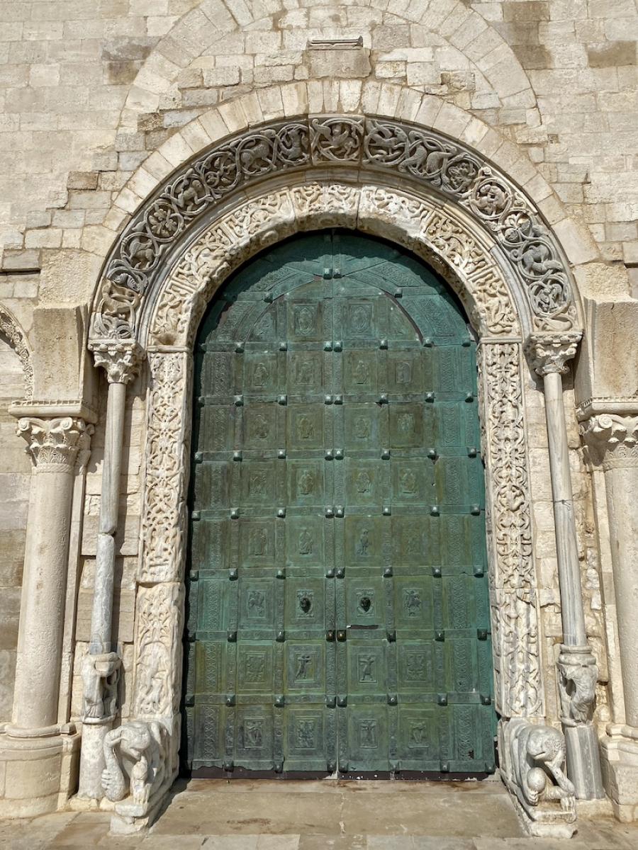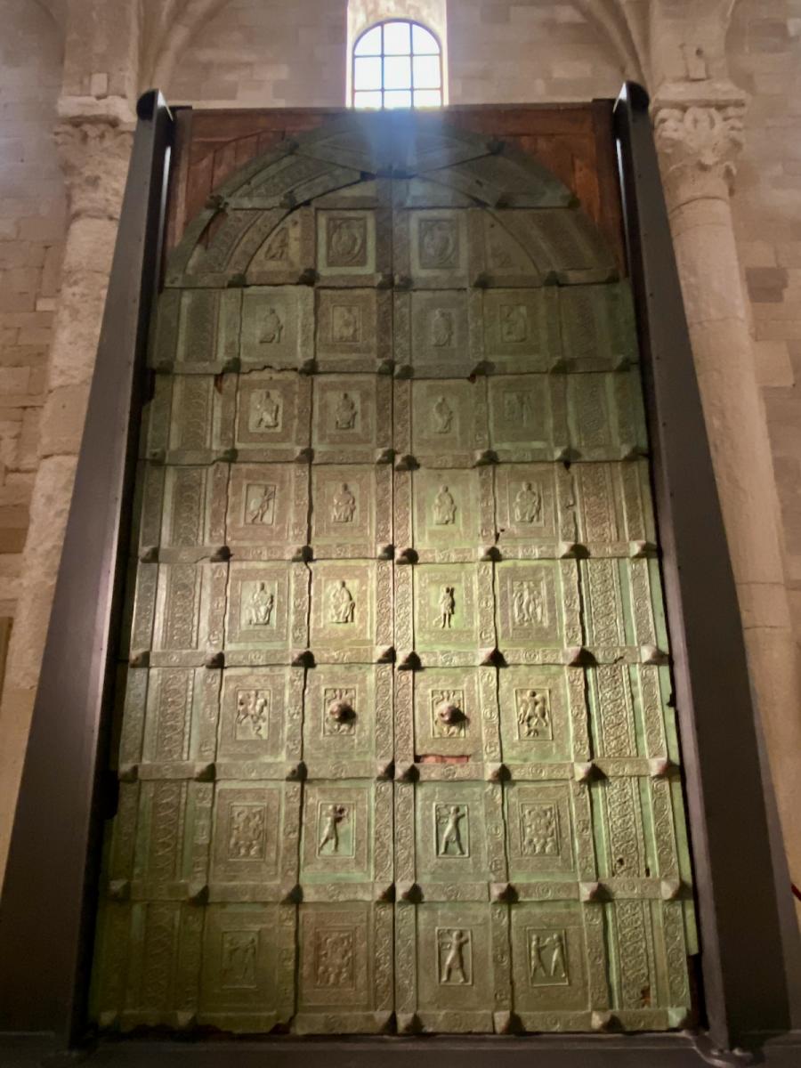 Nicht übersehen kann man die mächtige, zweiflügelige Bronzetür, die sich, im 12. Jahrhundert geschaffen, ursprünglich im reich verzierten Portal der Kirche befunden hatte und nun seit ihrer Restaurierung (1999) im Kircheninneren aufbewahrt wird. Der Bildhauer Barisano di Trani hat die auf der Türe dargestellten Figuren als erster in Süditalien in der damals innovativen Relieftechnik ausgeführt. 2 x 16 Bildplatten wurden an der Holzplatte befestigt, insgesamt wiegt die Tür rund 2,5 Tonnen. Barisano hat sich übrigens auch selbst verewigt in einer der Bildplatten: als kleiner, betender Mönch neben dem hl. Nikolaus.