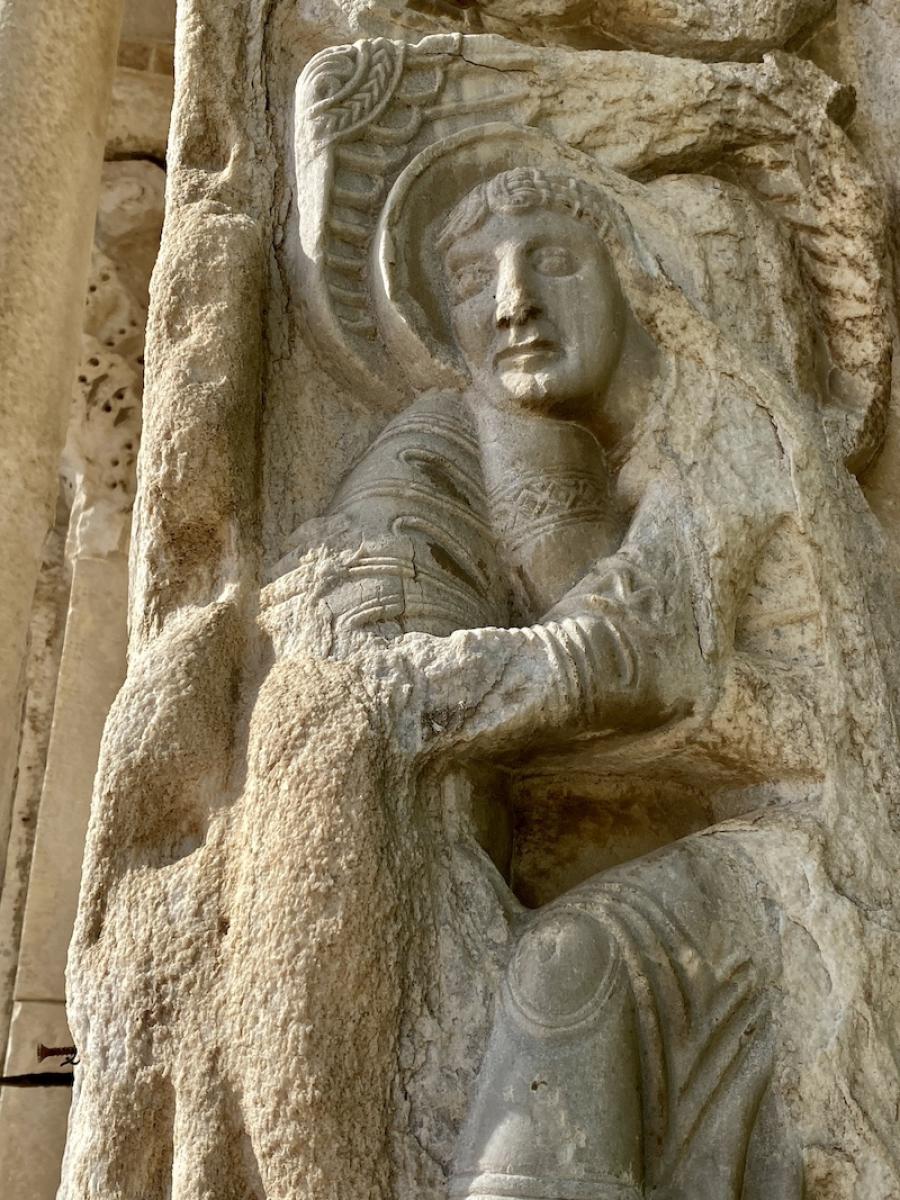 Und dann verlassen wir die die Kathedrale so, wie wir sie auch betreten hatten, durch die Unterkirche, um dann schlussendlich auch noch über die Freitreppe hinaufzusteigen, zum Kirchenportal, das aus der Entfernung beeindruckt – und noch viel mehr aus der Nähe. Menschen, Pflanzen, Tiere, orientalisch anmutende Muster, es gibt hier viel zu entdecken für das Auge. Über all dem die schöne 16teilige Fensterrose, die von sechs Tierfiguren auf Konsolen umringt wird. Und dann erst der Ausblick auf das Meer, den man von hier hat. Zwei Frauen streben über die weitläufige Piazza Duomo Richtung Meer, mit Campingstühlen unter den Armen, über ihnen die brütende Hitze des frühen Nachmittags, vor ihnen das endlose Blau der Adria. Habe ich eigentlich Badesachen im Auto, überlege ich kurz, aber nein, heute nicht, schade.