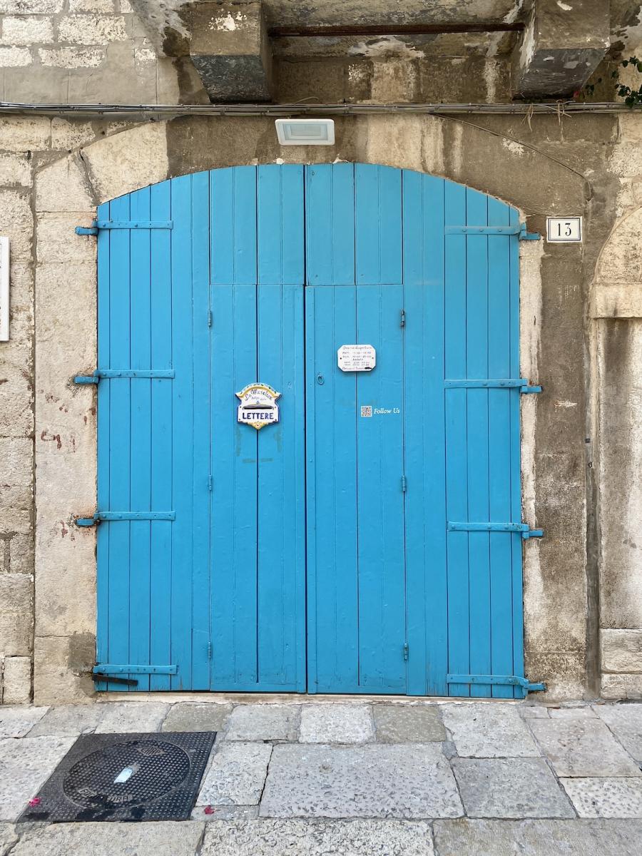 Wir lassen uns noch ein wenig durch die Altstadt treiben, auch diese ist an diesem heißen Juni-Nachmittag fast wie ausgestorben. Nachvollziehbar, denken wir uns, und wischen uns den Schweiß von der Stirn. Hübsche Gassen, schöne, helle Stein-Fassaden, bunte Tore, da und dort eine müde gähnende Katze im Schatten der Hausmauer. Wir kommen an der Chiesa d`Ognissanti vorbei, dem so genannten Templerhospiz, das Mitte des 13. Jahrhunderts vom Orden der Templer errrichtet worden sein soll – Betonung auf "soll", denn endgültig bewiesen werden konnte es nicht, liest man. Wir linsen durch den Eingang mit Vorhalle, aber leider ist der Eingang durch ein Gitter blockiert. Im Reiseführer lesen wir, dass die kleine, aber sehenswerte Kirche nur selten geöffnet sein soll, unser Eindruck ist aber eher, dass sie gar nicht mehr besucht werden kann.