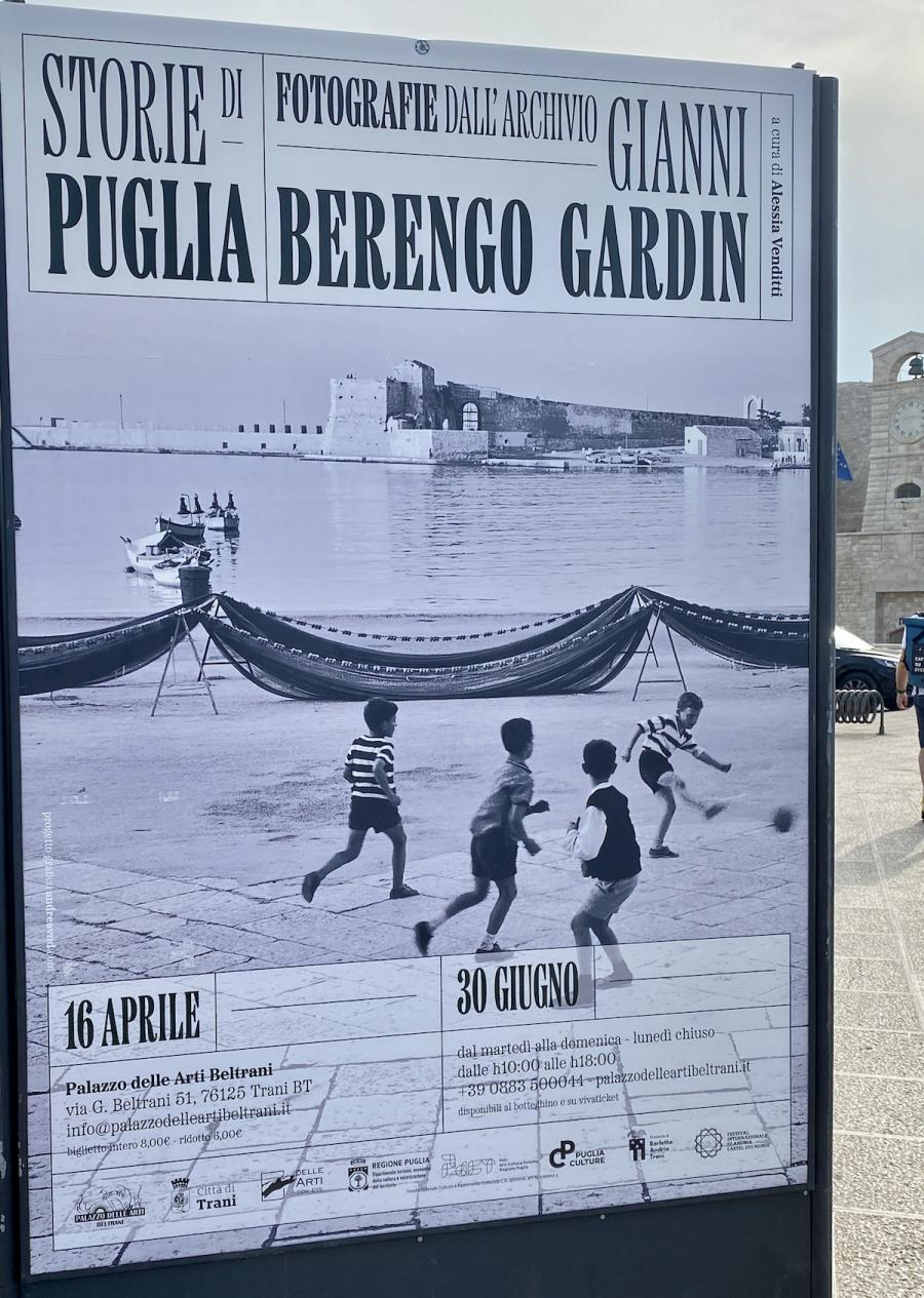 Am Weg zurück zu unserem Auto geraten wir dann doch noch mal in Versuchung: Vielleicht doch noch die Fotografie-Ausstellung im Palazzo delle Arti Beltrani besuchen? Denn hier gibt es "Storie di Puglia" (Geschichten aus Apulien) aus dem Archiv des bekannten italienischen Fotografen Gianni Berengo Gardin zu sehen. Er begann als Fotoreporter für die Zeitschrift Il Mondo seine Karriere, und arbeitete dann u. a. für Magazine und Zeitschriften wie L`Espresso, Time, Stern oder Le Figaro. Seine Werke waren u. a. im MOMA New York, im George Eastman House in Rochester (NY) oder in der Bibliothèque nationale de France in Paris zu sehen. Kurz bin ich sehr versucht, aber dann gewinnt dochh die Aussicht auf einen Sprung ins kühle Nass in der Villa Pesce, in der wir für ein paar Tage unsere Zelte aufgeschlagen haben. Ciao Trani, du bist definitiv einen zweiten Besuch wert! Und unsere Reise entlang der Costa di Bari geht weiter: Nächste Station ist das schöne Barletta.