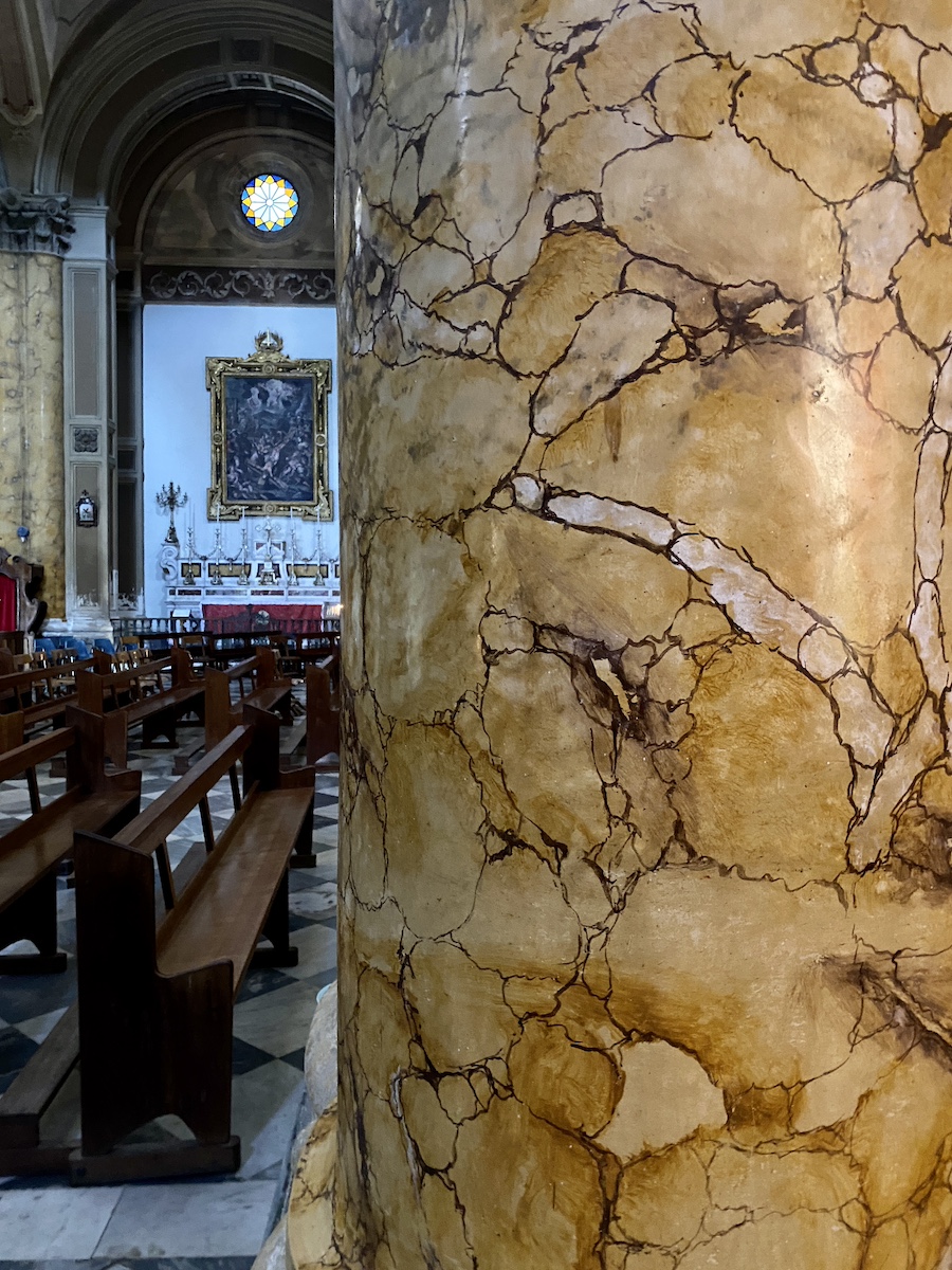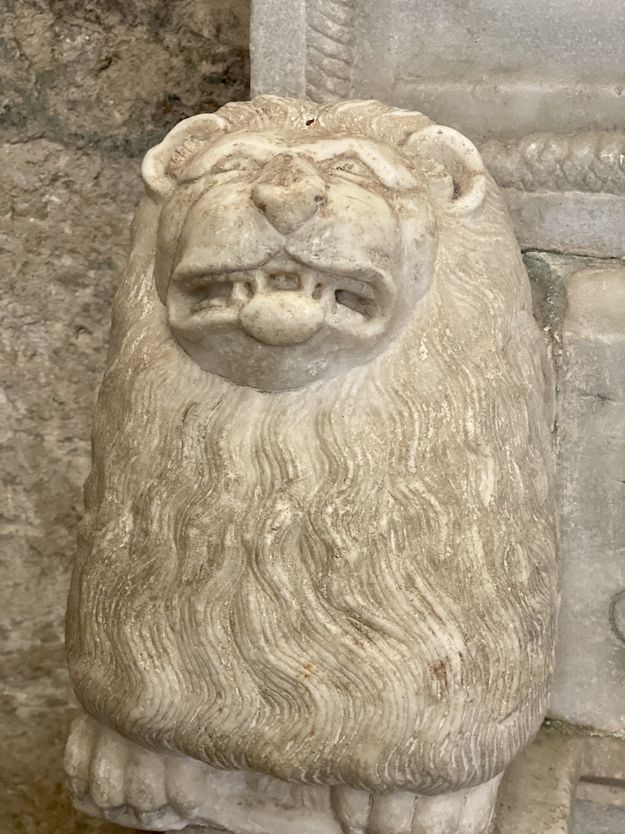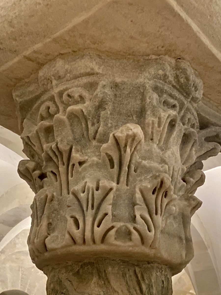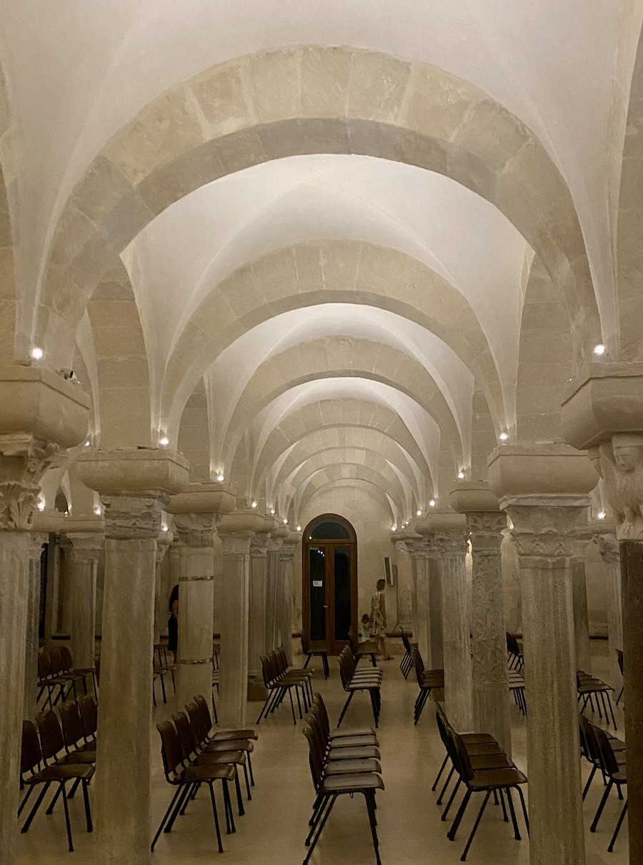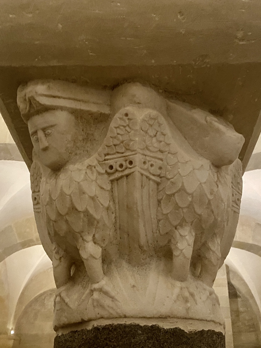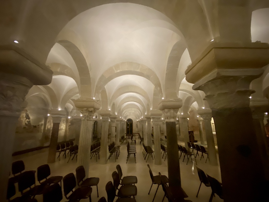 Beim letzten Besuch war die Krypta der Kathedrale Santa Annunziata geflutet von Besucher:innen, also versuchen wir es nun ein weiteres Mal. Und siehe da, nun gehört sie fast uns alleine. Dieses Mal nehme ich erst so richtig diesen Dschungel von insgesamt 42 Säulen wahr, allesamt höchst unterschiedlich, glatt oder auch mit schönen Ornamenten versehen, und mit korinthischen, dorischen oder romanischen Kapitellen ausgestattet. Von Säule zu Säule wandern wir durch diese beeindruckende Hallenkrypta, die eine erstaunlich niedrige Decke hat und die bereits im 11. Jahrhundert fertiggestellt worden war. Dass sie auf den Resten eines antiken Tempels errichtet wurde, das erahnt man hier nicht.