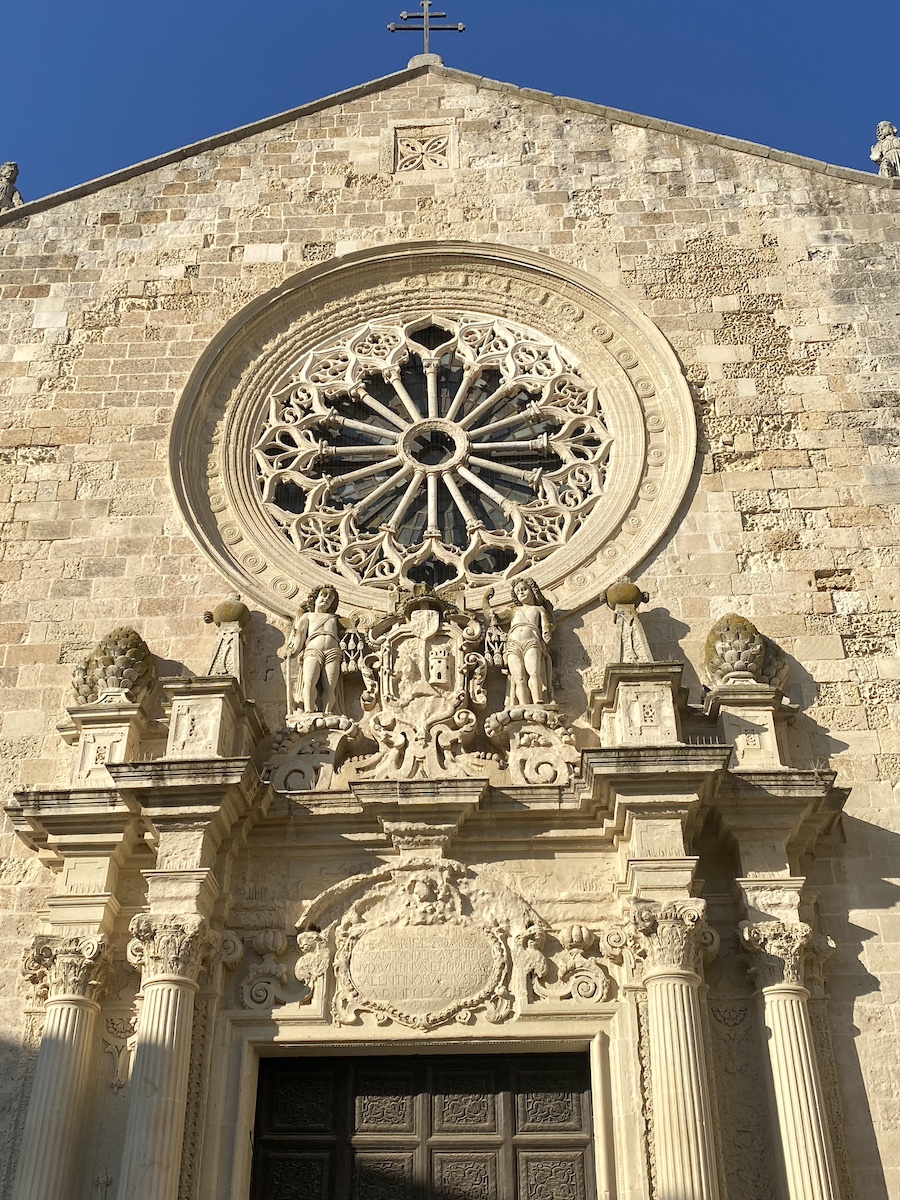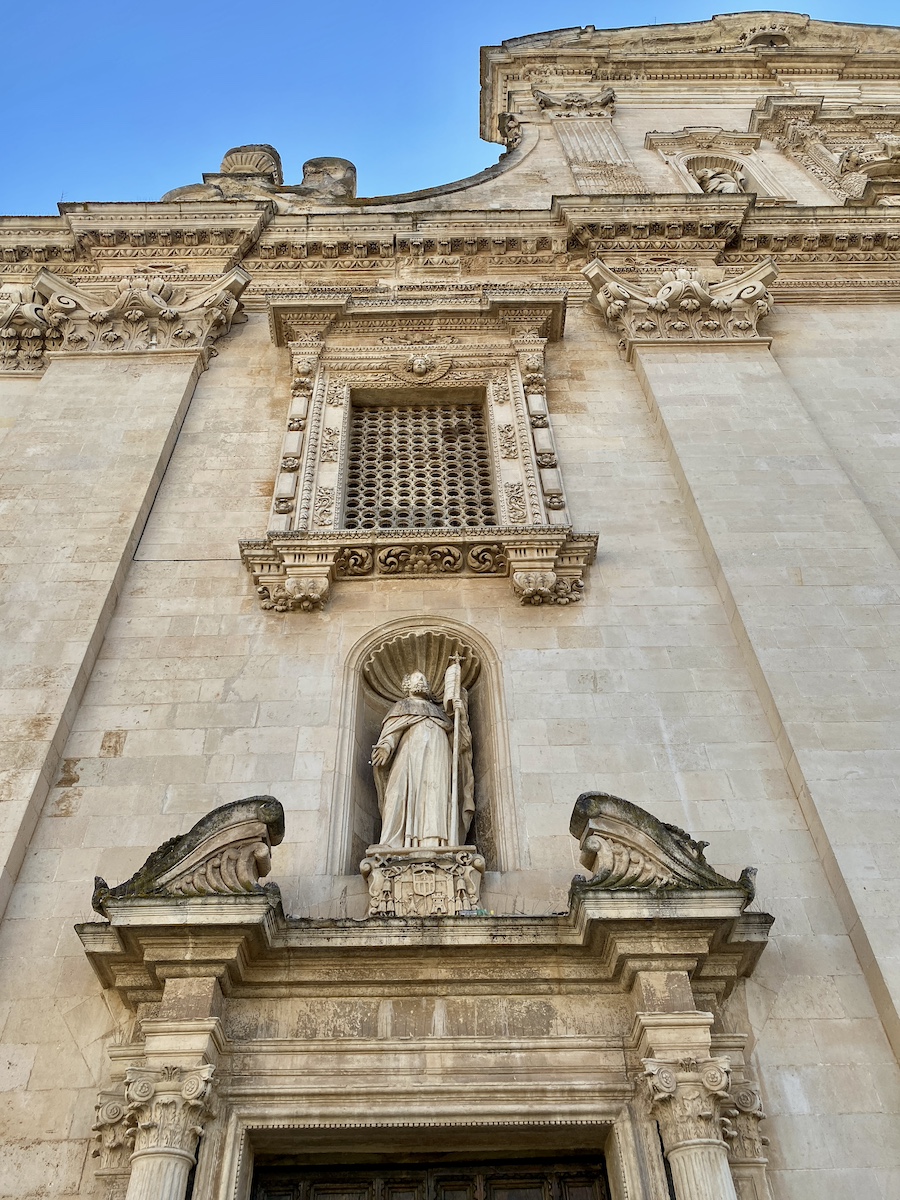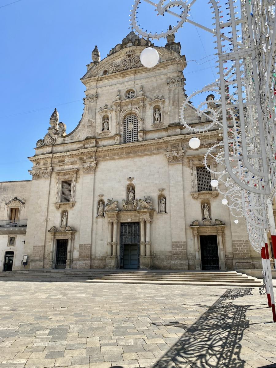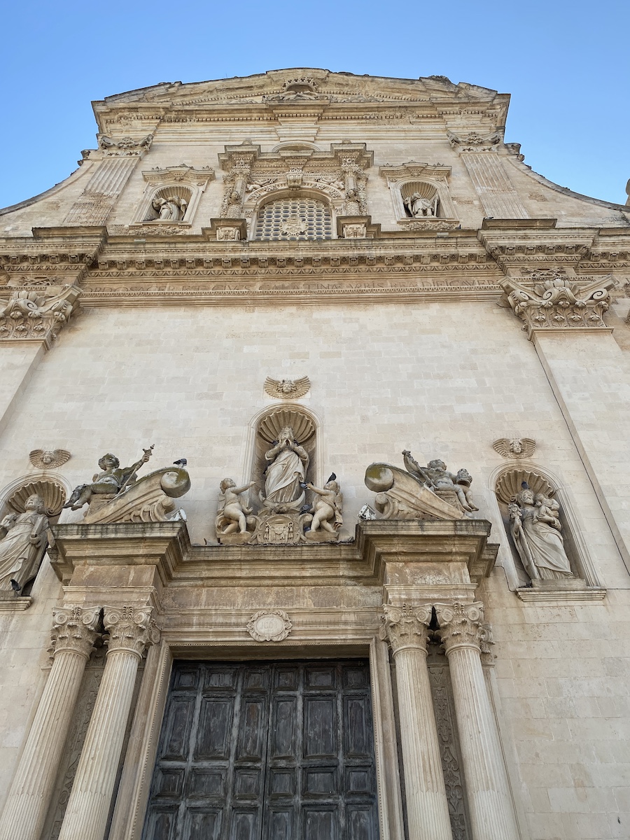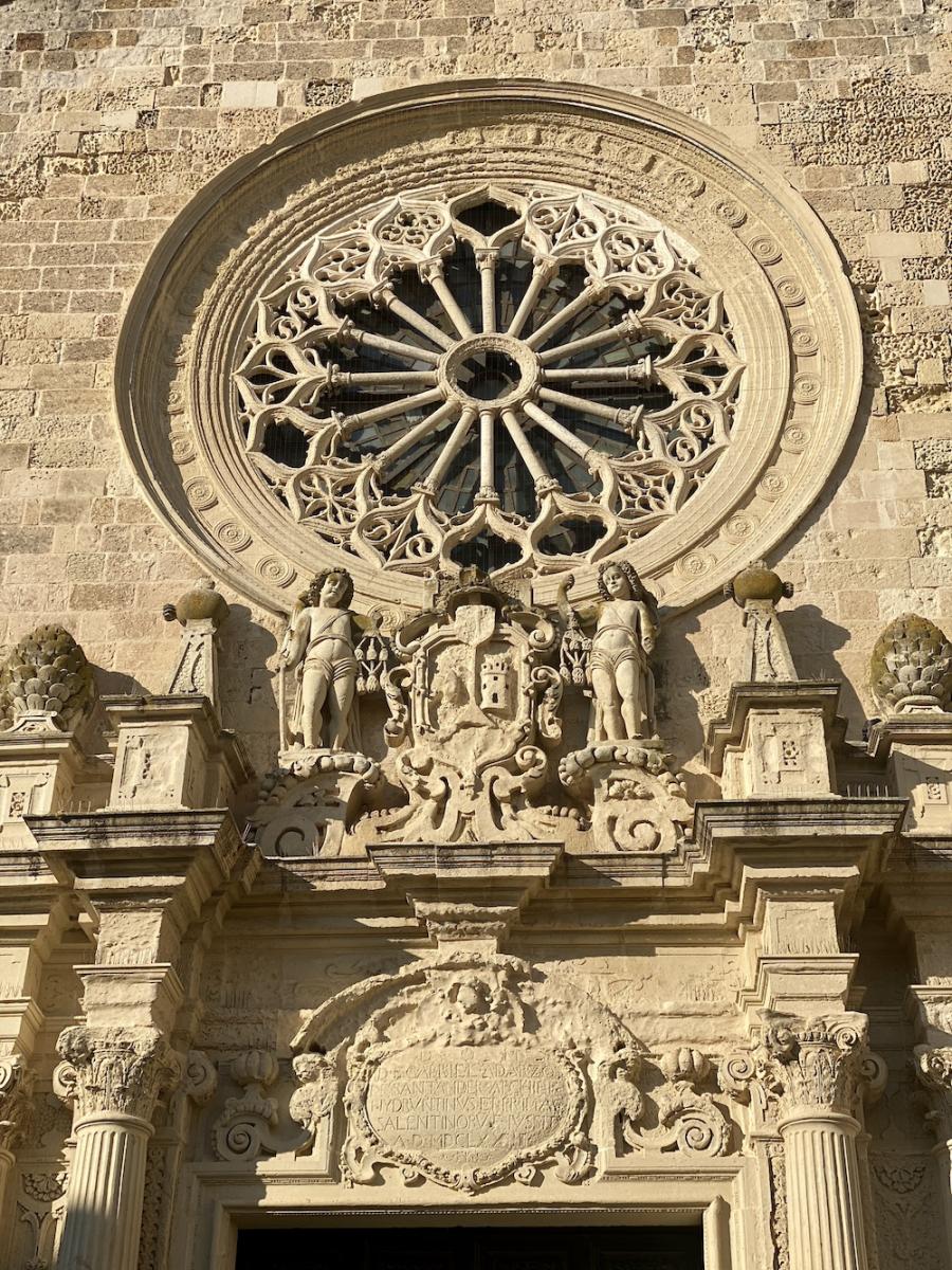 Aber noch sind wir frisch und gewillt unser Besichtigungsprogramm voll durchzuziehen: Stopp Nr. 1 ist die Chiesa dei Santi Pietro e Paolo, errichtet zwischen 1261 und 1633. Dank der großen Piazza, an der sie steht oder besser gesagt geradezu thront, nimmt sie sich ausgesprochen mächtig aus. Die Fassade barock, wie könnte es auch anders sein; sie endet mit einem Tympanon, das das Stadtwappen von Galatina einrahmt. Ich hole mir dieses mit dem Objektiv meiner Kamera näher heran: Eule, Schlüssel und Krone sind darauf zu sehen.