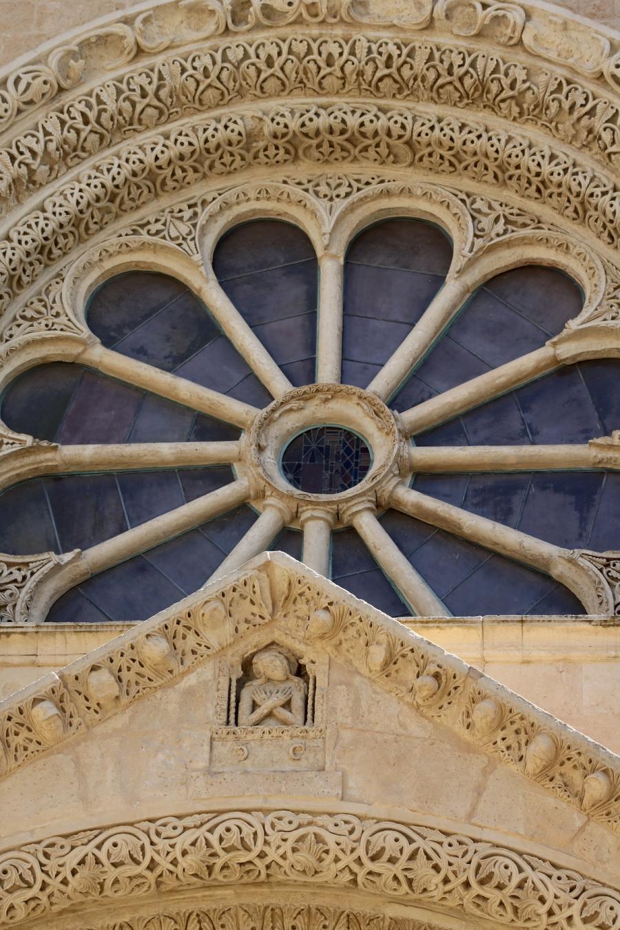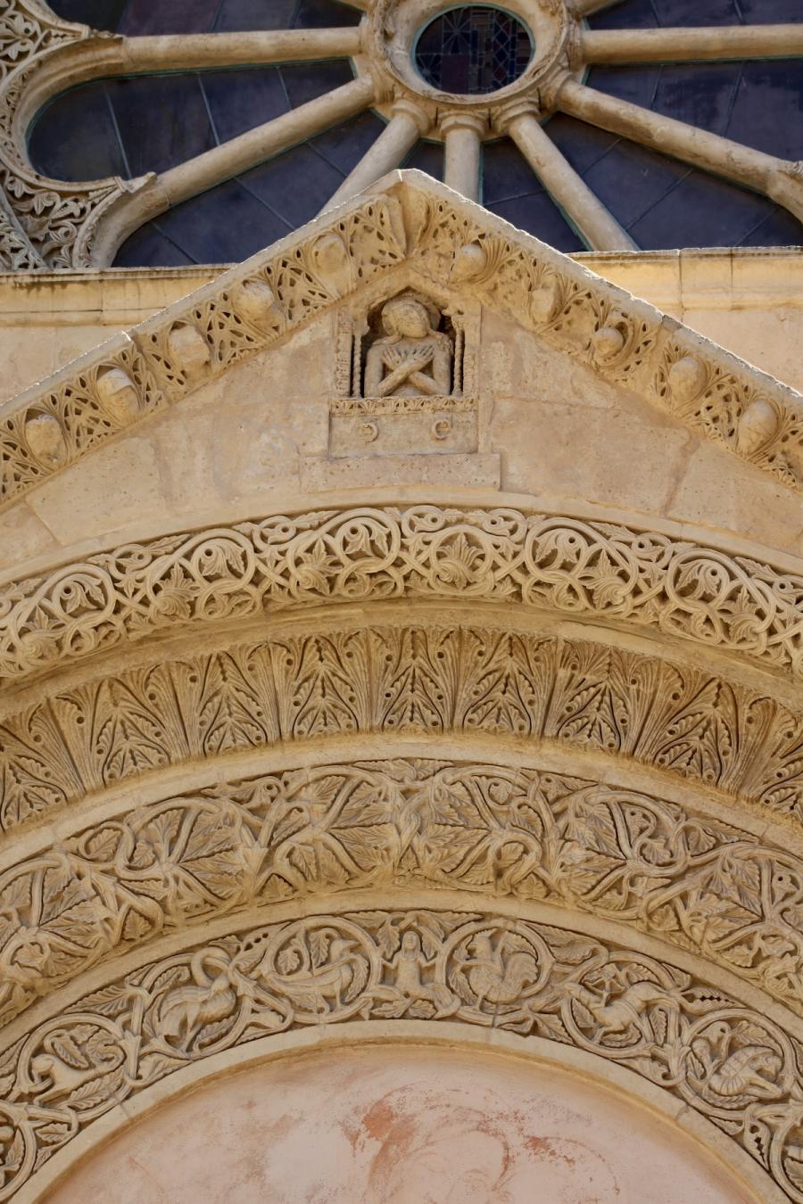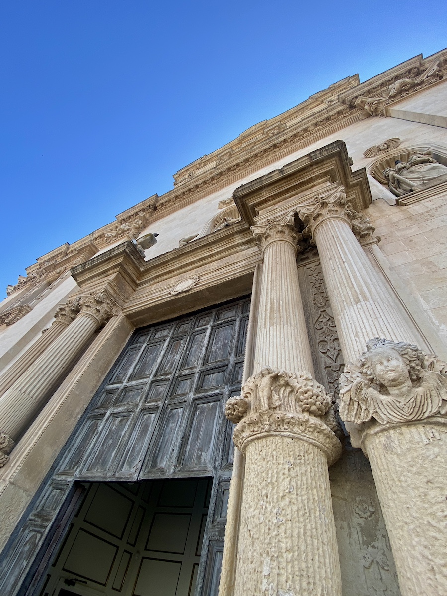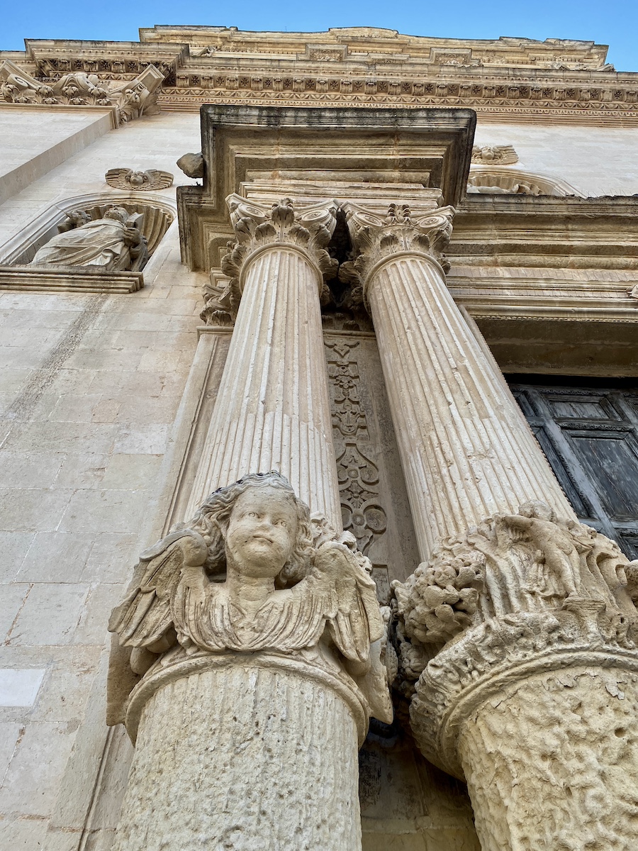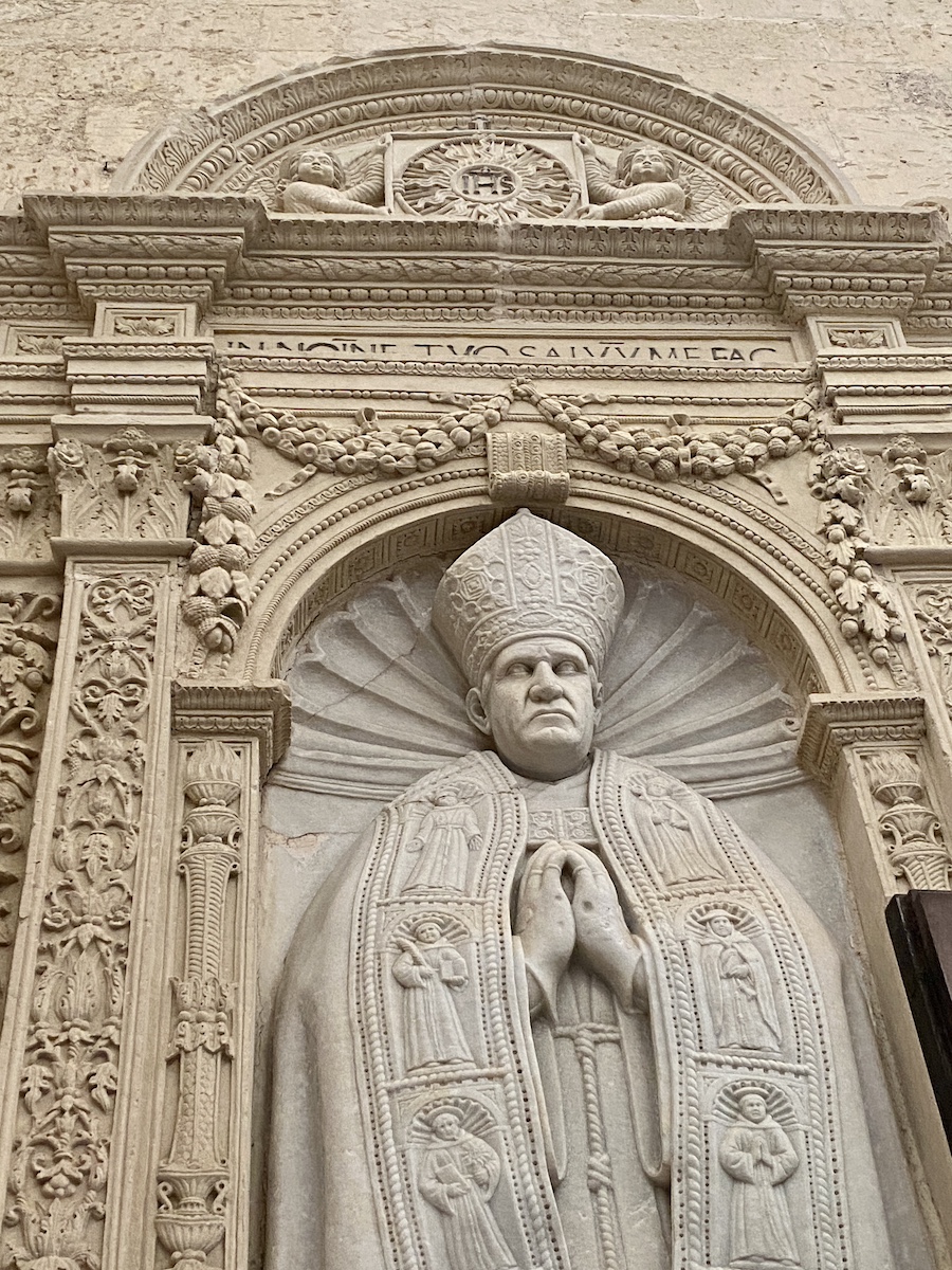 Aber noch sind wir frisch und gewillt unser Besichtigungsprogramm voll durchzuziehen: Stopp Nr. 1 ist die Chiesa dei Santi Pietro e Paolo, errichtet zwischen 1261 und 1633. Dank der großen Piazza, an der sie steht oder besser gesagt geradezu thront, nimmt sie sich ausgesprochen mächtig aus. Die Fassade barock, wie könnte es auch anders sein; sie endet mit einem Tympanon, das das Stadtwappen von Galatina einrahmt. Ich hole mir dieses mit dem Objektiv meiner Kamera näher heran: Eule, Schlüssel und Krone sind darauf zu sehen.