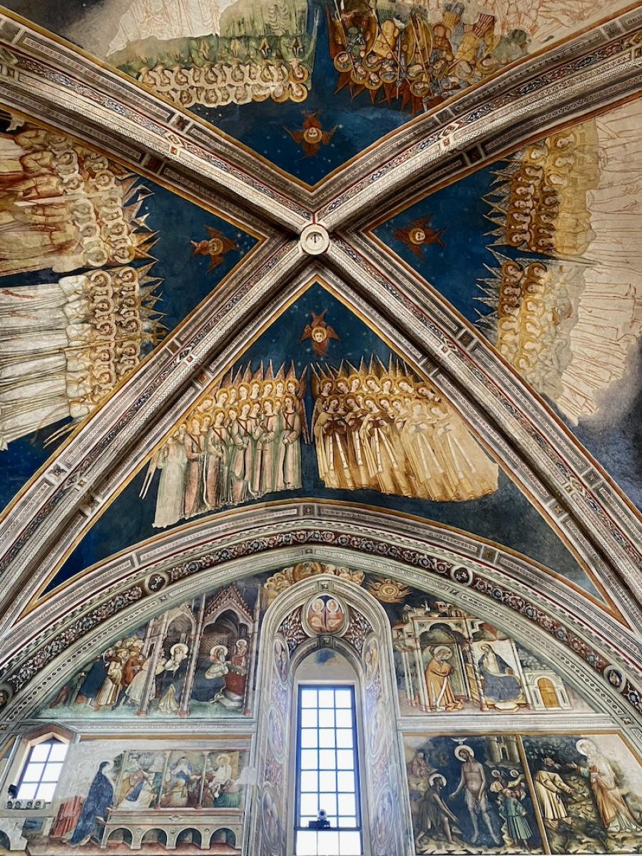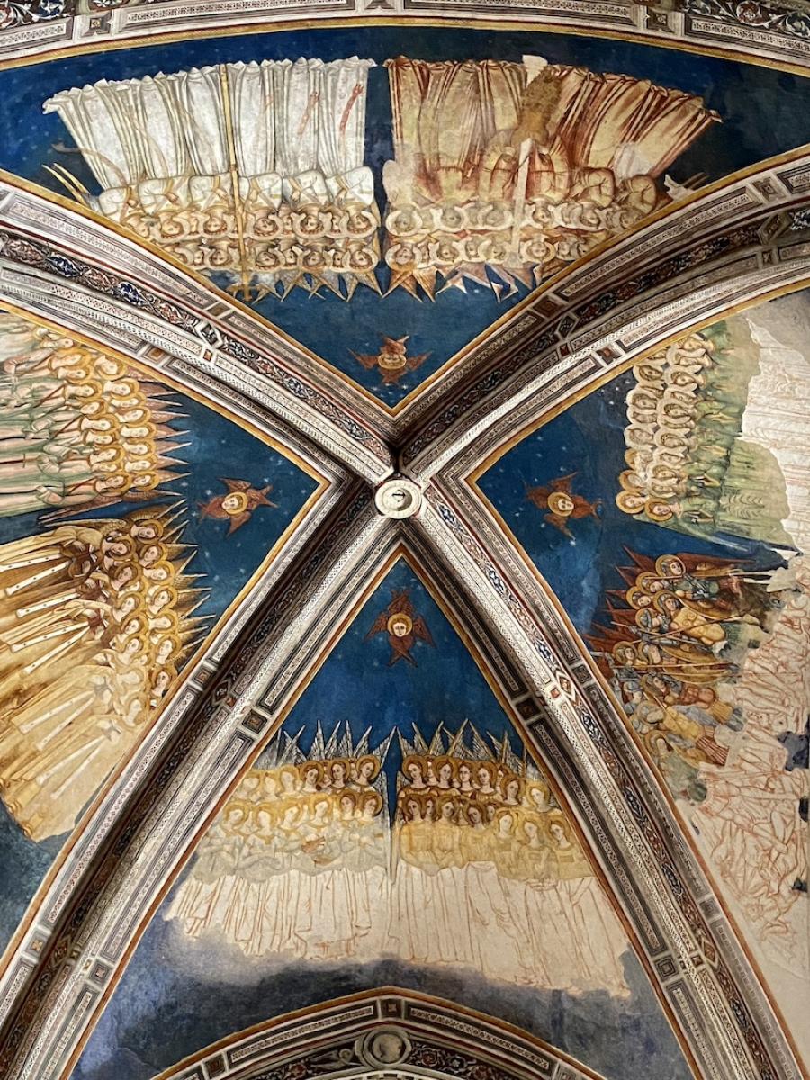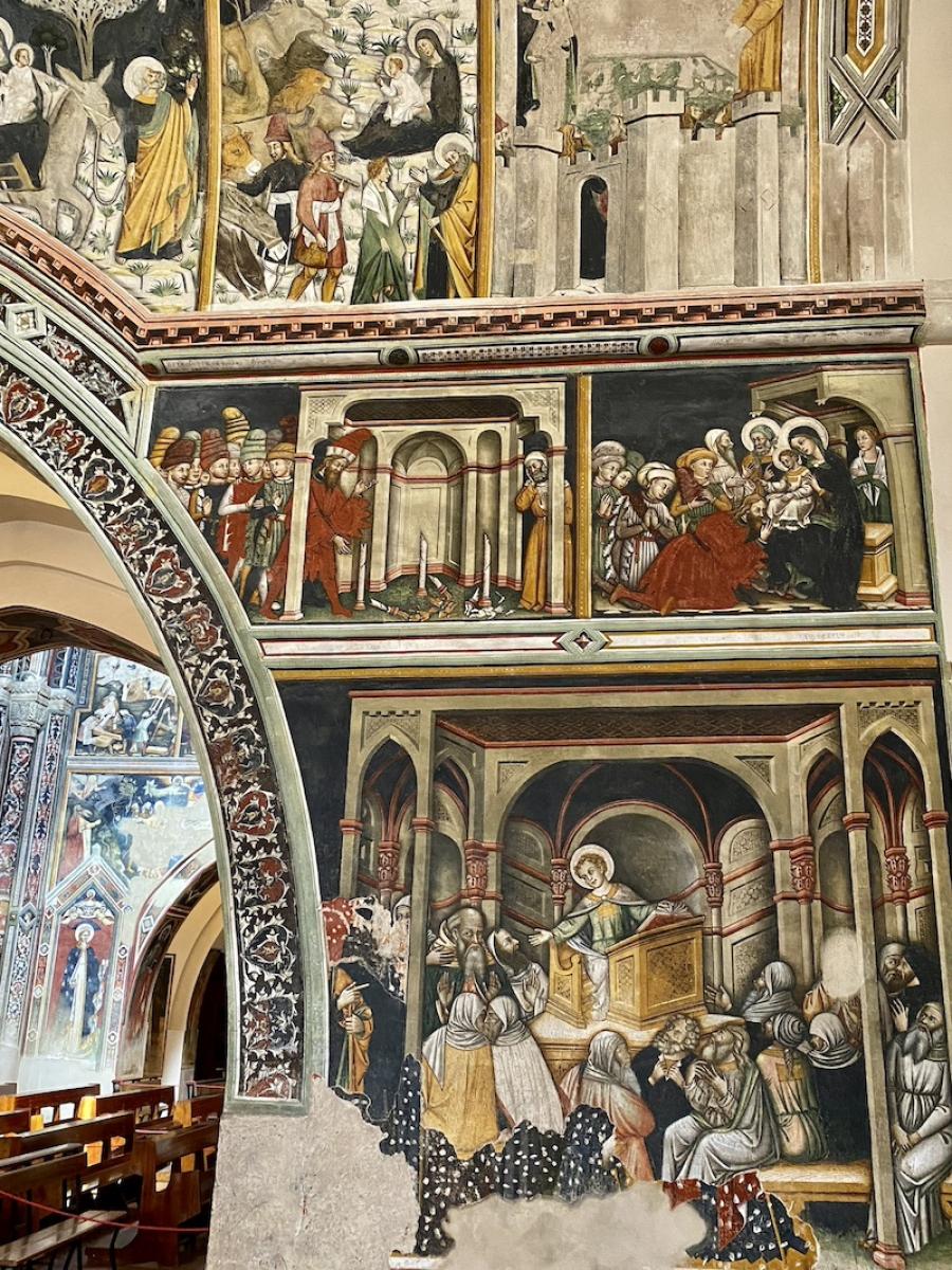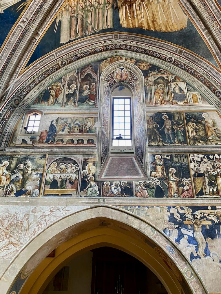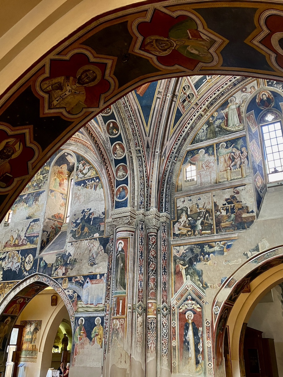 Hier stockt mir erstmal der Atem: Denn was es hier, in dieser 1391 fertiggestellten Kirche, zu sehen gibt, wirft mich um. Der fünfschiffige Innenraum ist fast über und über freskiert, das Auge gleitet erst mal über alles hinweg und versucht dann irgendwo einen Anfang zu finden. Aber wo beginnen, wo enden mit dem Lesen der unzähligen Geschichten, die diese bunten, beeindruckenden Fresken erzählen? Ich starte schließlich im ersten Schiff mit Szenen aus der Apokalypse, gefolgt von den Geschichten der Genesis (im zweiten Schiff). Eine eindeutige Engelsdominanz stelle ich im Gewölbe des dritten Schiffs fest. Besonders schön finde ich den Freskenzyklus an den Wänden des Chors: Dieser ist dem Leben meiner Namensvetterin Katharina von Alexandrien gewidmet. Und noch ein Highlight finde ich dann: Die besonders eindrücklichen Mariengeschichten an den Wänden im rechten Seitenschiff. Eine Antwort auf die Frage, warum die Kirche der heiligen Katharina von Alessandria gewidmet ist, habe ich schließlich auch noch gefunden: Ein (angeblicher) Finger der Heiligen wird bis heute als Reliquie in einem silbernen Reliquienschrein in der Schatzkammer der Kirche, im angeschlossenen Museum, aufbewahrt.
