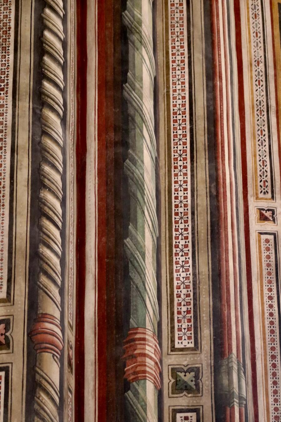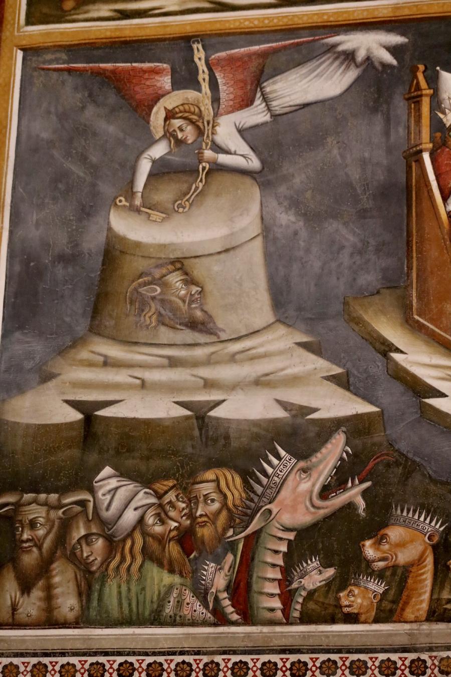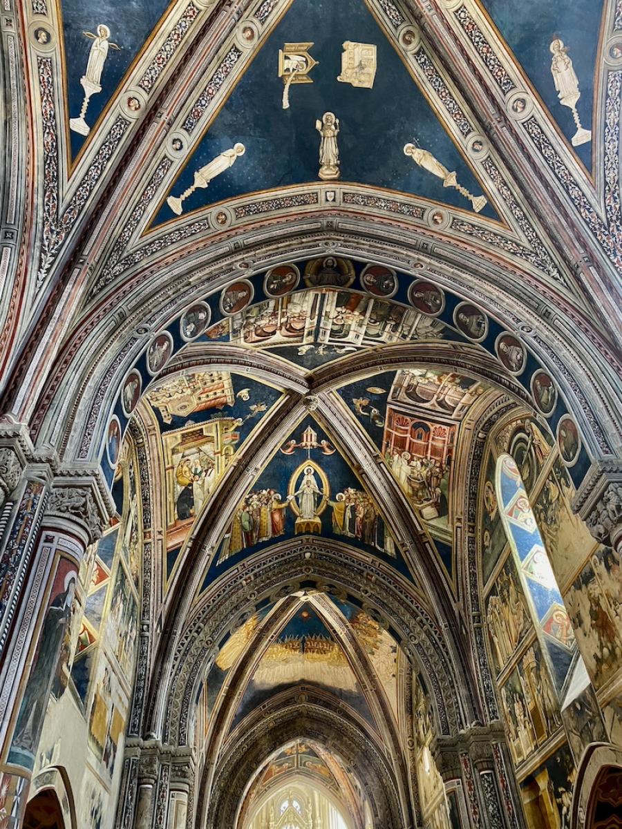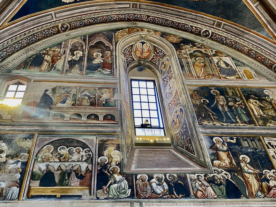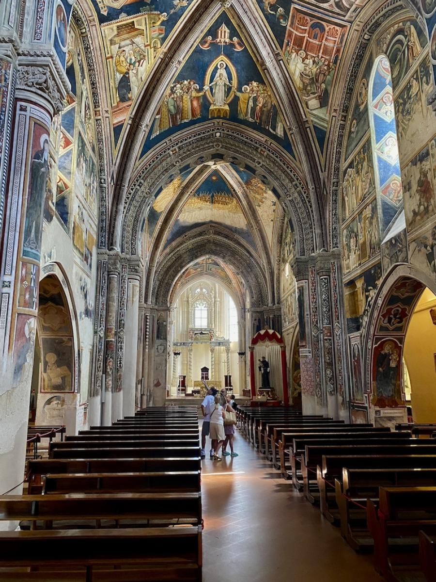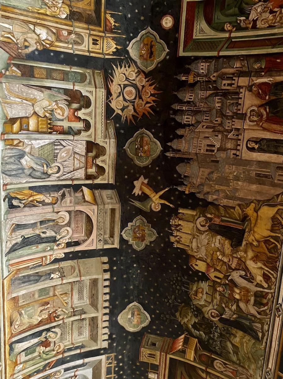 Hier stockt mir erstmal der Atem: Denn was es hier, in dieser 1391 fertiggestellten Kirche, zu sehen gibt, wirft mich um. Der fünfschiffige Innenraum ist fast über und über freskiert, das Auge gleitet erst mal über alles hinweg und versucht dann irgendwo einen Anfang zu finden. Aber wo beginnen, wo enden mit dem Lesen der unzähligen Geschichten, die diese bunten, beeindruckenden Fresken erzählen? Ich starte schließlich im ersten Schiff mit Szenen aus der Apokalypse, gefolgt von den Geschichten der Genesis (im zweiten Schiff). Eine eindeutige Engelsdominanz stelle ich im Gewölbe des dritten Schiffs fest. Besonders schön finde ich den Freskenzyklus an den Wänden des Chors: Dieser ist dem Leben meiner Namensvetterin Katharina von Alexandrien gewidmet. Und noch ein Highlight finde ich dann: Die besonders eindrücklichen Mariengeschichten an den Wänden im rechten Seitenschiff. Eine Antwort auf die Frage, warum die Kirche der heiligen Katharina von Alessandria gewidmet ist, habe ich schließlich auch noch gefunden: Ein (angeblicher) Finger der Heiligen wird bis heute als Reliquie in einem silbernen Reliquienschrein in der Schatzkammer der Kirche, im angeschlossenen Museum, aufbewahrt.