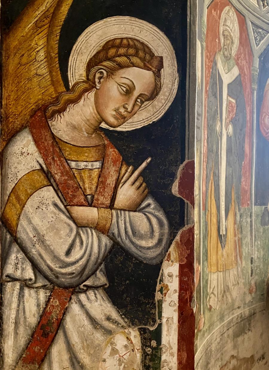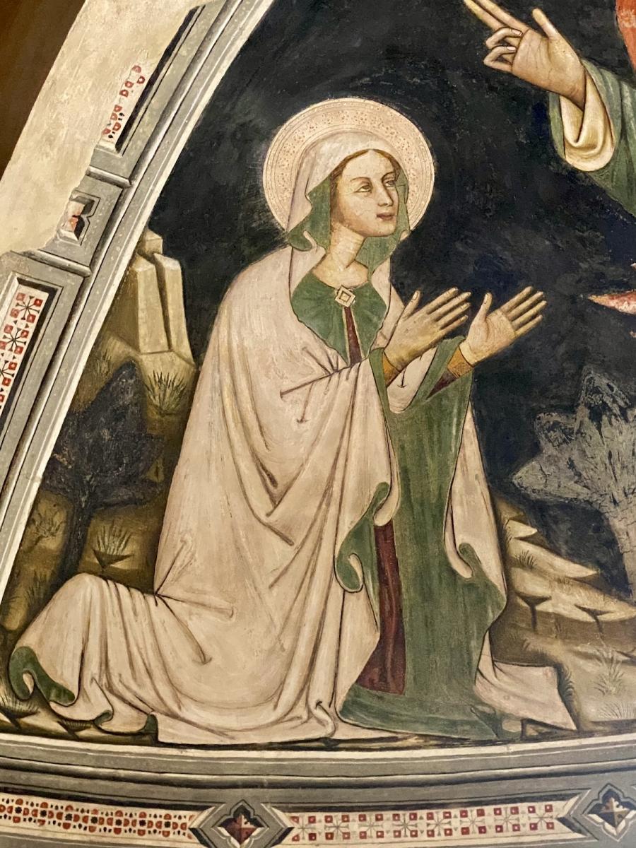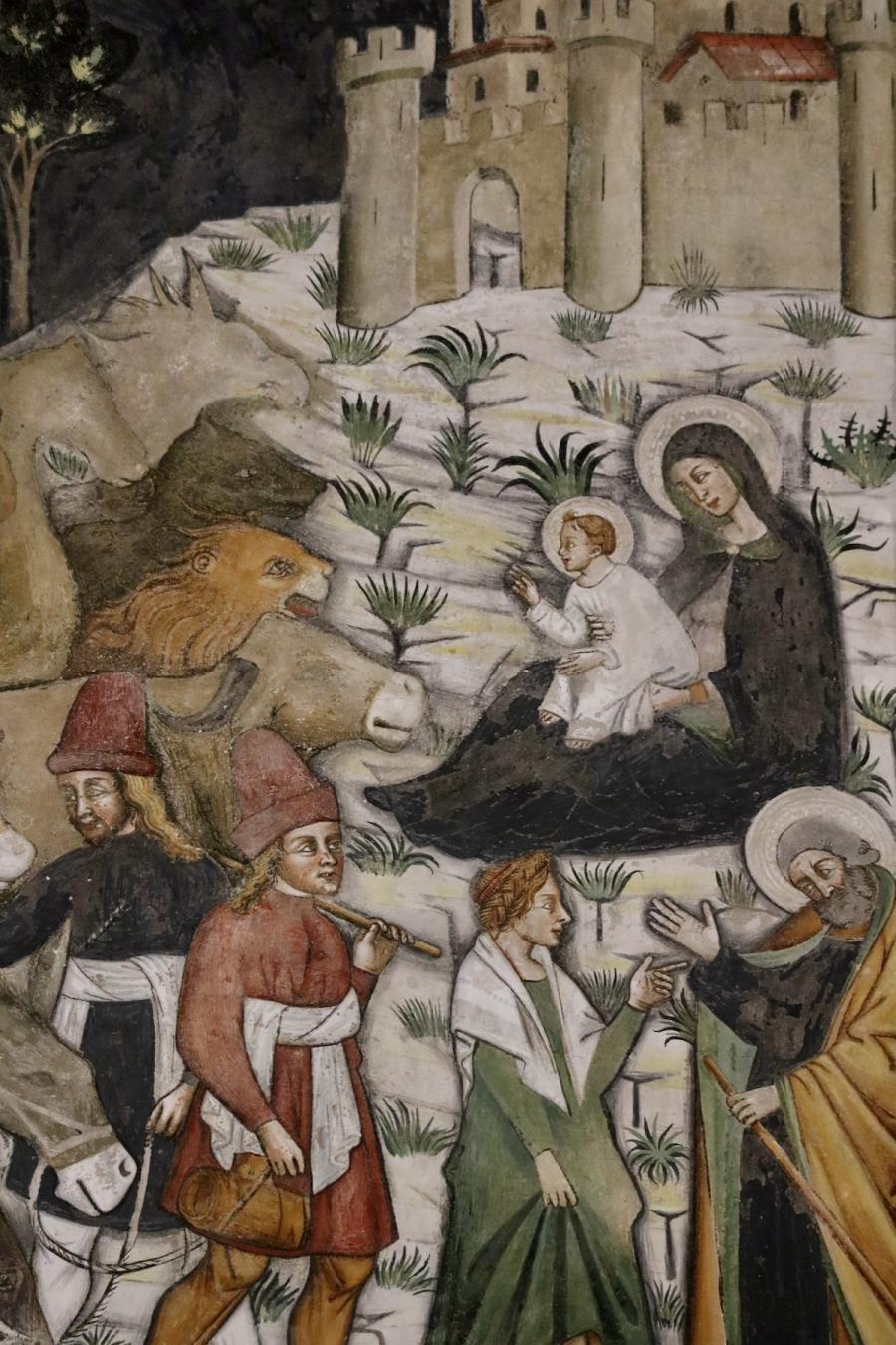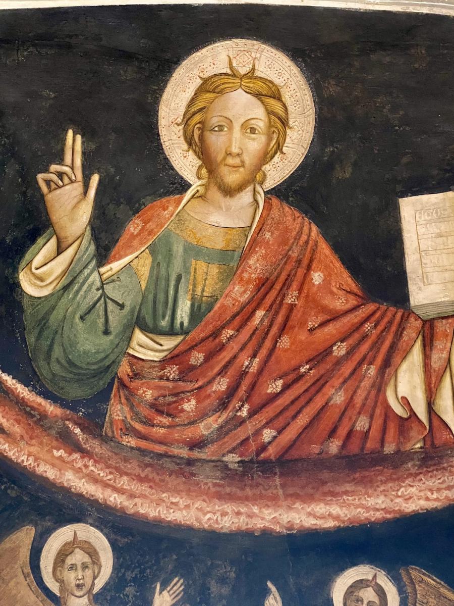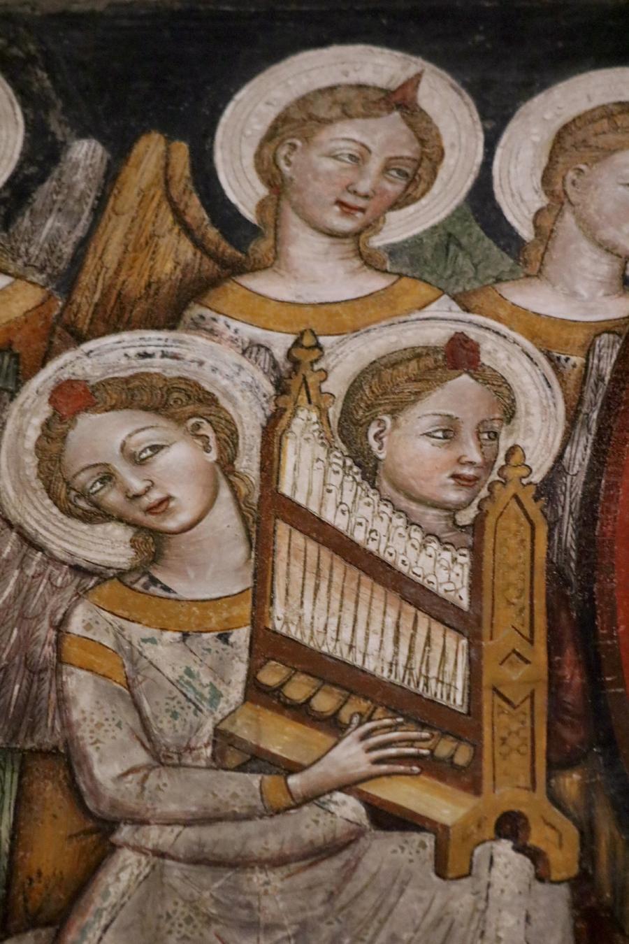 Hier stockt mir erstmal der Atem: Denn was es hier, in dieser 1391 fertiggestellten Kirche, zu sehen gibt, wirft mich um. Der fünfschiffige Innenraum ist fast über und über freskiert, das Auge gleitet erst mal über alles hinweg und versucht dann irgendwo einen Anfang zu finden. Aber wo beginnen, wo enden mit dem Lesen der unzähligen Geschichten, die diese bunten, beeindruckenden Fresken erzählen? Ich starte schließlich im ersten Schiff mit Szenen aus der Apokalypse, gefolgt von den Geschichten der Genesis (im zweiten Schiff). Eine eindeutige Engelsdominanz stelle ich im Gewölbe des dritten Schiffs fest. Besonders schön finde ich den Freskenzyklus an den Wänden des Chors: Dieser ist dem Leben meiner Namensvetterin Katharina von Alexandrien gewidmet. Und noch ein Highlight finde ich dann: Die besonders eindrücklichen Mariengeschichten an den Wänden im rechten Seitenschiff. Eine Antwort auf die Frage, warum die Kirche der heiligen Katharina von Alessandria gewidmet ist, habe ich schließlich auch noch gefunden: Ein (angeblicher) Finger der Heiligen wird bis heute als Reliquie in einem silbernen Reliquienschrein in der Schatzkammer der Kirche, im angeschlossenen Museum, aufbewahrt.