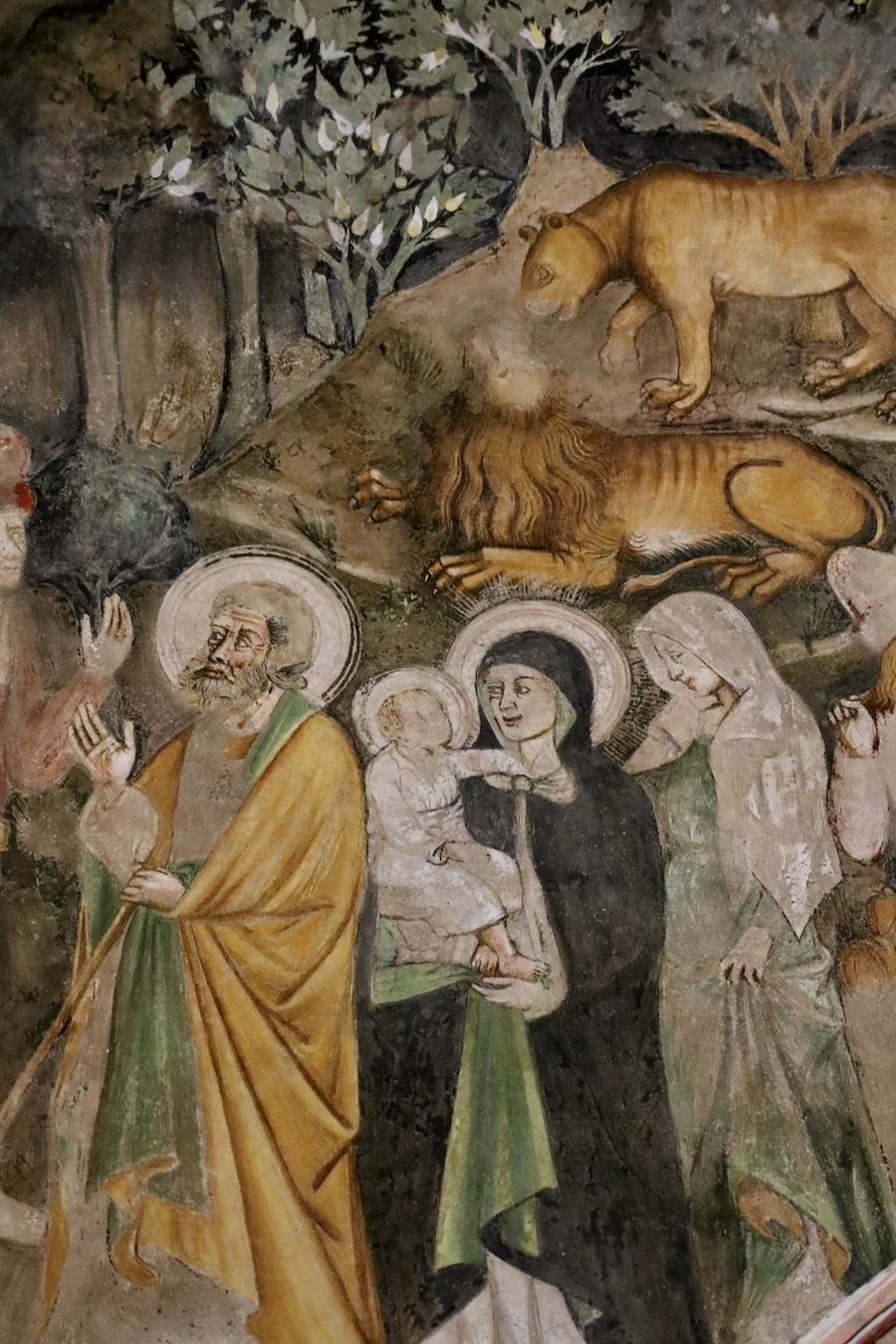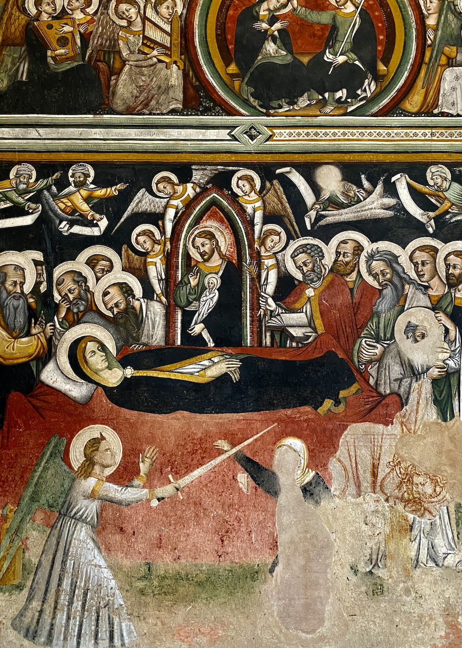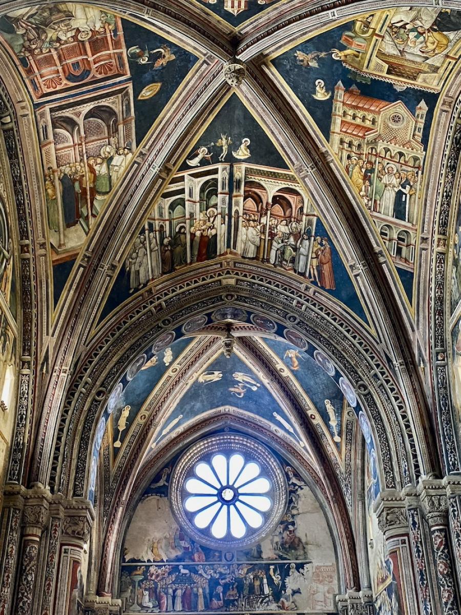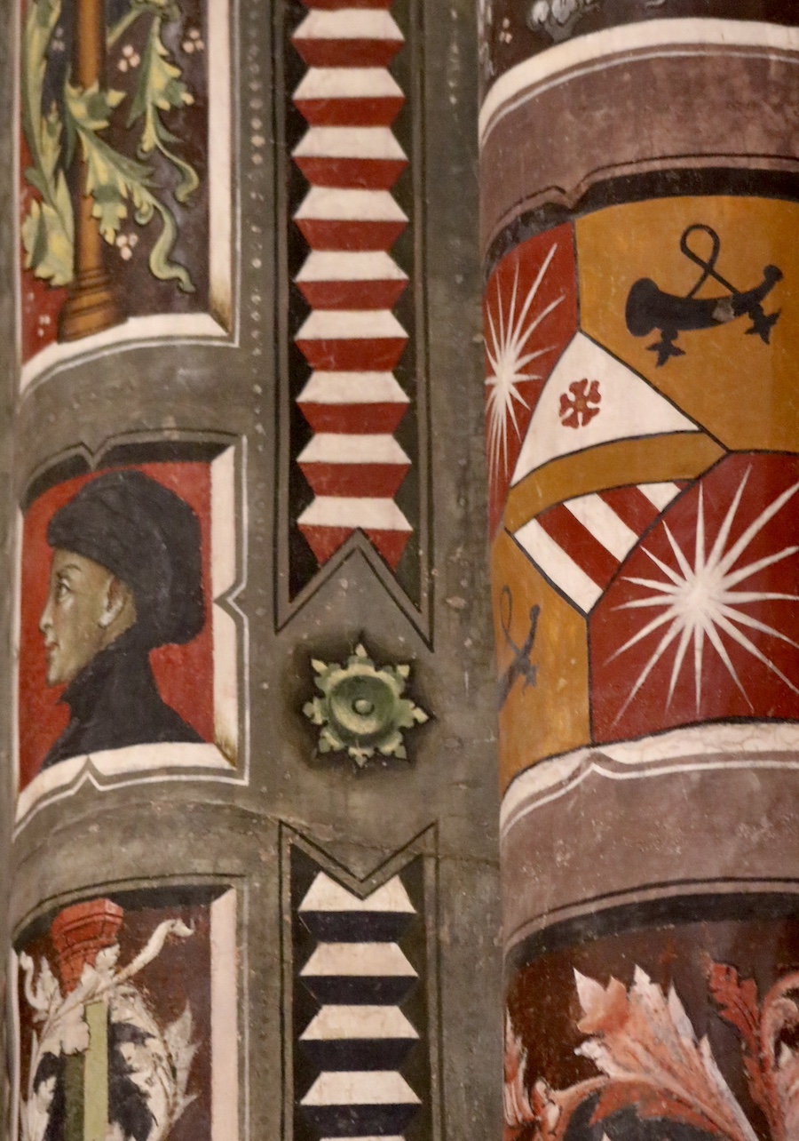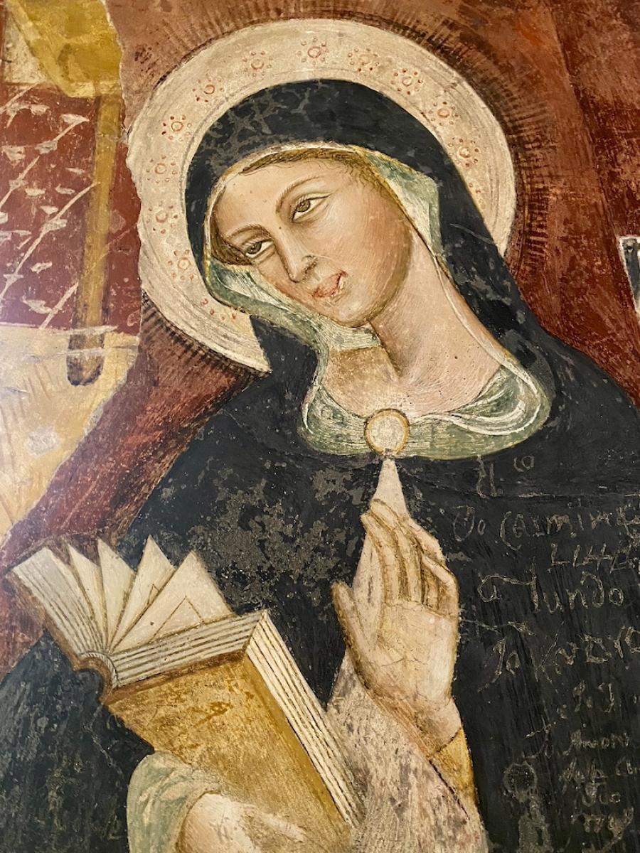 Hier stockt mir erstmal der Atem: Denn was es hier, in dieser 1391 fertiggestellten Kirche, zu sehen gibt, wirft mich um. Der fünfschiffige Innenraum ist fast über und über freskiert, das Auge gleitet erst mal über alles hinweg und versucht dann irgendwo einen Anfang zu finden. Aber wo beginnen, wo enden mit dem Lesen der unzähligen Geschichten, die diese bunten, beeindruckenden Fresken erzählen? Ich starte schließlich im ersten Schiff mit Szenen aus der Apokalypse, gefolgt von den Geschichten der Genesis (im zweiten Schiff). Eine eindeutige Engelsdominanz stelle ich im Gewölbe des dritten Schiffs fest. Besonders schön finde ich den Freskenzyklus an den Wänden des Chors: Dieser ist dem Leben meiner Namensvetterin Katharina von Alexandrien gewidmet. Und noch ein Highlight finde ich dann: Die besonders eindrücklichen Mariengeschichten an den Wänden im rechten Seitenschiff. Eine Antwort auf die Frage, warum die Kirche der heiligen Katharina von Alessandria gewidmet ist, habe ich schließlich auch noch gefunden: Ein (angeblicher) Finger der Heiligen wird bis heute als Reliquie in einem silbernen Reliquienschrein in der Schatzkammer der Kirche, im angeschlossenen Museum, aufbewahrt.