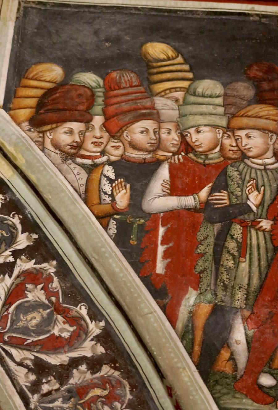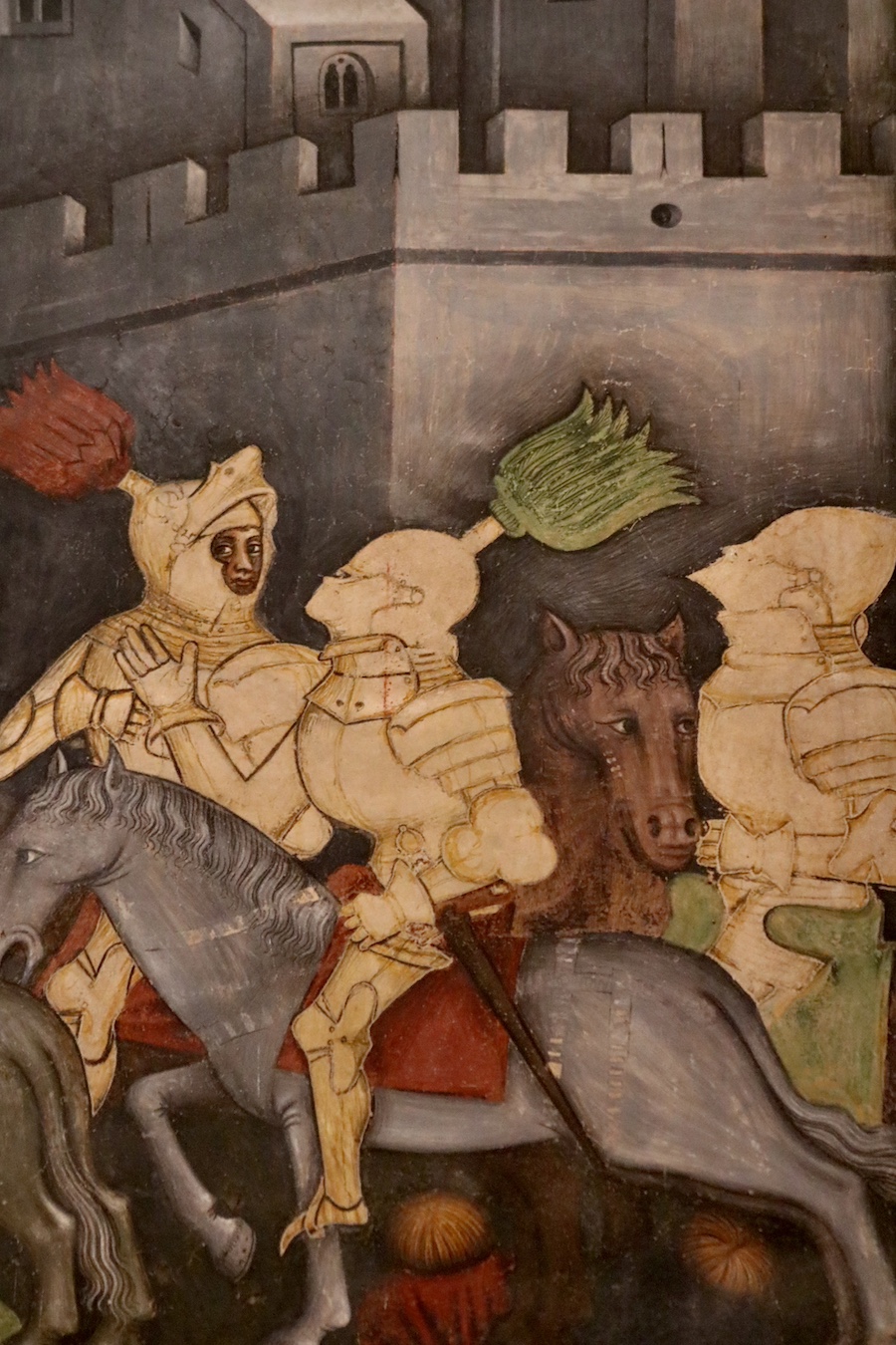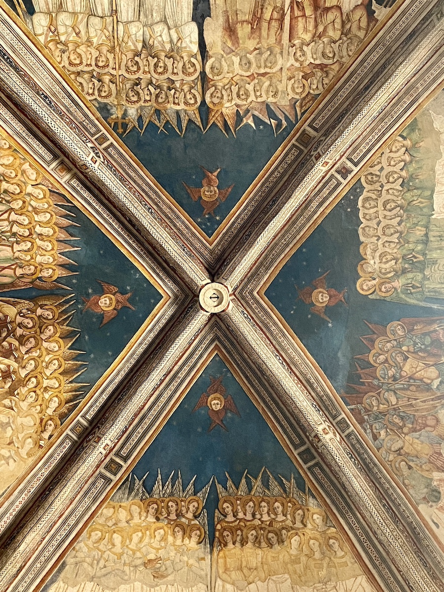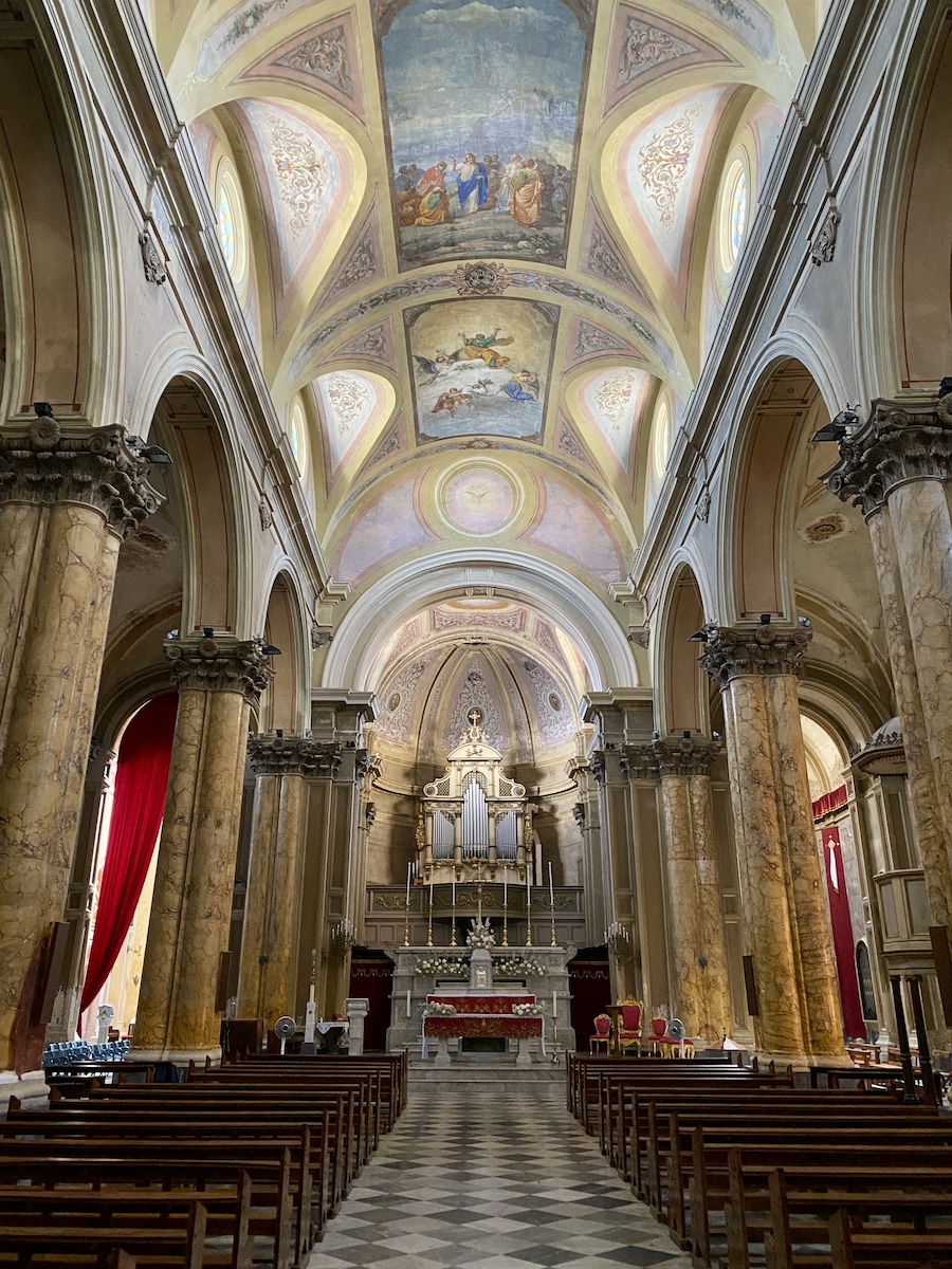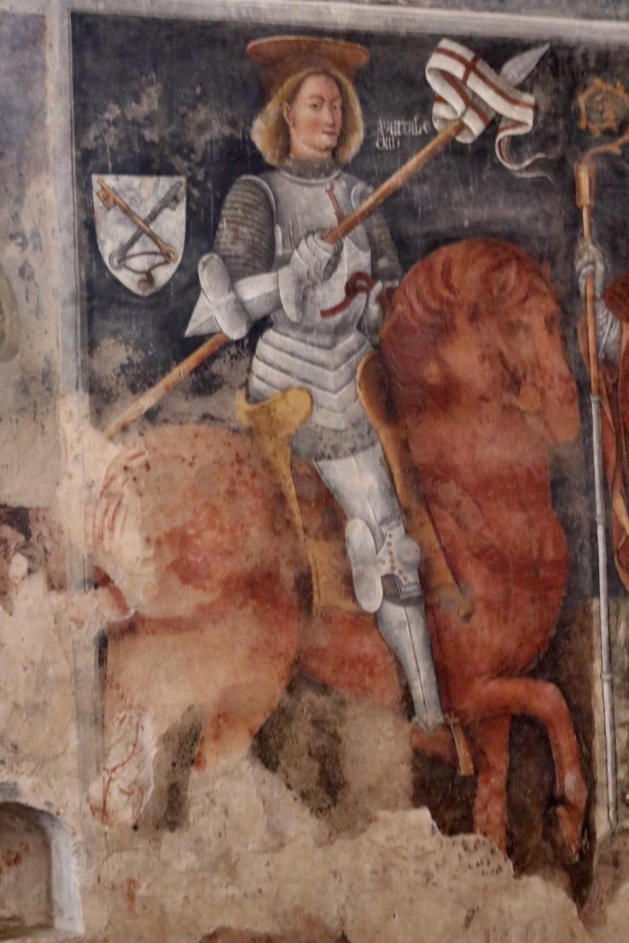 Hier stockt mir erstmal der Atem: Denn was es hier, in dieser 1391 fertiggestellten Kirche, zu sehen gibt, wirft mich um. Der fünfschiffige Innenraum ist fast über und über freskiert, das Auge gleitet erst mal über alles hinweg und versucht dann irgendwo einen Anfang zu finden. Aber wo beginnen, wo enden mit dem Lesen der unzähligen Geschichten, die diese bunten, beeindruckenden Fresken erzählen? Ich starte schließlich im ersten Schiff mit Szenen aus der Apokalypse, gefolgt von den Geschichten der Genesis (im zweiten Schiff). Eine eindeutige Engelsdominanz stelle ich im Gewölbe des dritten Schiffs fest. Besonders schön finde ich den Freskenzyklus an den Wänden des Chors: Dieser ist dem Leben meiner Namensvetterin Katharina von Alexandrien gewidmet. Und noch ein Highlight finde ich dann: Die besonders eindrücklichen Mariengeschichten an den Wänden im rechten Seitenschiff. Eine Antwort auf die Frage, warum die Kirche der heiligen Katharina von Alessandria gewidmet ist, habe ich schließlich auch noch gefunden: Ein (angeblicher) Finger der Heiligen wird bis heute als Reliquie in einem silbernen Reliquienschrein in der Schatzkammer der Kirche, im angeschlossenen Museum, aufbewahrt.